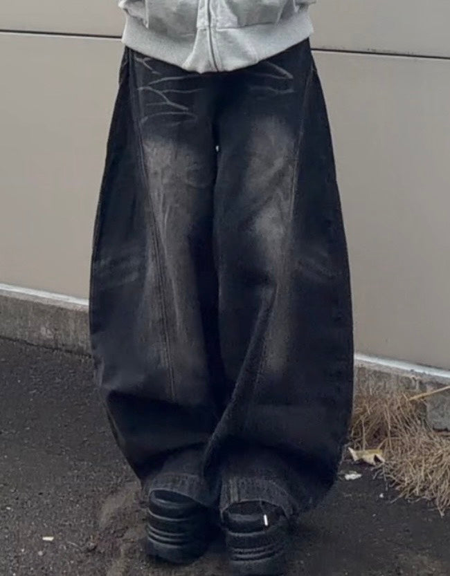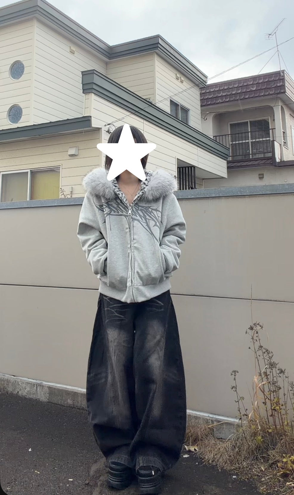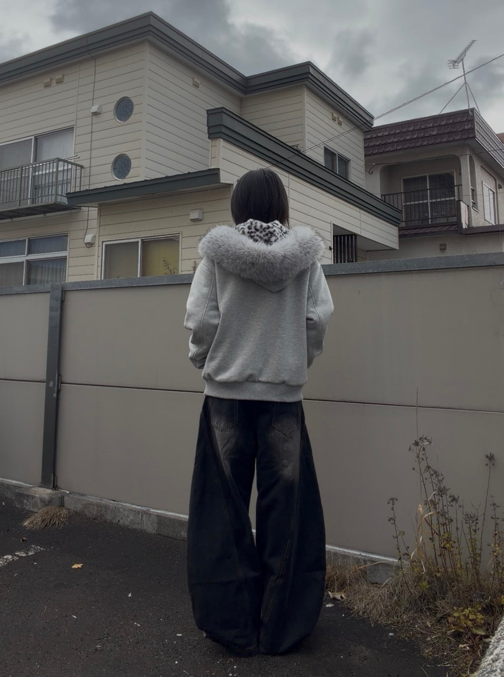 ヴィンテージウォッシュの奥行きある色味と、思いきったワイドカーブのシルエットが主役。トップスはあえてシンプルなグレーパーカーで引き算して、パンツの存在感をしっかり活かしました。歩くたびに丸みが揺れる独特のラインが可愛くて、シンプルでも雰囲気のあるスタイルに仕上がります。