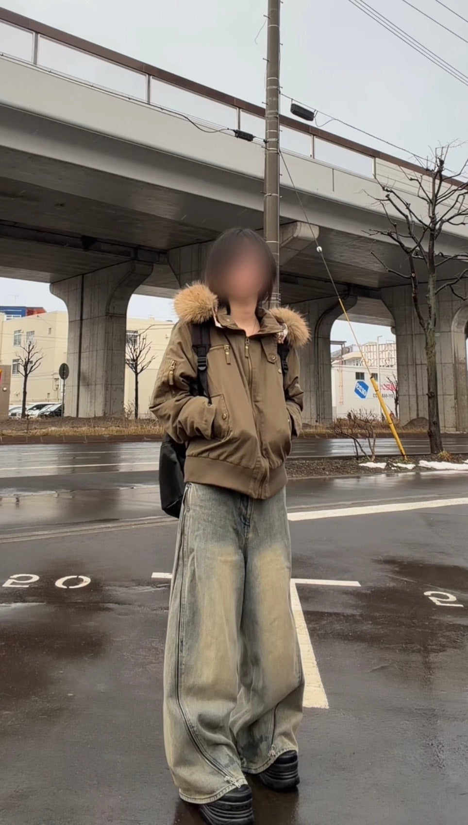 あえてワイドデニムで重心を下げて、アウターの短丈シルエットを強調しました。