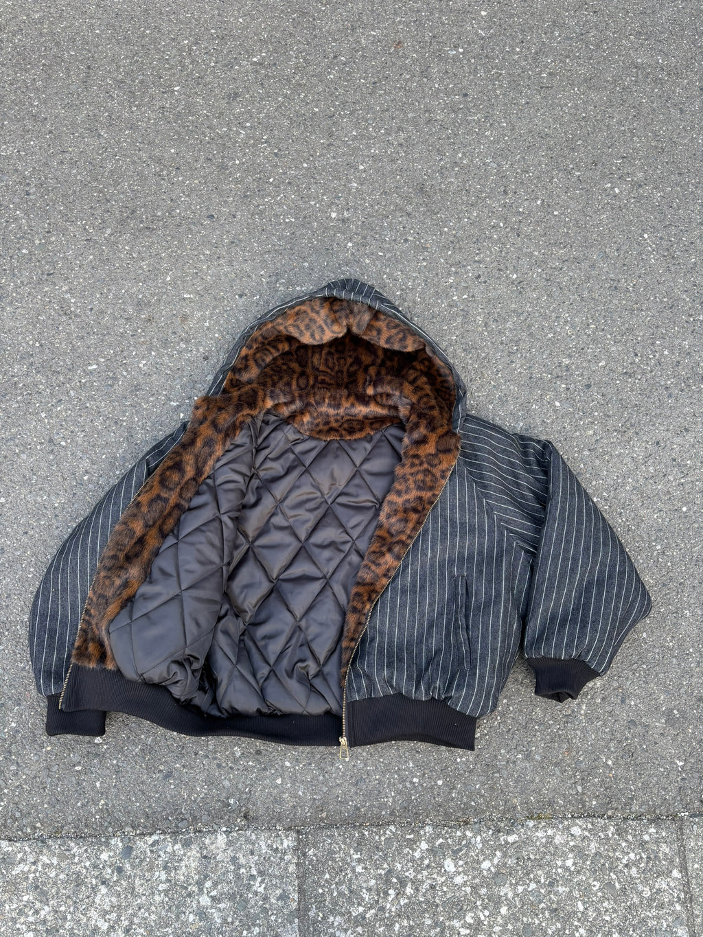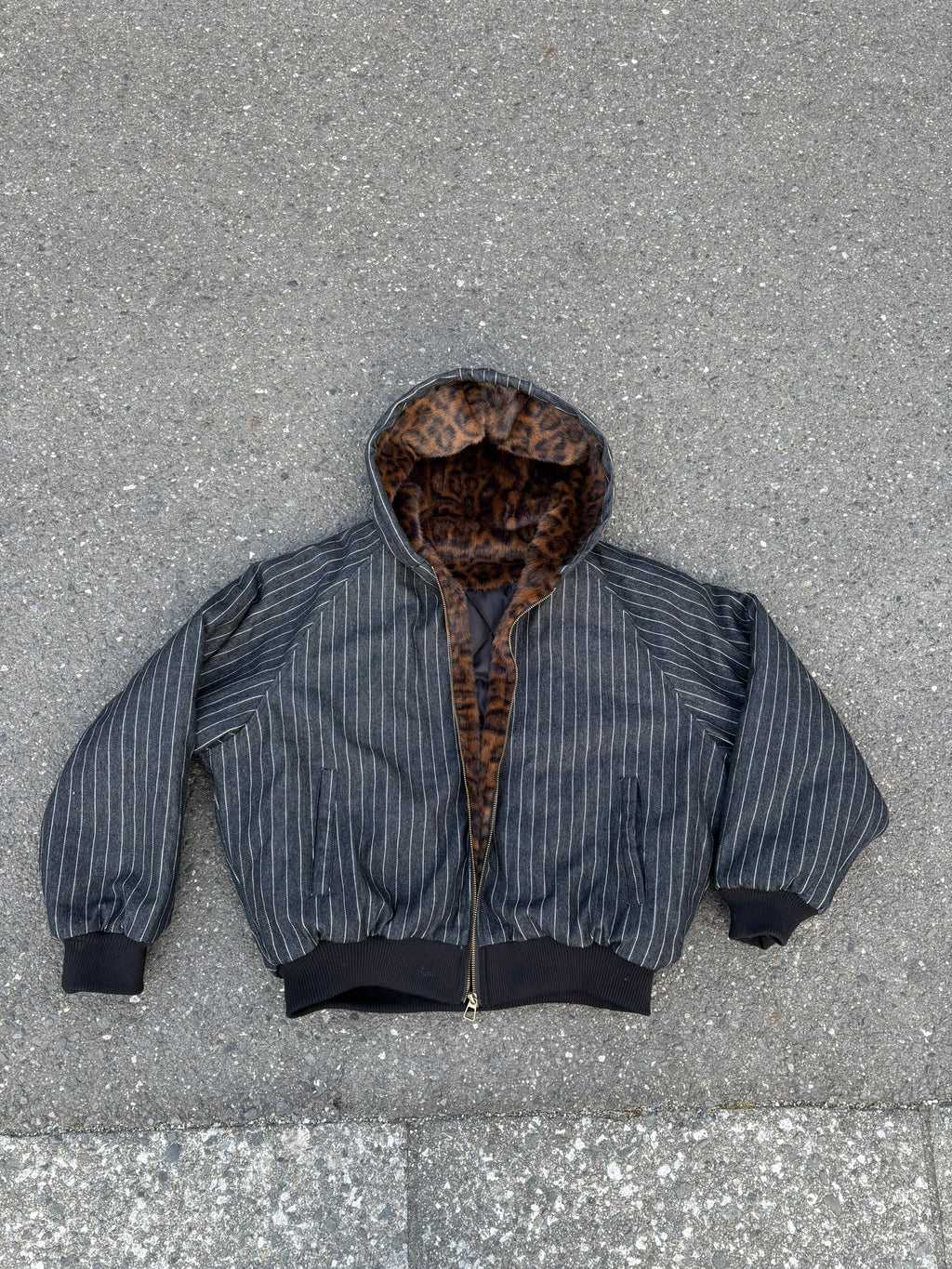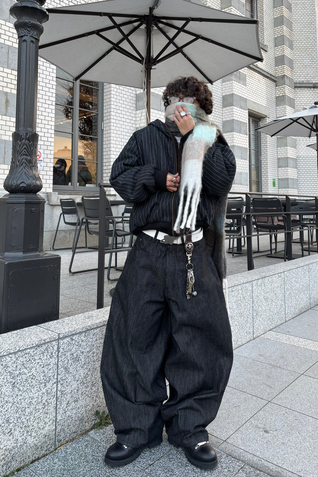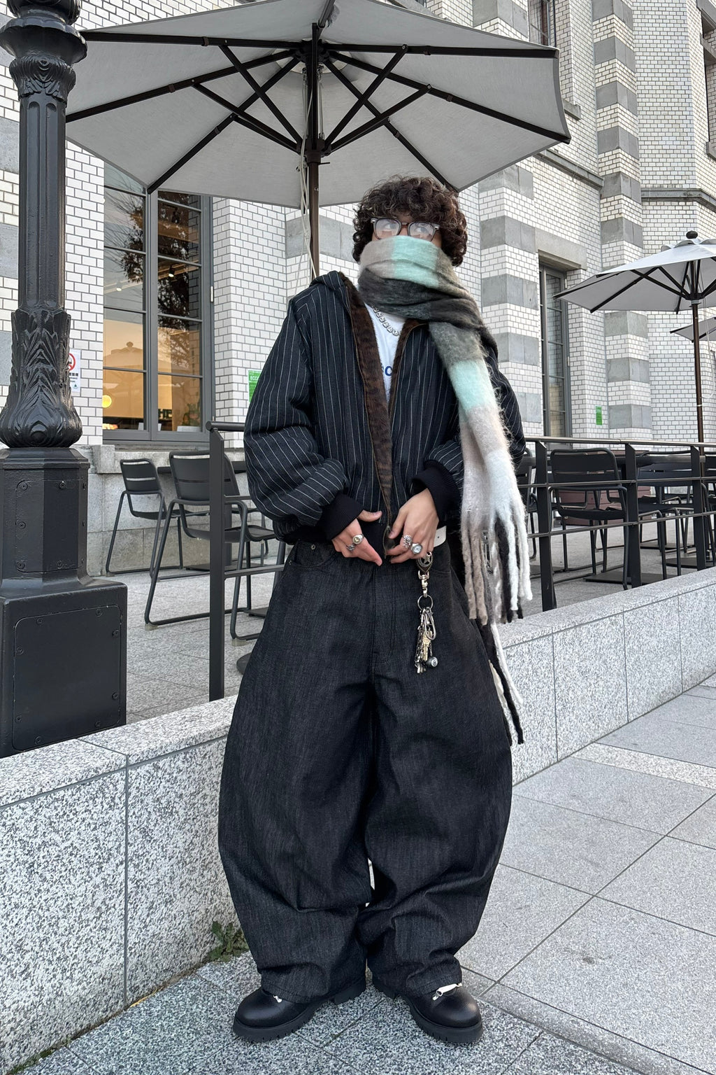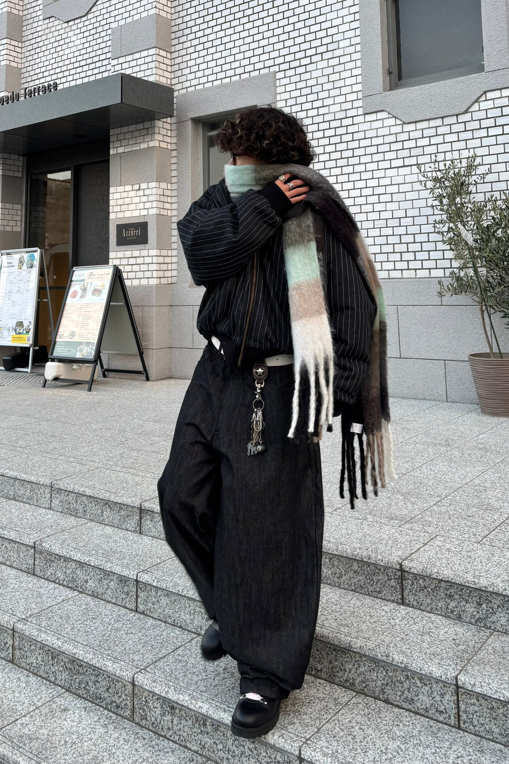 レオパードライナーの程よい毒っ気を、ストライプで中和しながら遊んでます。中綿で暖かいのに重たく見えないのが好きで、ワイドパンツと合わせるとシルエットの緩急が出てちょうどいい。首元は大判マフラーでボリュームを足してバランスを取っています。