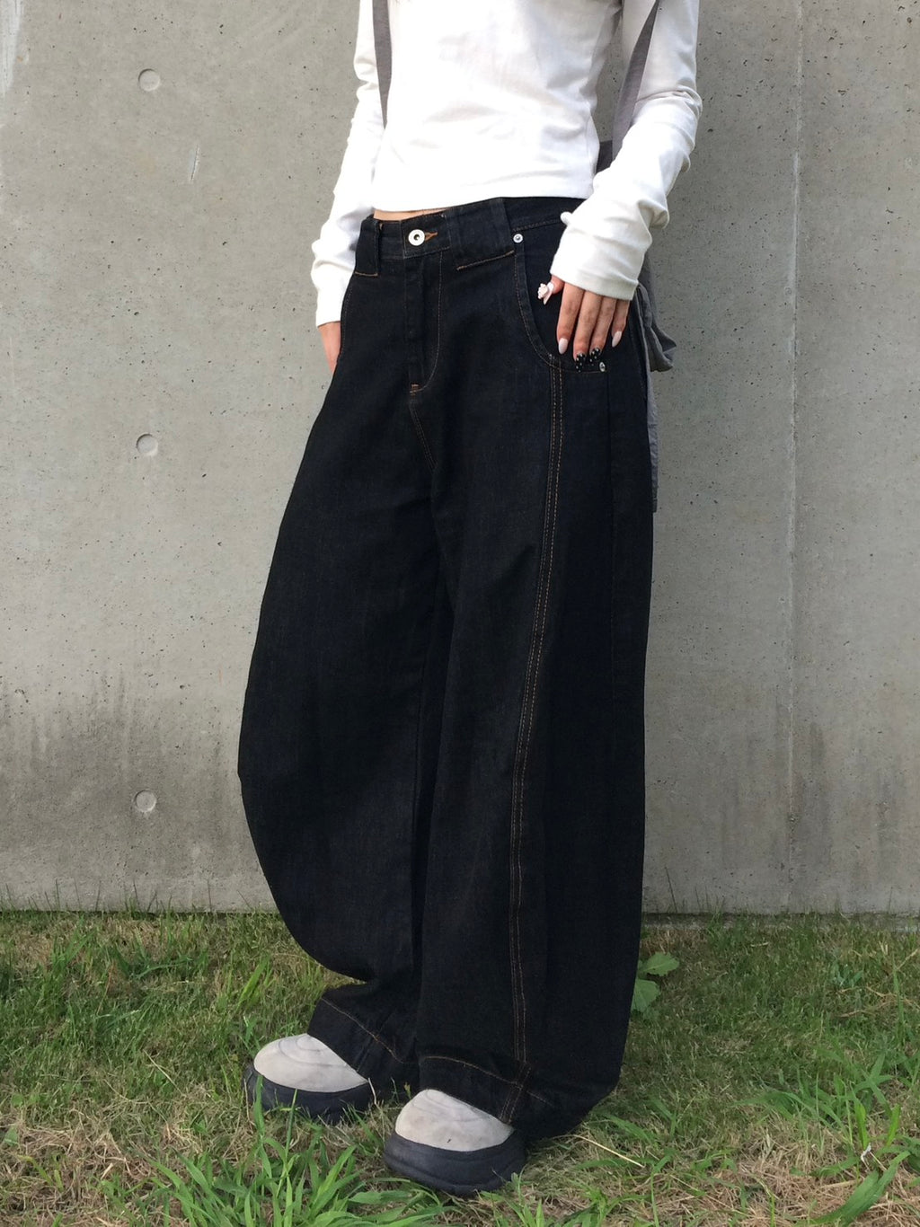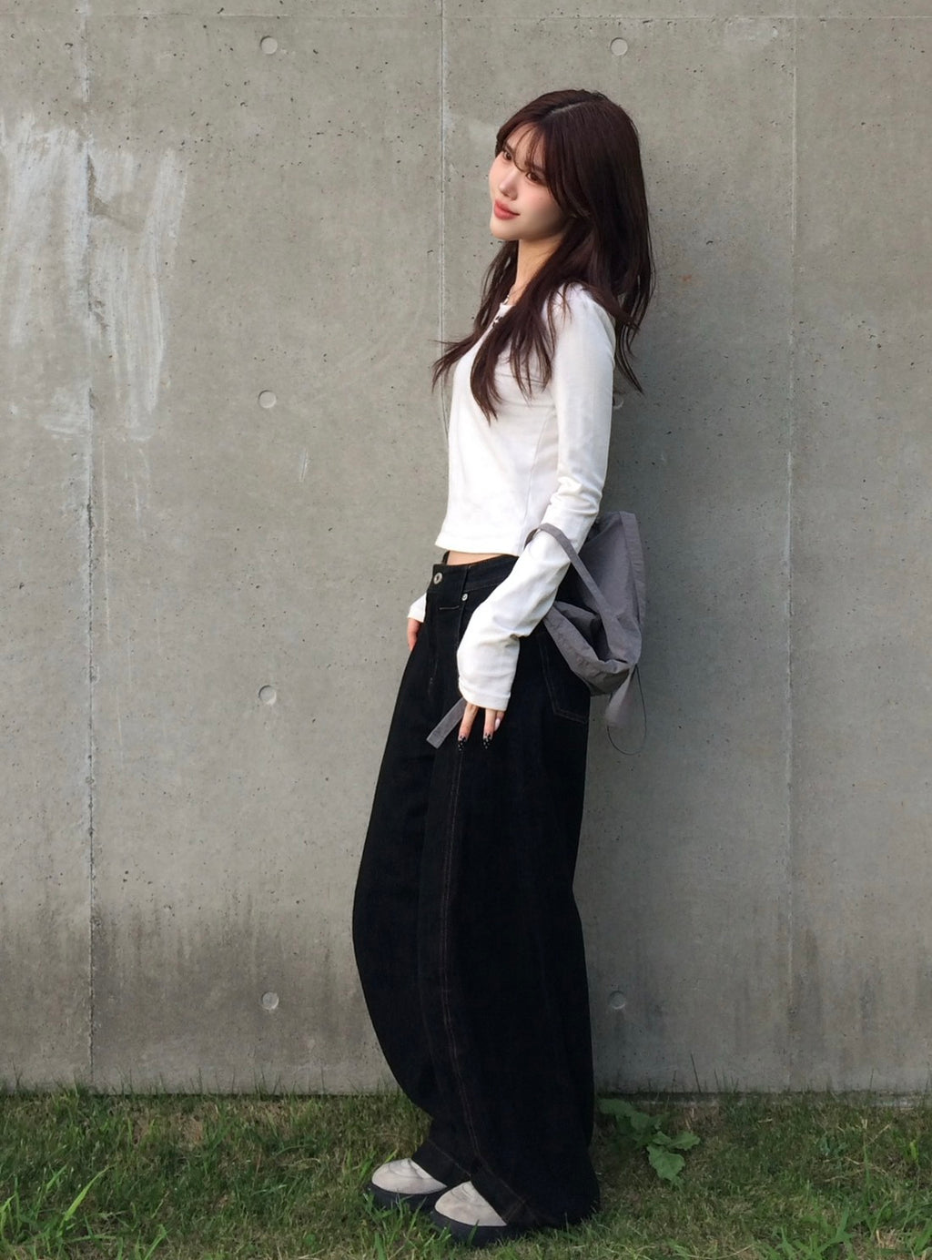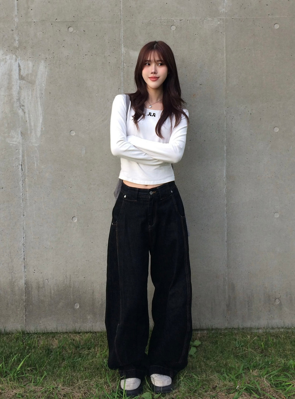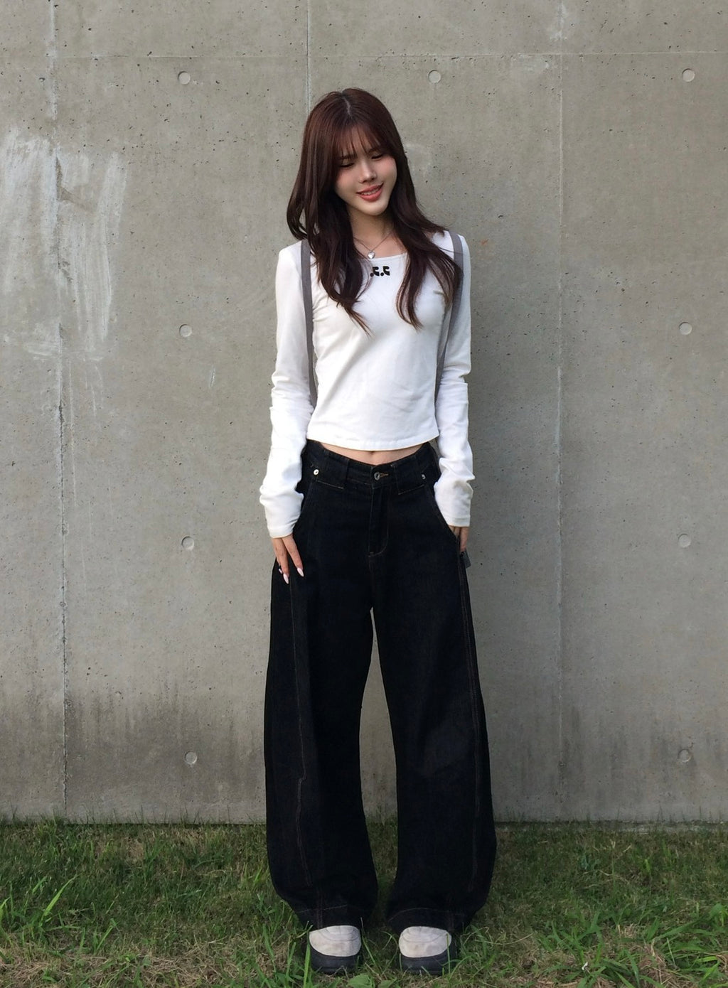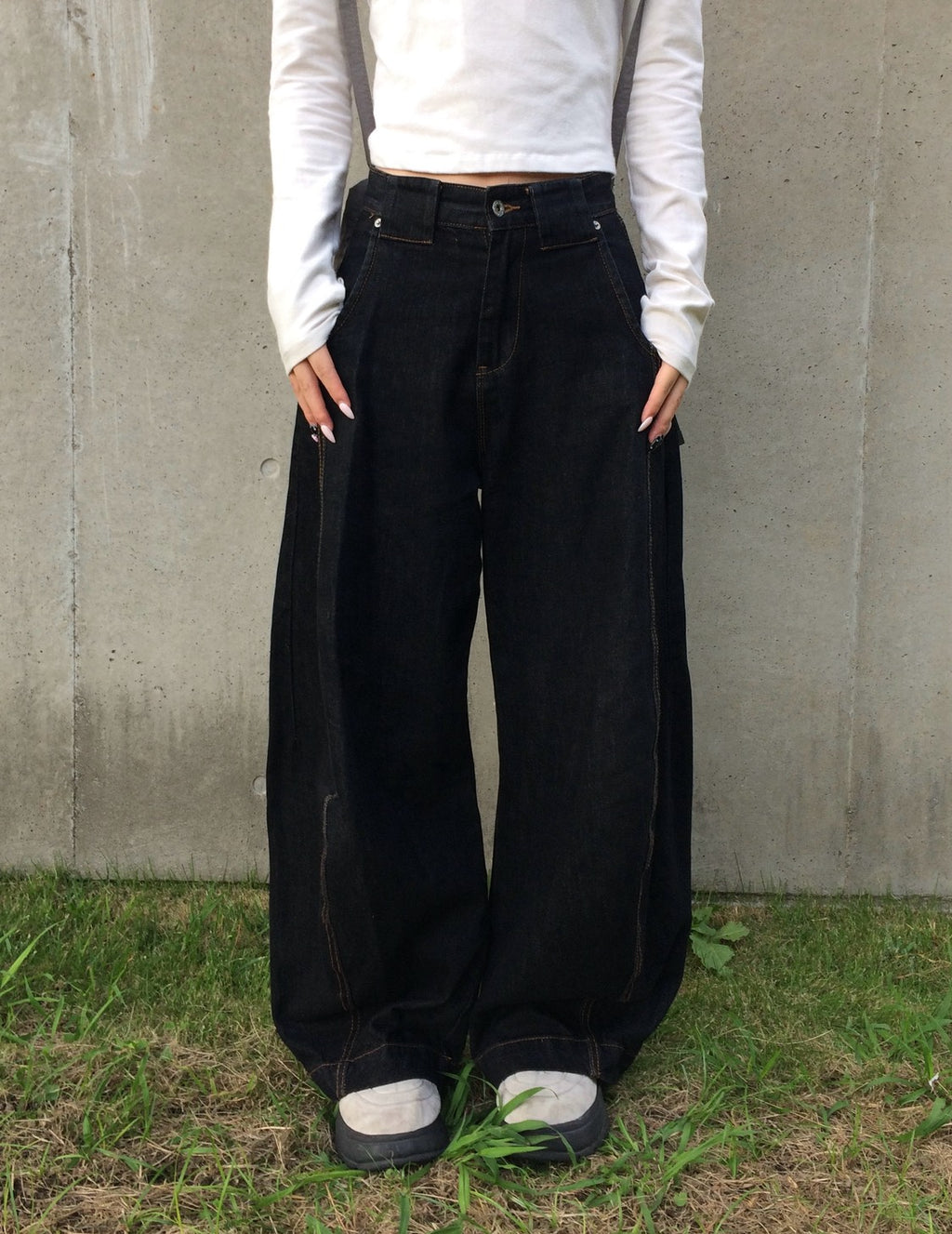 シルエットとディテールが美しいこのパンツは、トレンドのY2K × ミニマルストリートを代表する一本。ワイドながらも立体的なカーブラインが脚をきれいに見せ、ダボッと感と美脚ラインを両立しています。