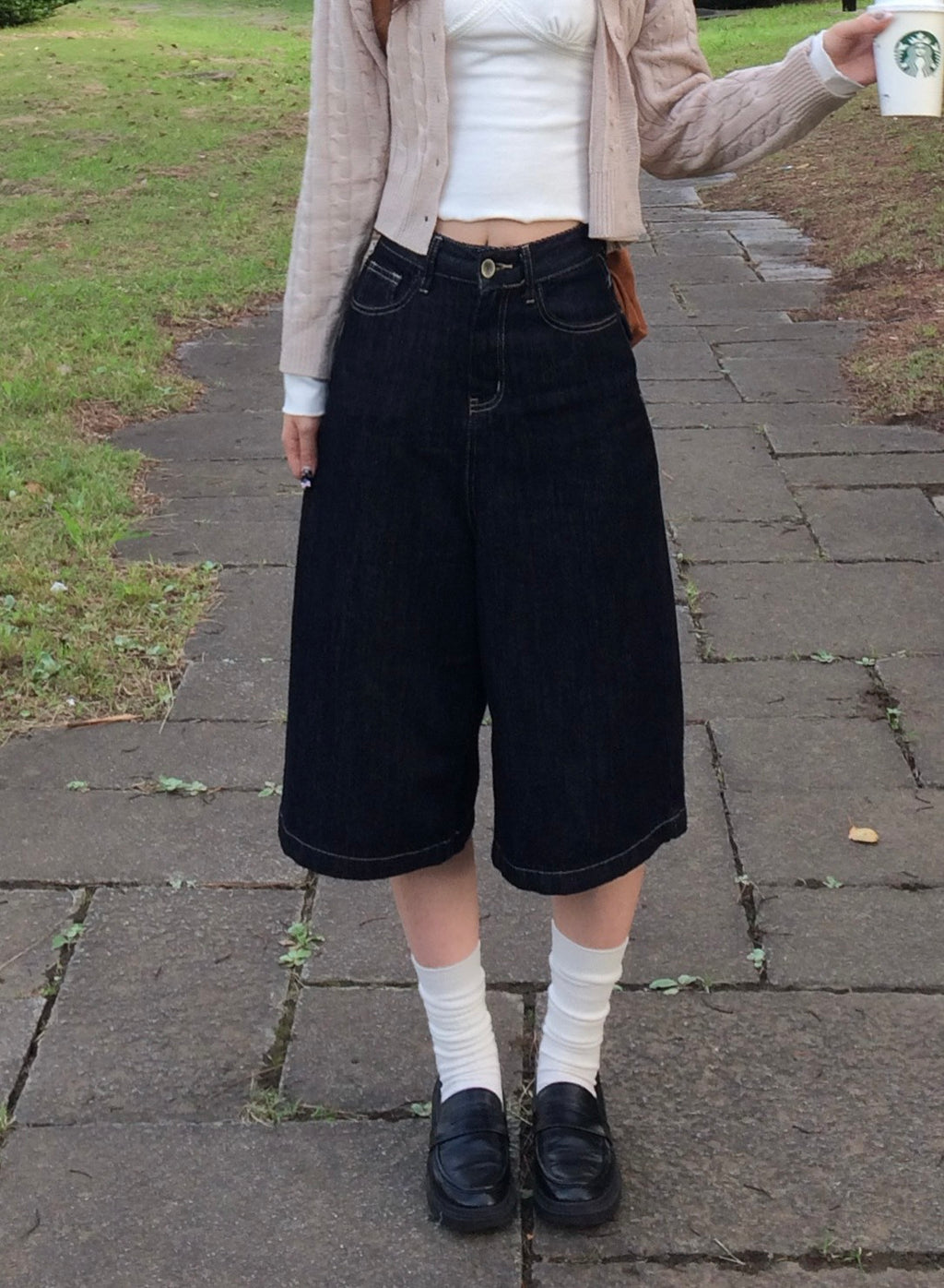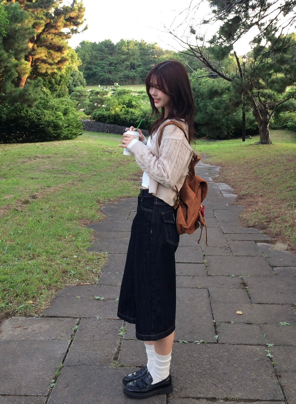 清楚で優しい印象のベージュ×ホワイトをベースに、ダークインディゴのデニムショーツが全体を引き締めてくれる、秋の公園デートやお出かけにぴったりのスタイルです🍂