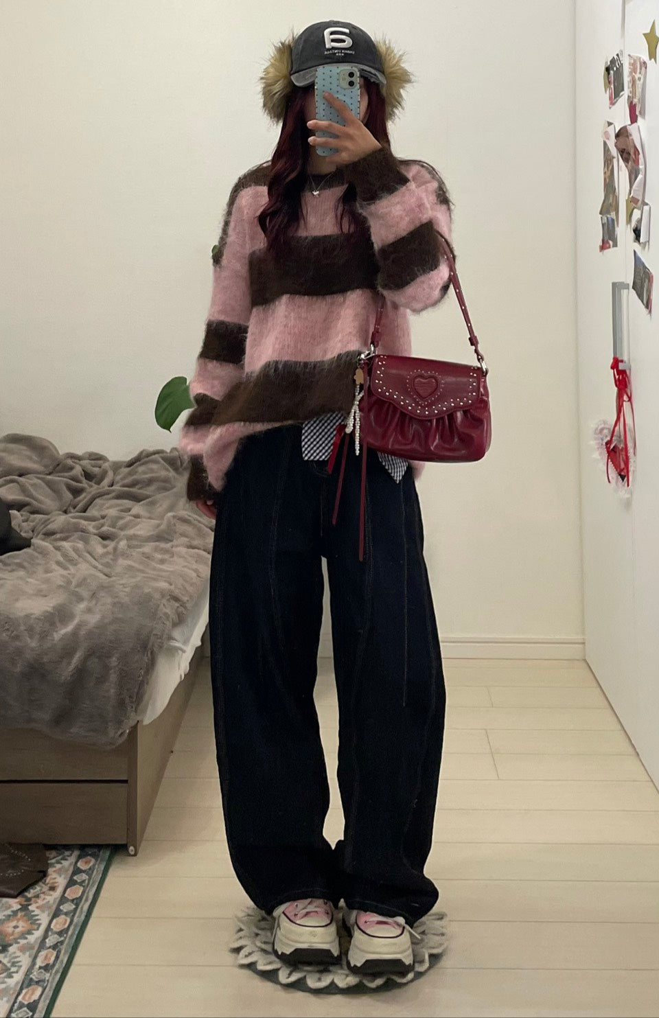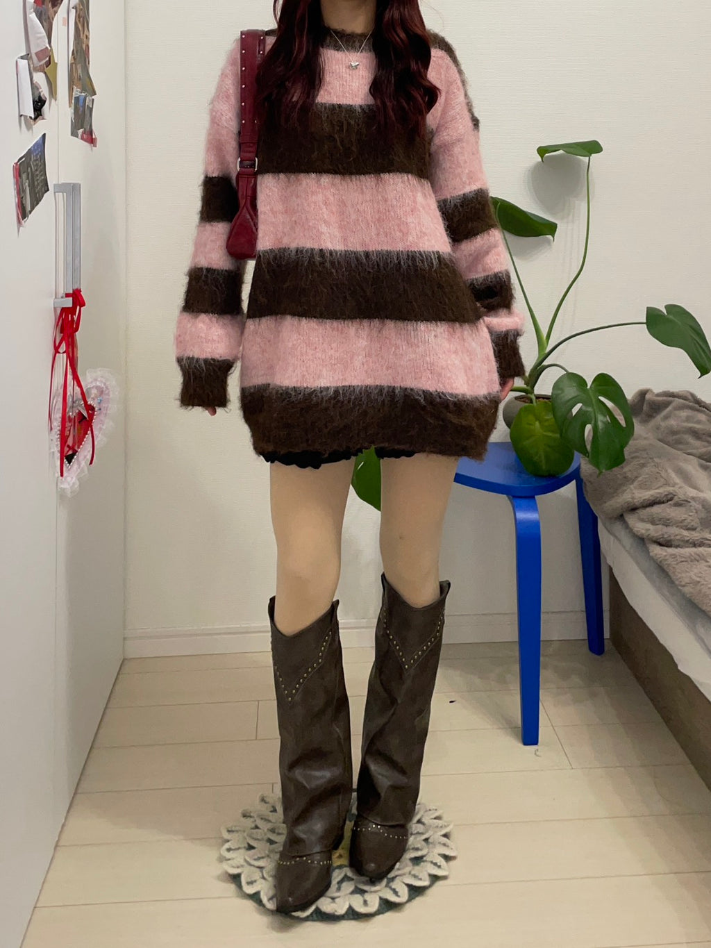 モヘアのふんわりとした起毛感が魅力のボーダーオーバーサイズニット。甘さのあるピンク×ブラウン配色で、1枚で主役になる存在感。ゆったりしたシルエットが抜け感を演出し、ミニ丈からワイドパンツまで幅広く相性◎。秋冬のレイヤードにも活躍する、トレンド感たっぷりのアイテムです。