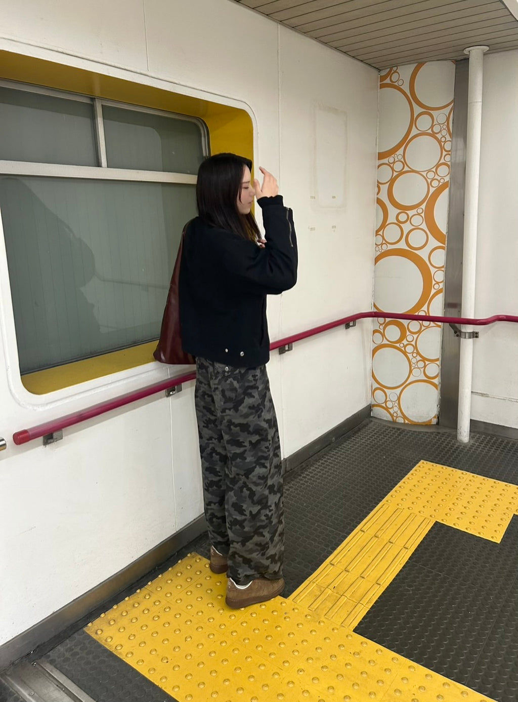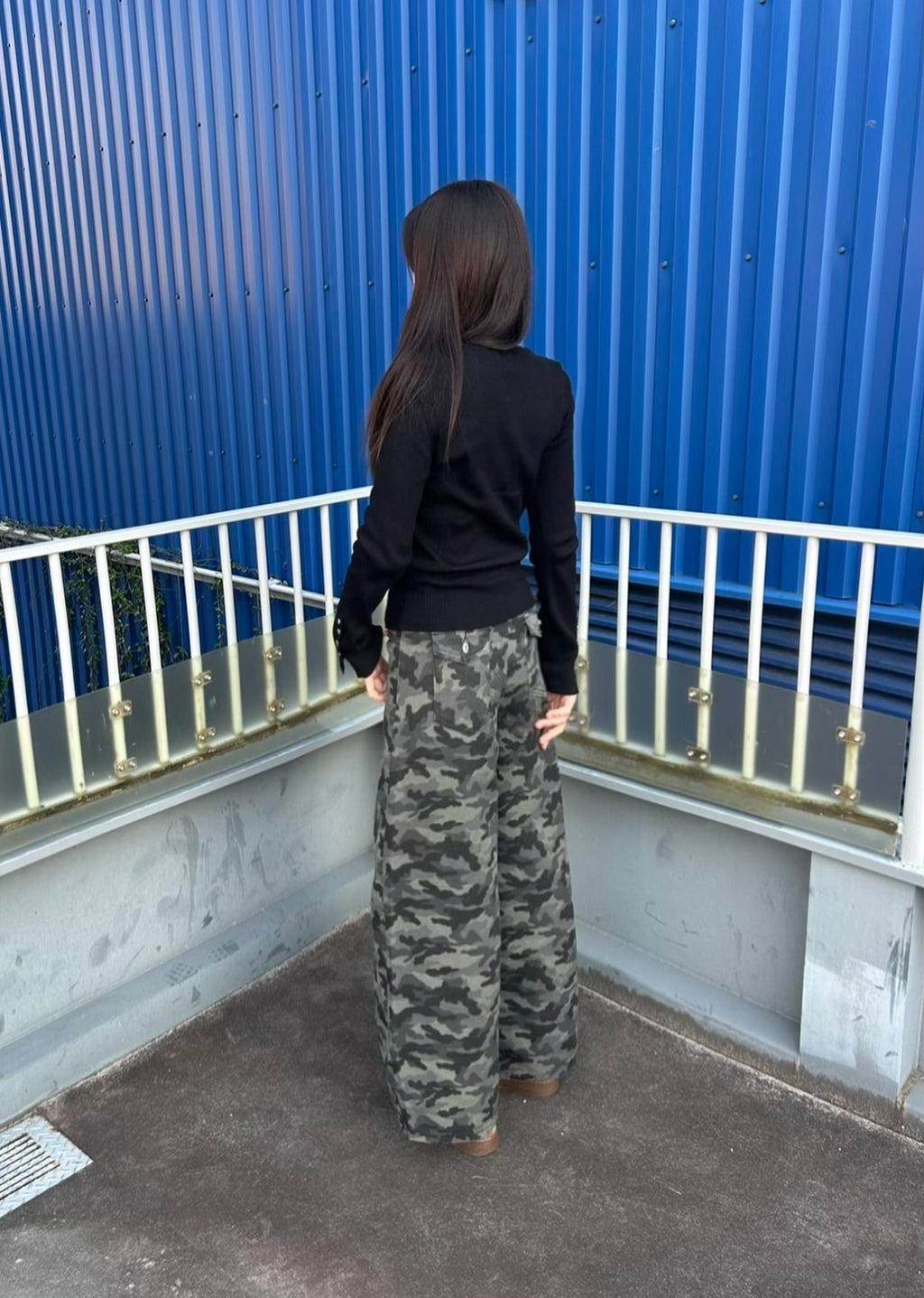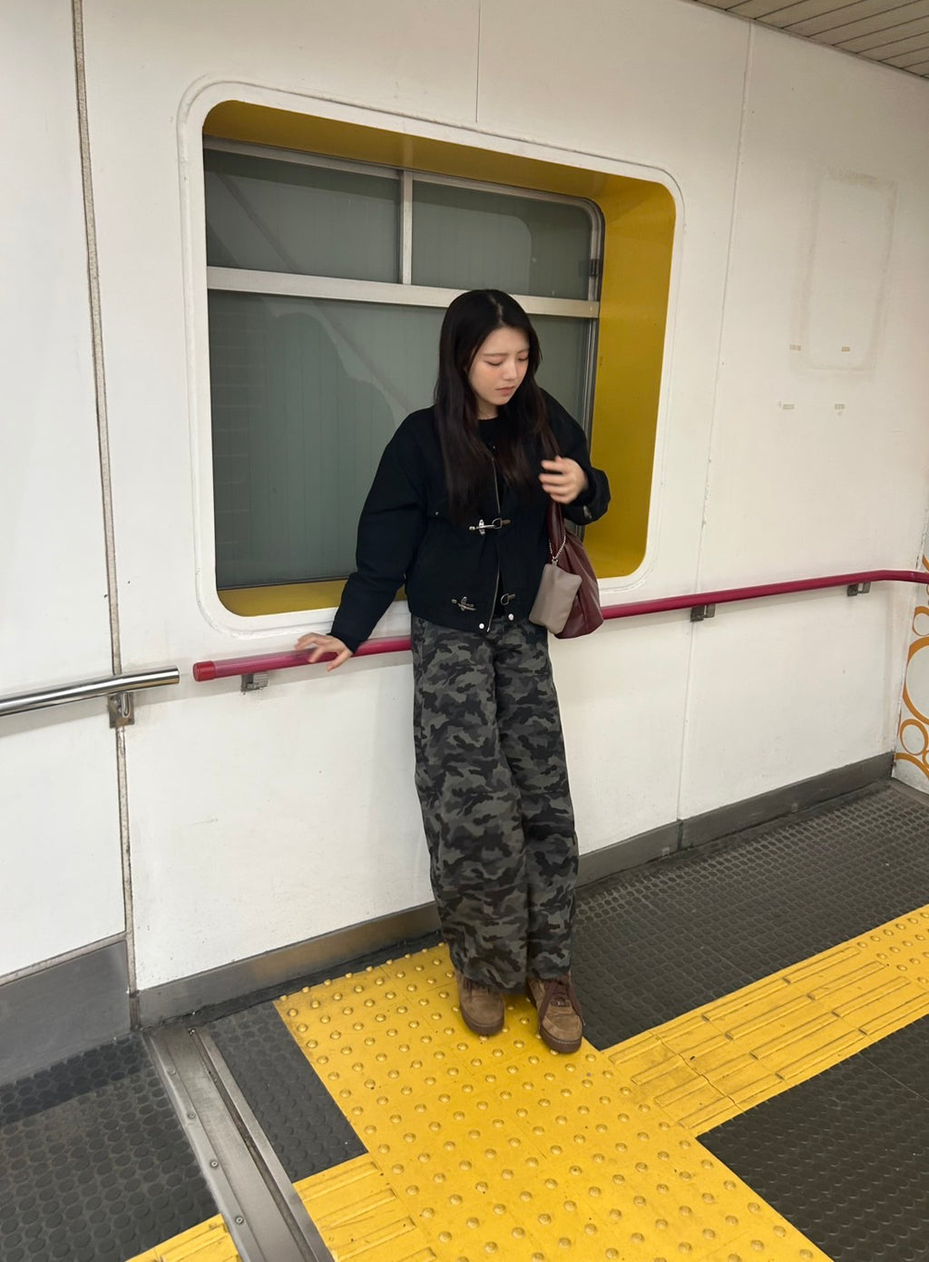 カモ柄でもハイウエスト×ワイドのシルエットだから重たく見えず、意外と上品にまとまるのが好き。トップスは黒で締めると柄がほどよく際立ってバランス◎。ゆるいのに脚長に見えるから、カジュアルに寄せたい日でもスタイルよく穿ける一本です。