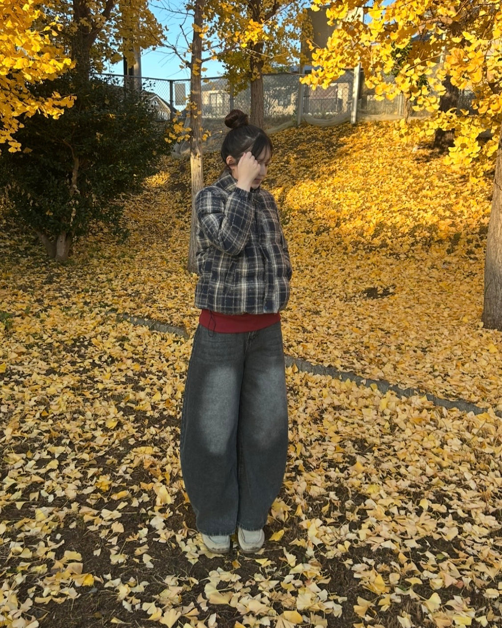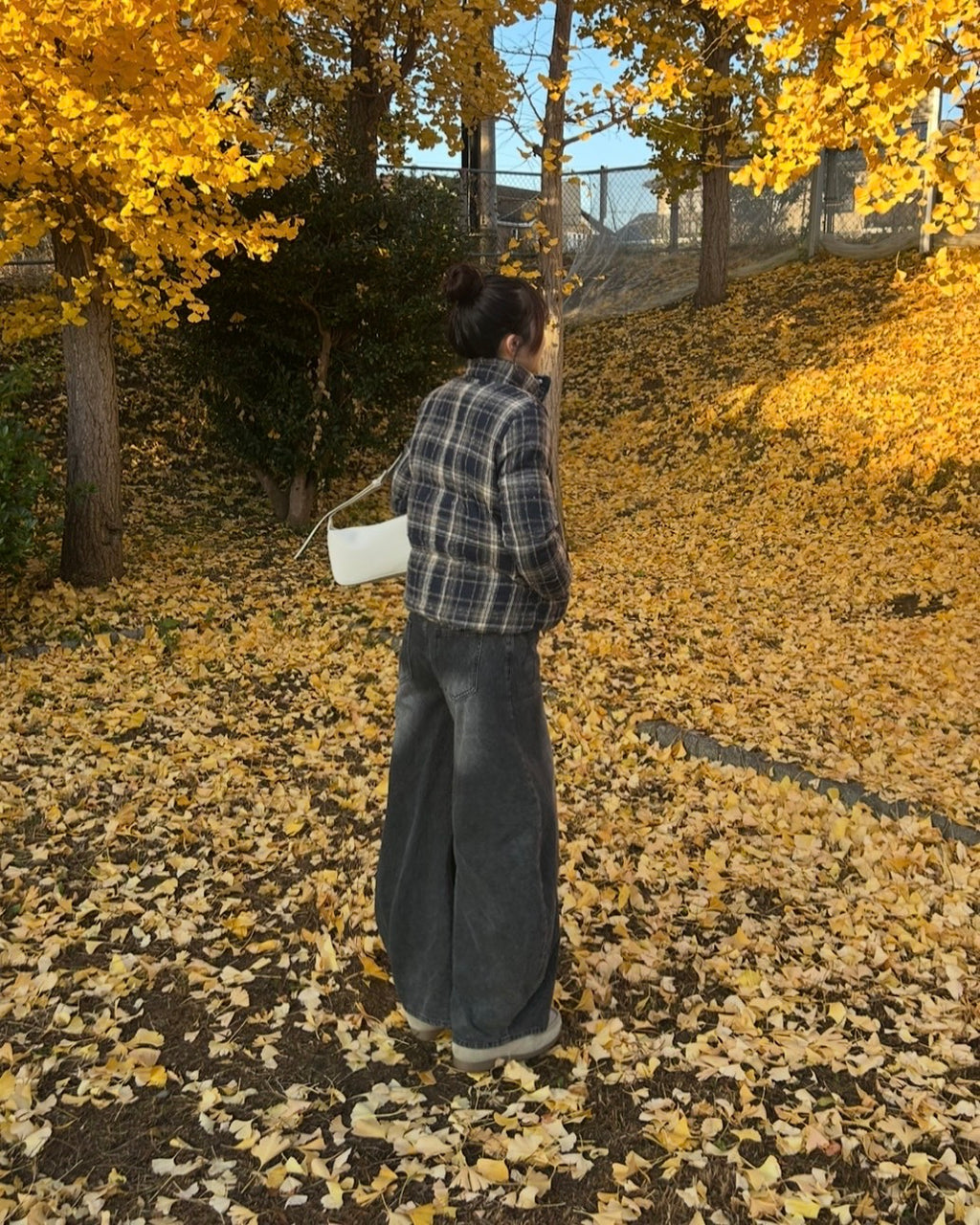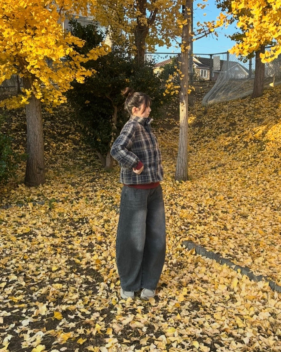 重たく見えがちなチェックのキルティングも、裾のドローコードでシルエットをぎゅっと引き締めてバランスを調整しています。ワイドデニムで抜け感を出しつつ、深みのある差し色をインナーに入れて季節感をプラス。落ち葉の景色にも映える、ほっこり大人カジュアルです。