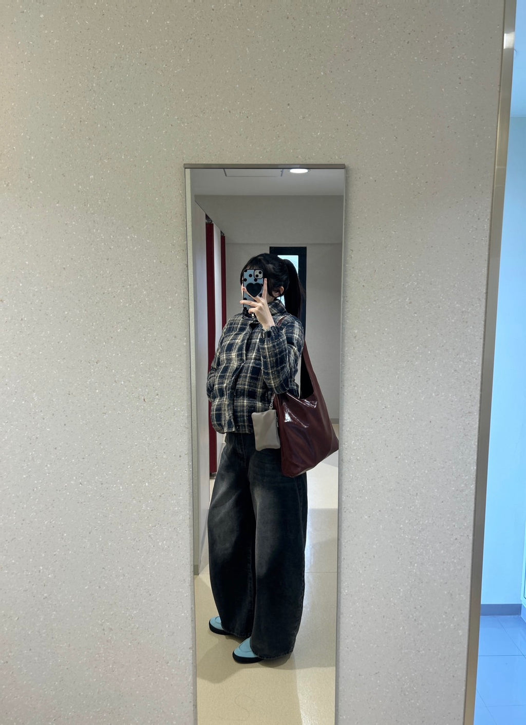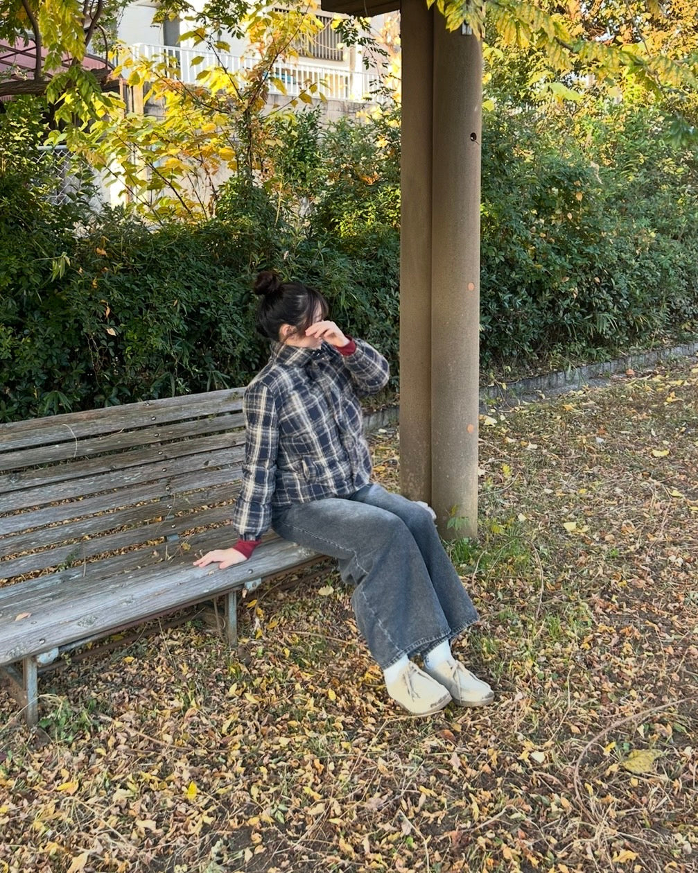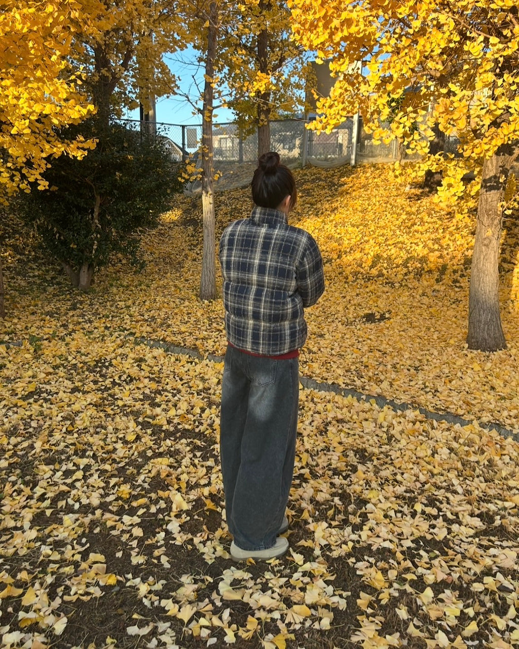 重たく見えがちなチェックのキルティングも、裾のドローコードでシルエットをぎゅっと引き締めてバランスを調整しています。ワイドデニムで抜け感を出しつつ、深みのある差し色をインナーに入れて季節感をプラス。落ち葉の景色にも映える、ほっこり大人カジュアルです。