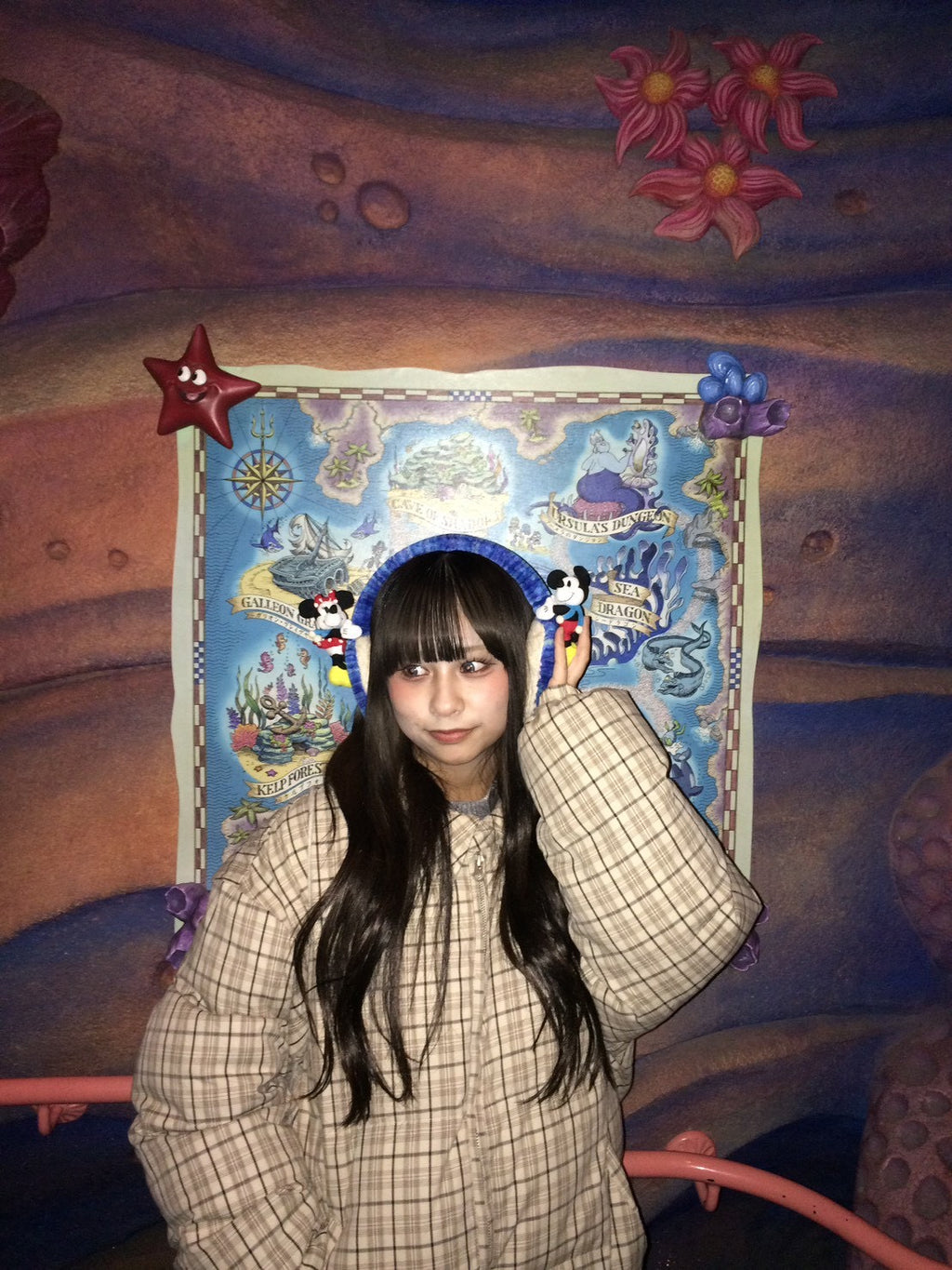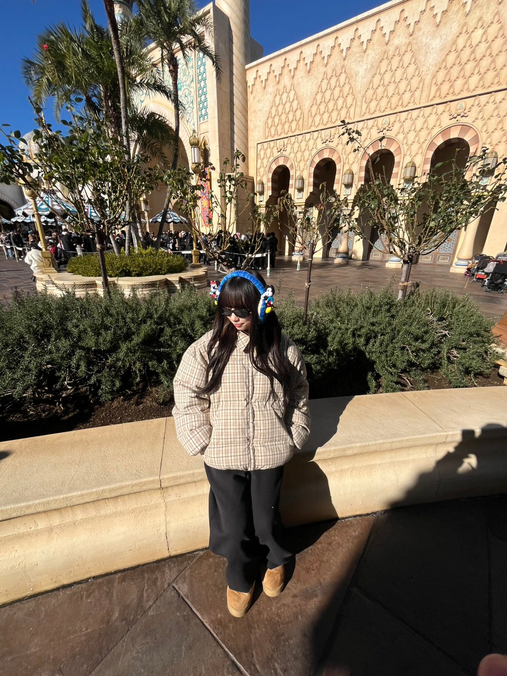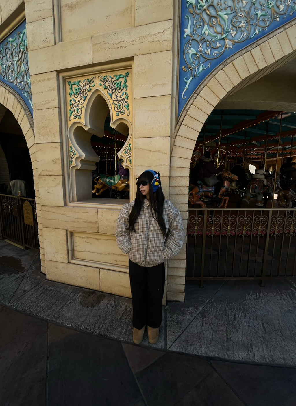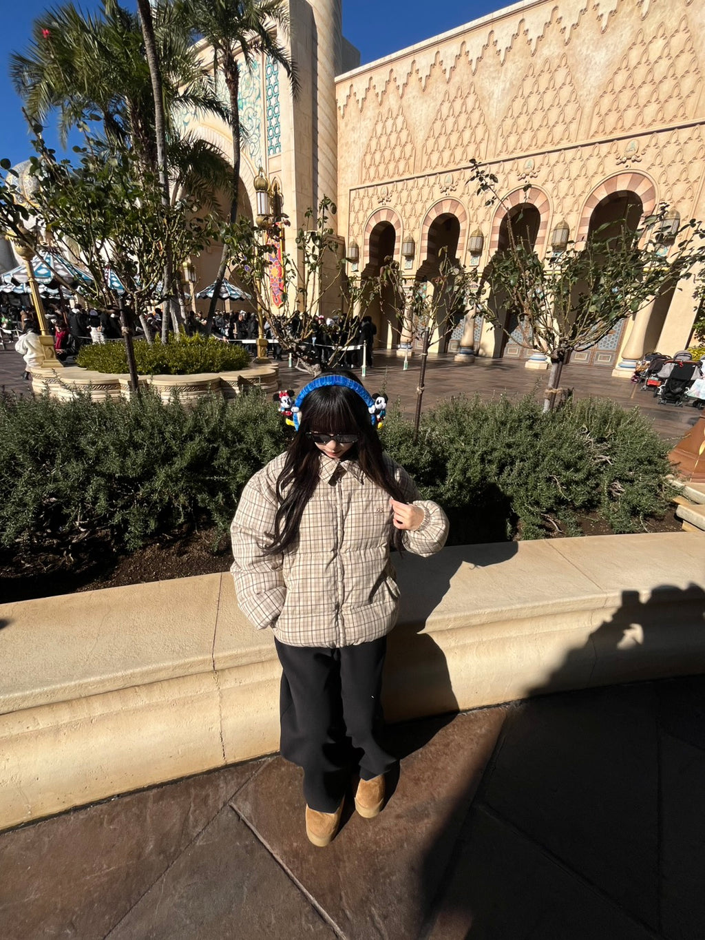 🟤 レトロなチェック柄が可愛い中綿ジャケットは、あえてシンプルなボトムでまとめて柄を主役に。