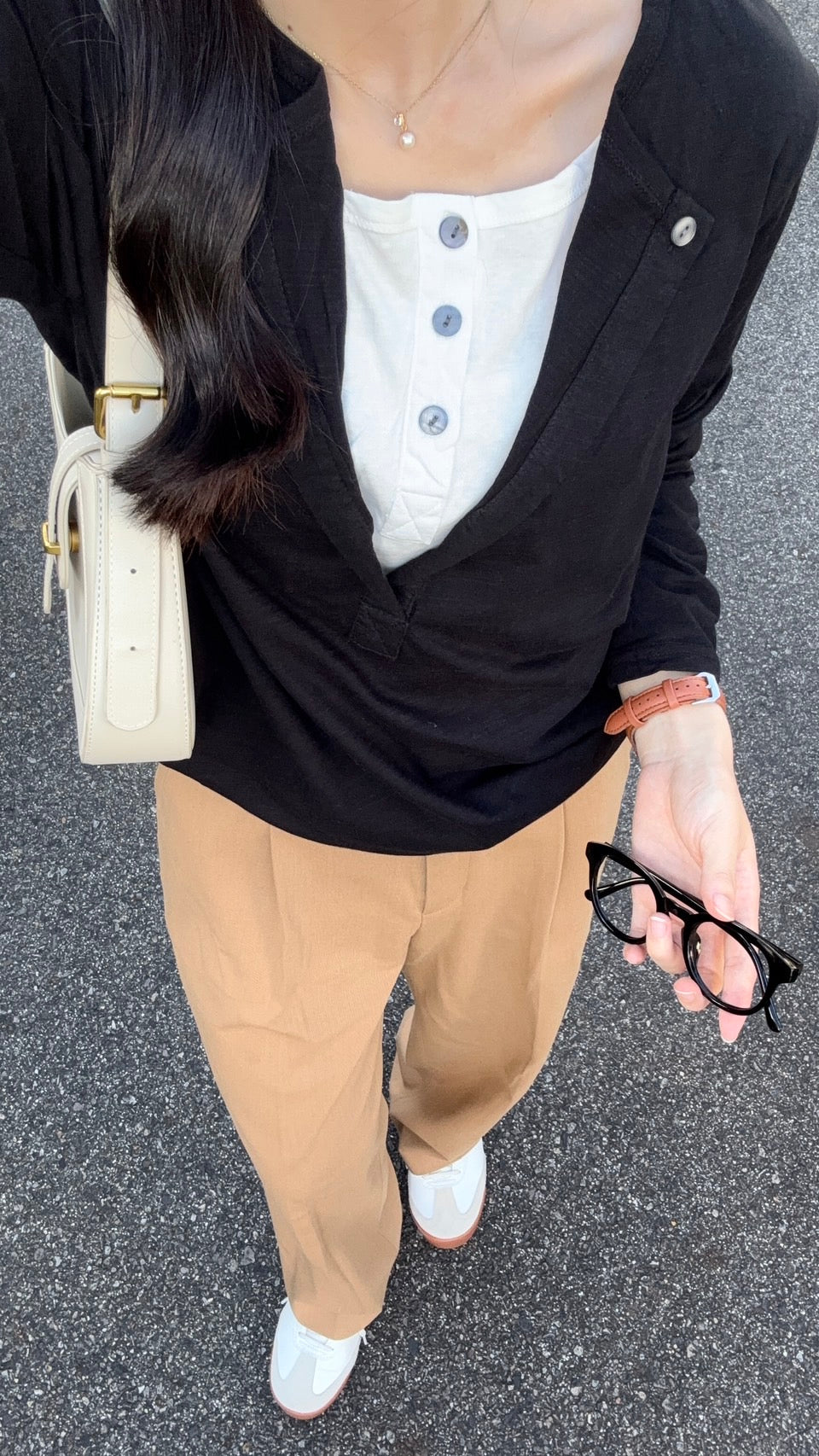 ボタン付きのフロントデザインがアクセントになり、カジュアルからきれいめまで幅広く活躍。