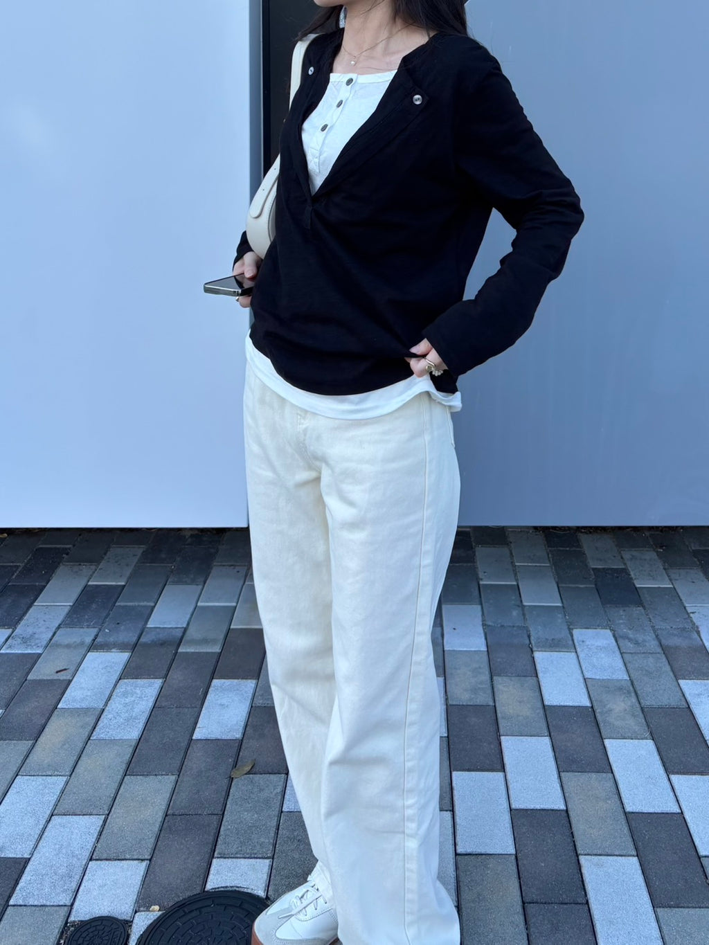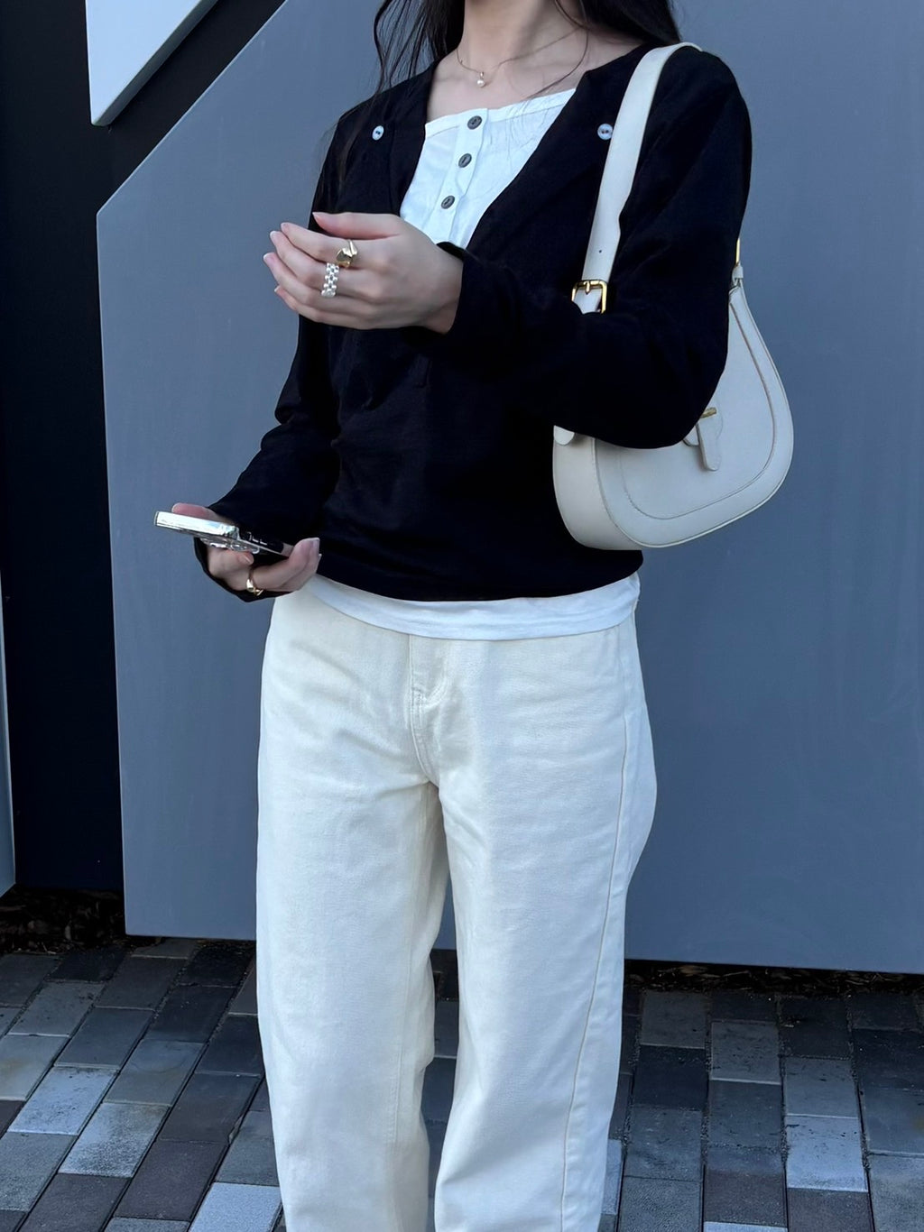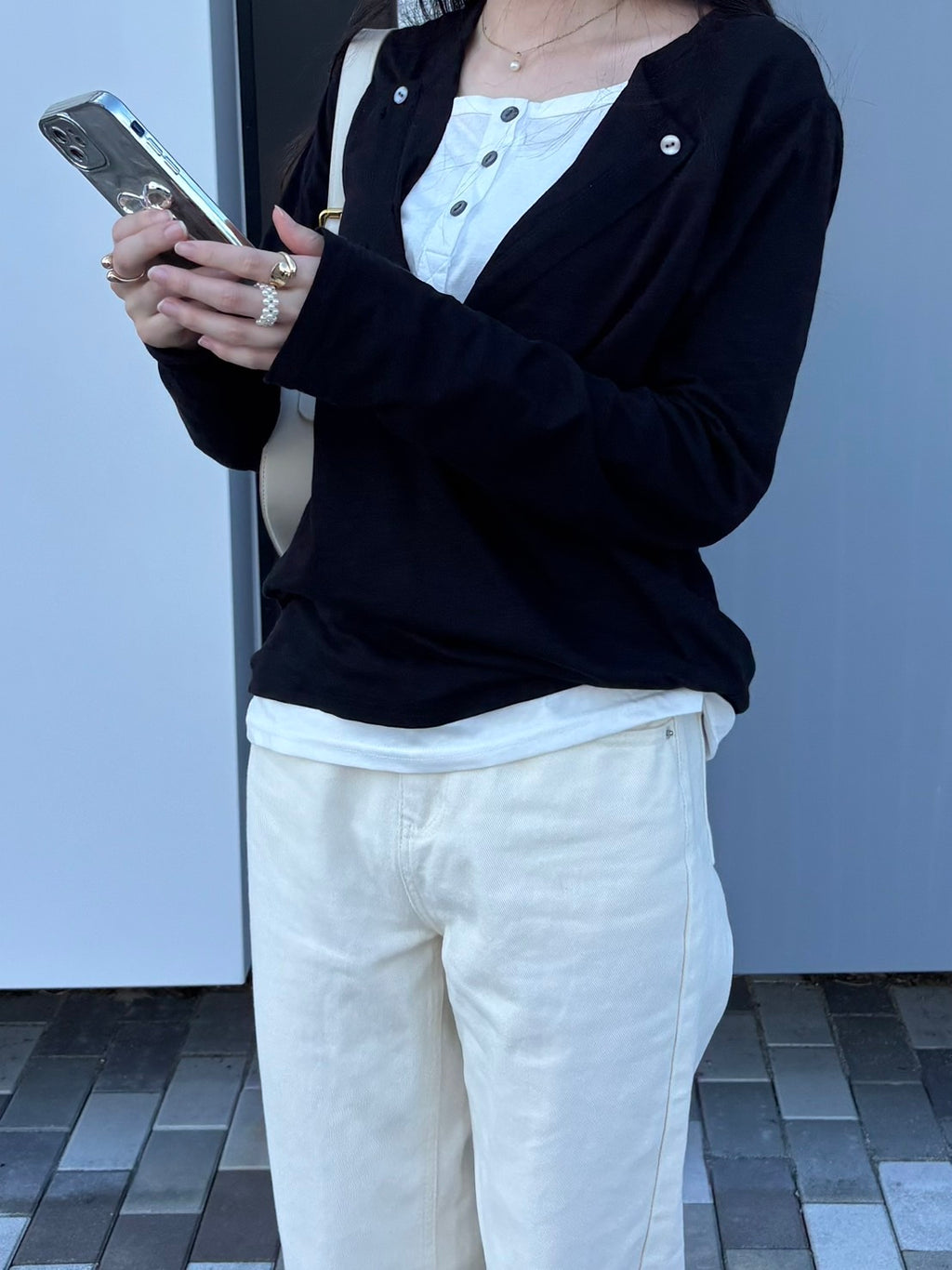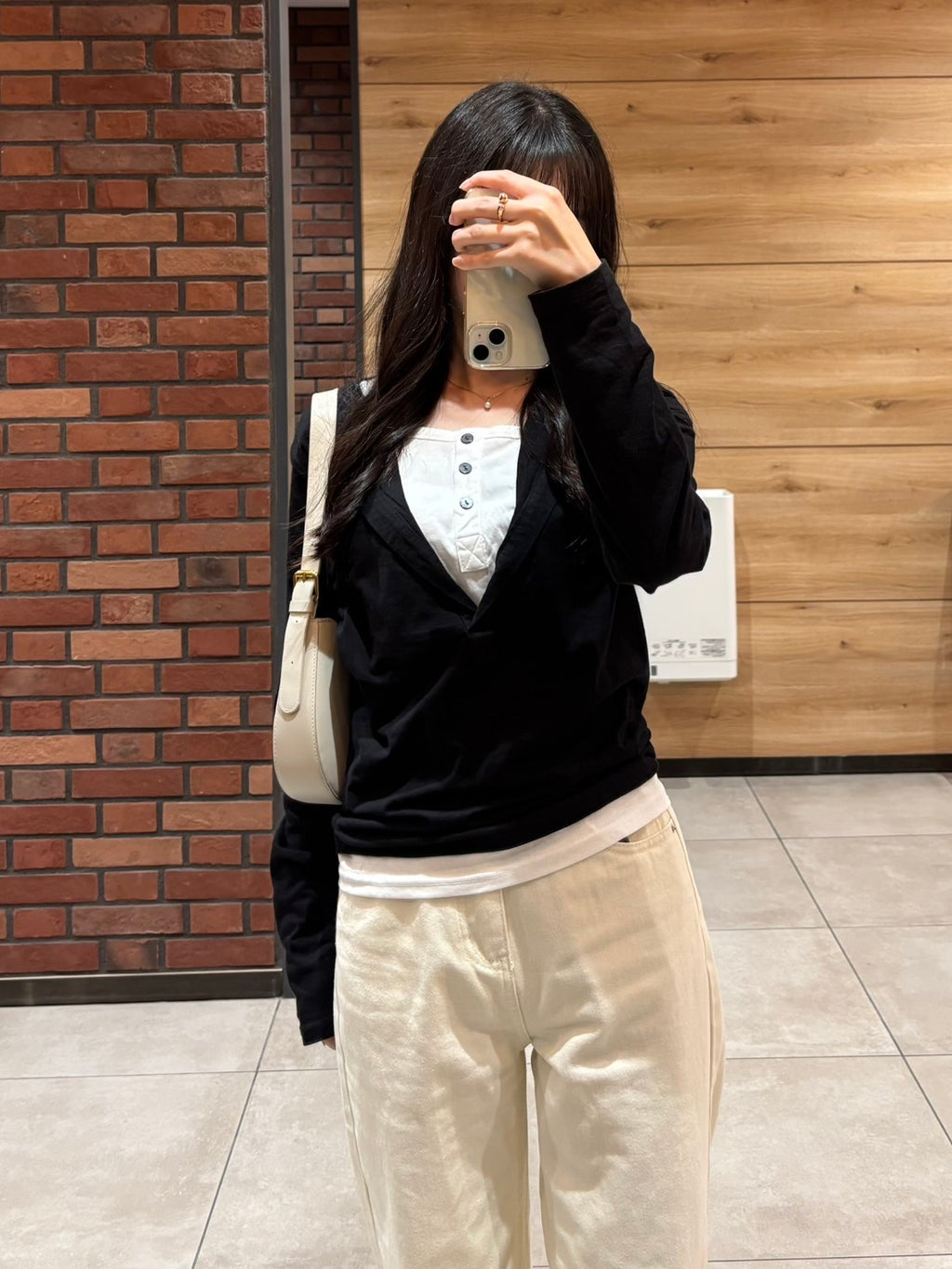 首元と裾からちらりと覗くインナー風ディテールが、シンプルながらもこなれ感を演出します。