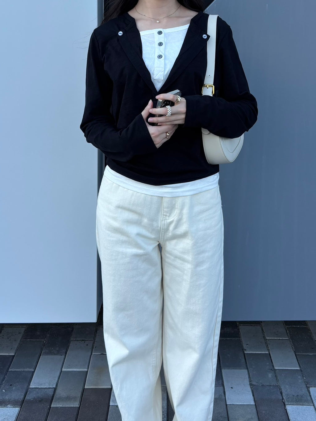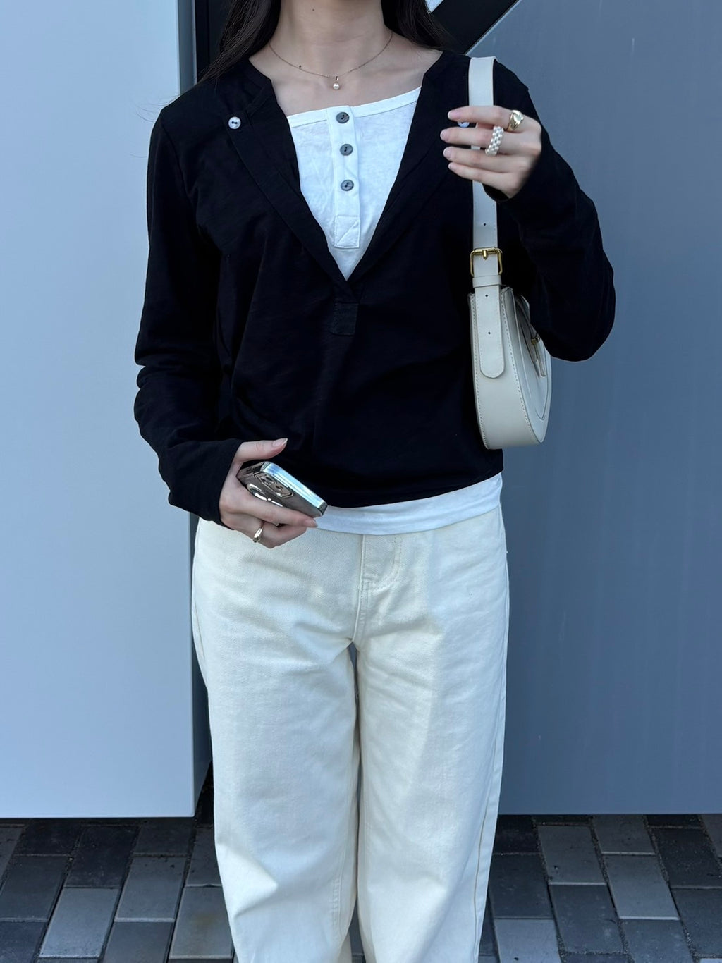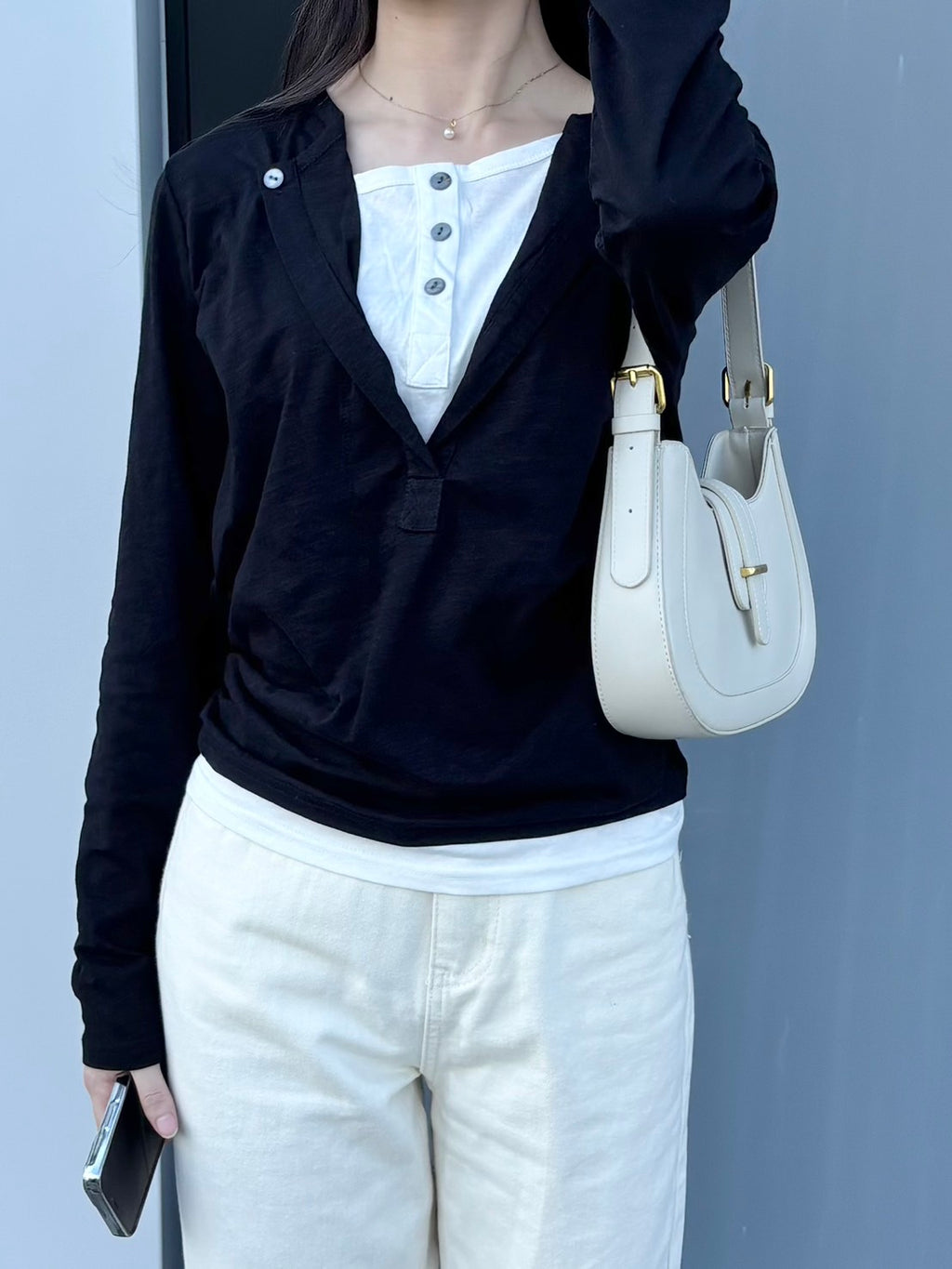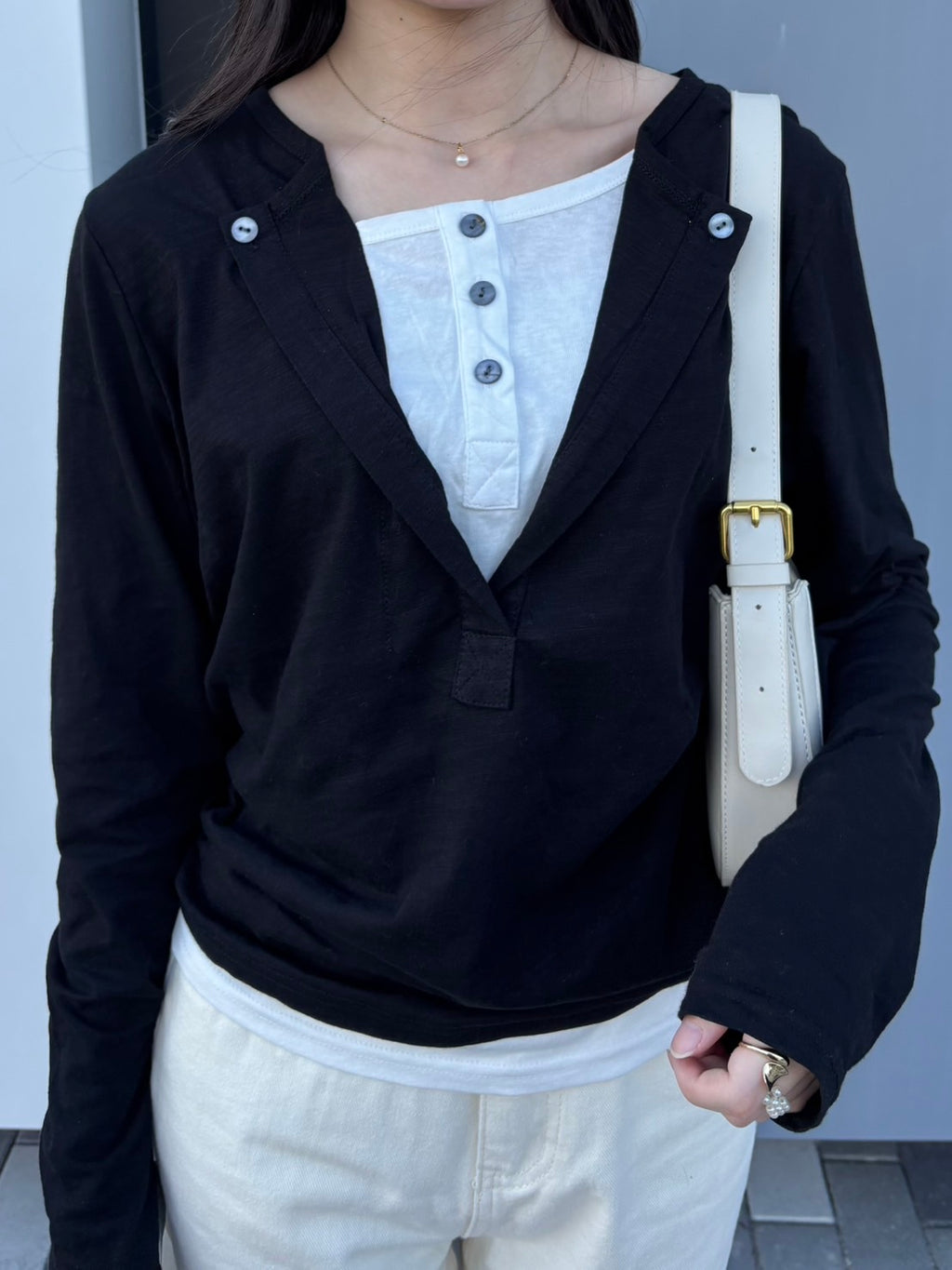 1枚でレイヤードスタイルが完成する、重ね着風デザインの長袖カットソー。
