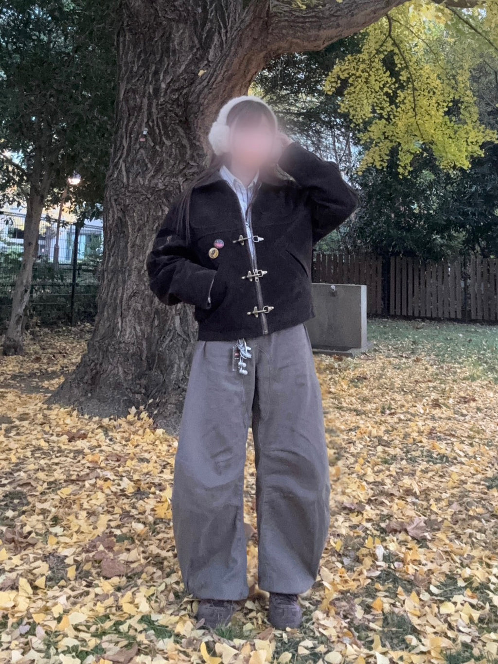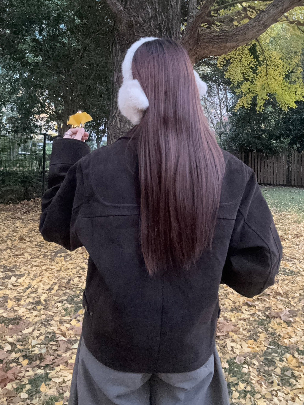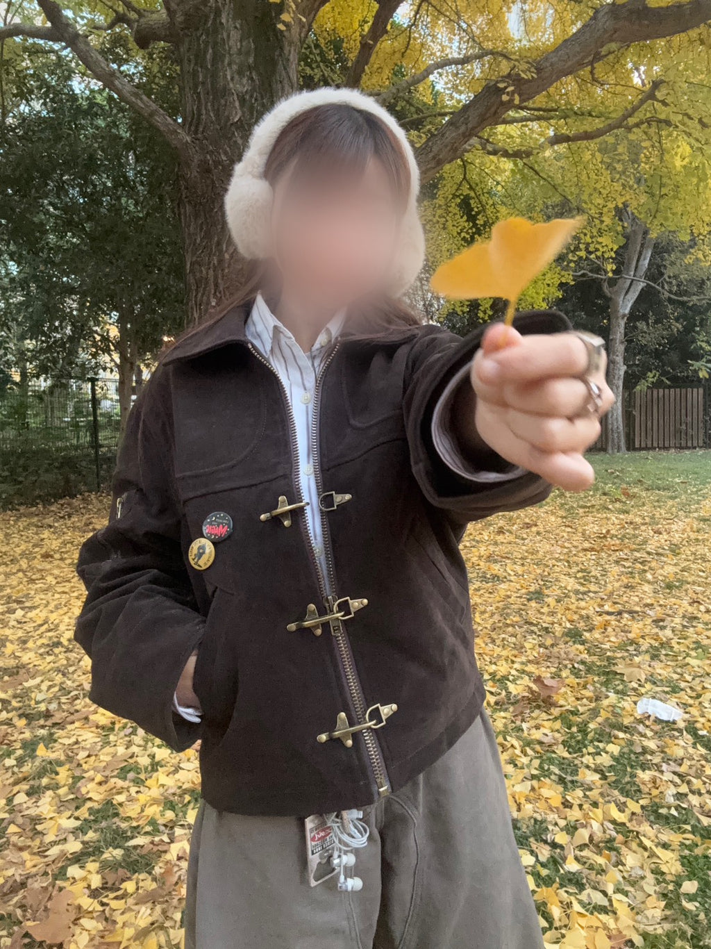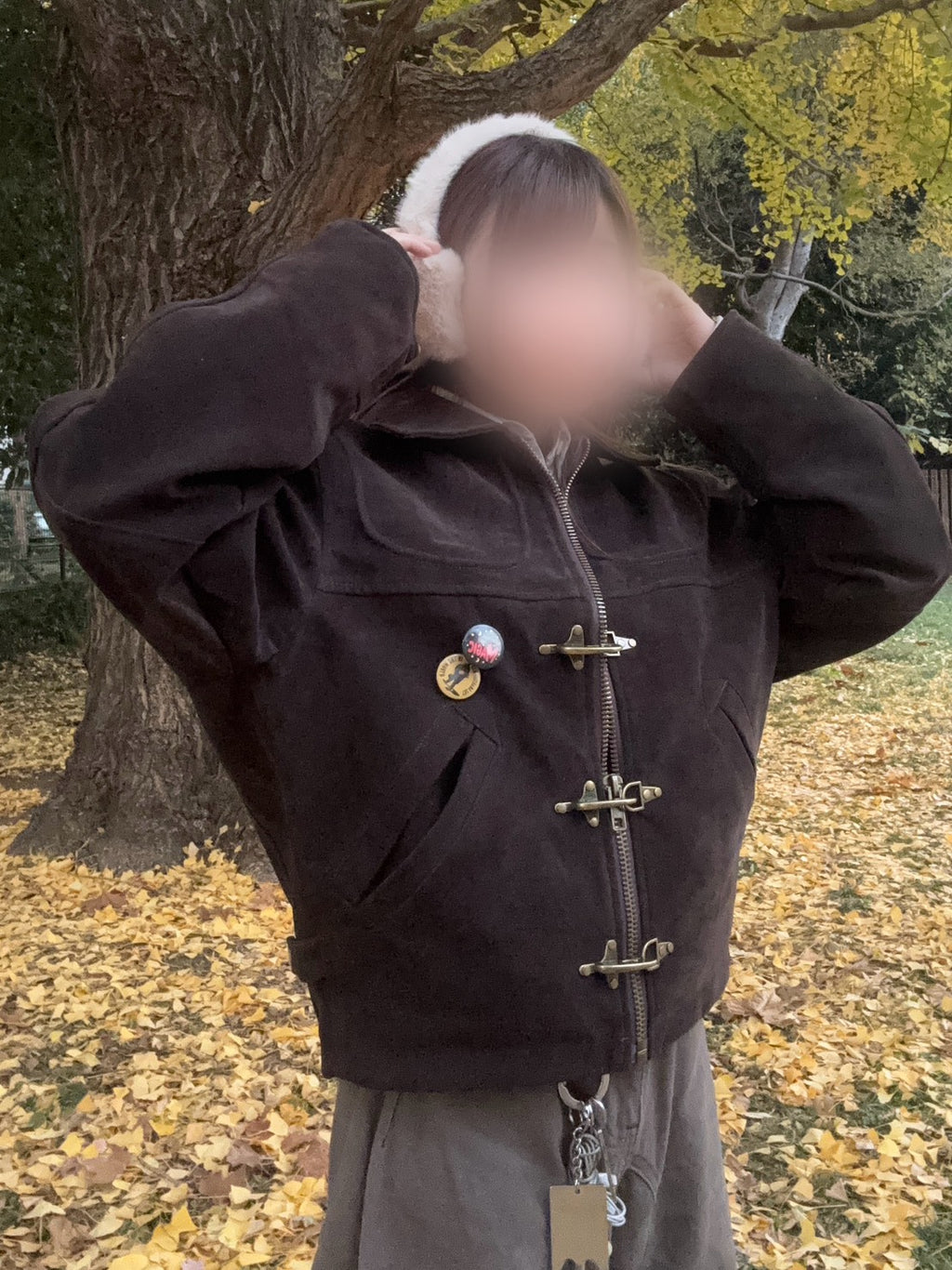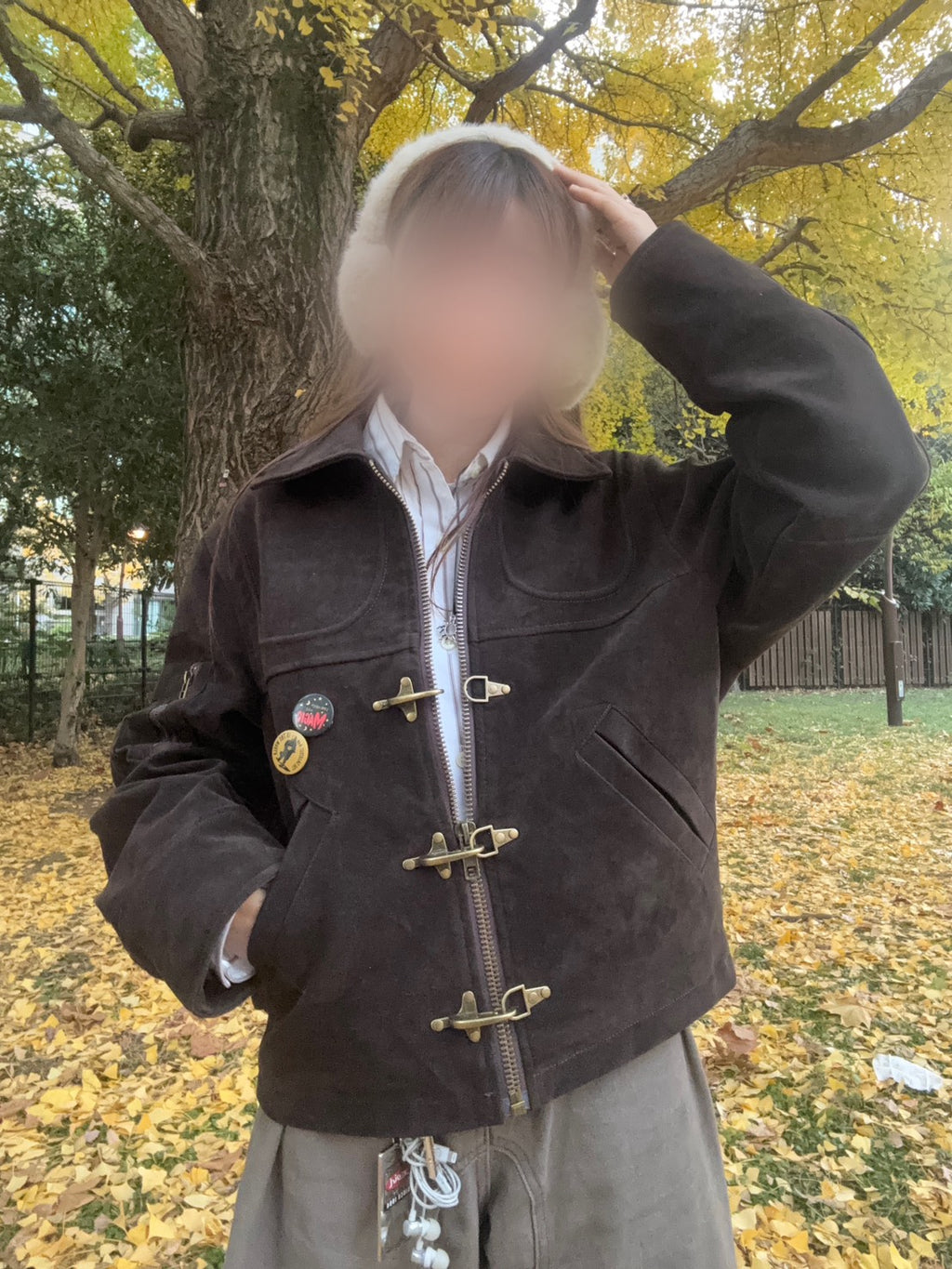 スエードタッチのショート丈、まじで着るだけで“秋冬の雰囲気あがる”って感じ。フックの金具がアクセ感出してくれるから、シンプルなコーデでも一気に洒落見えするよ。ゆるパン合わせると抜け感ちょうど良くて若い子向けのバランス◎。