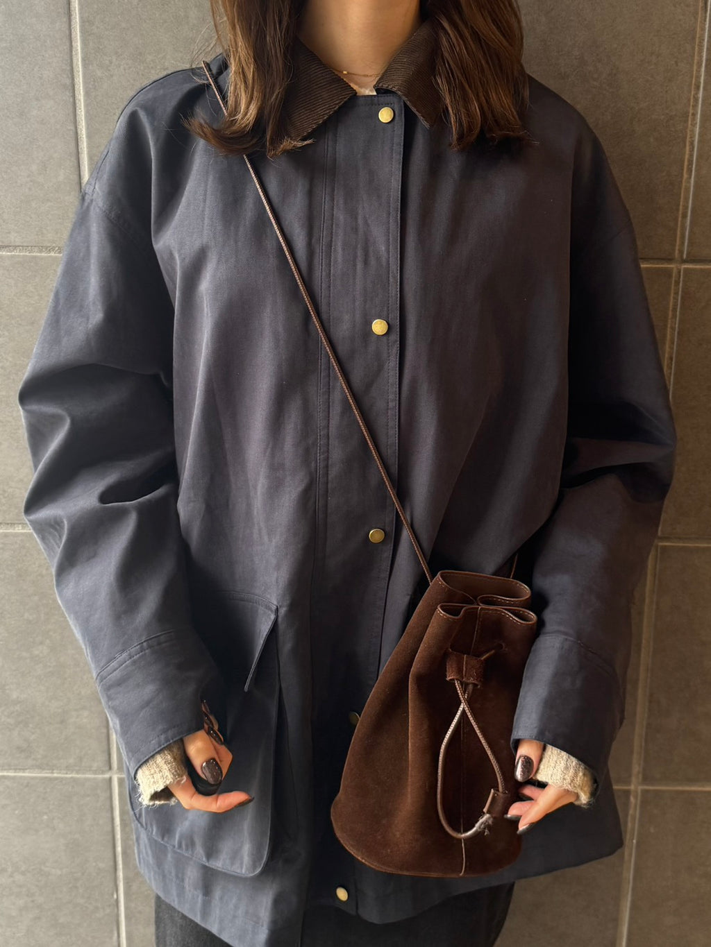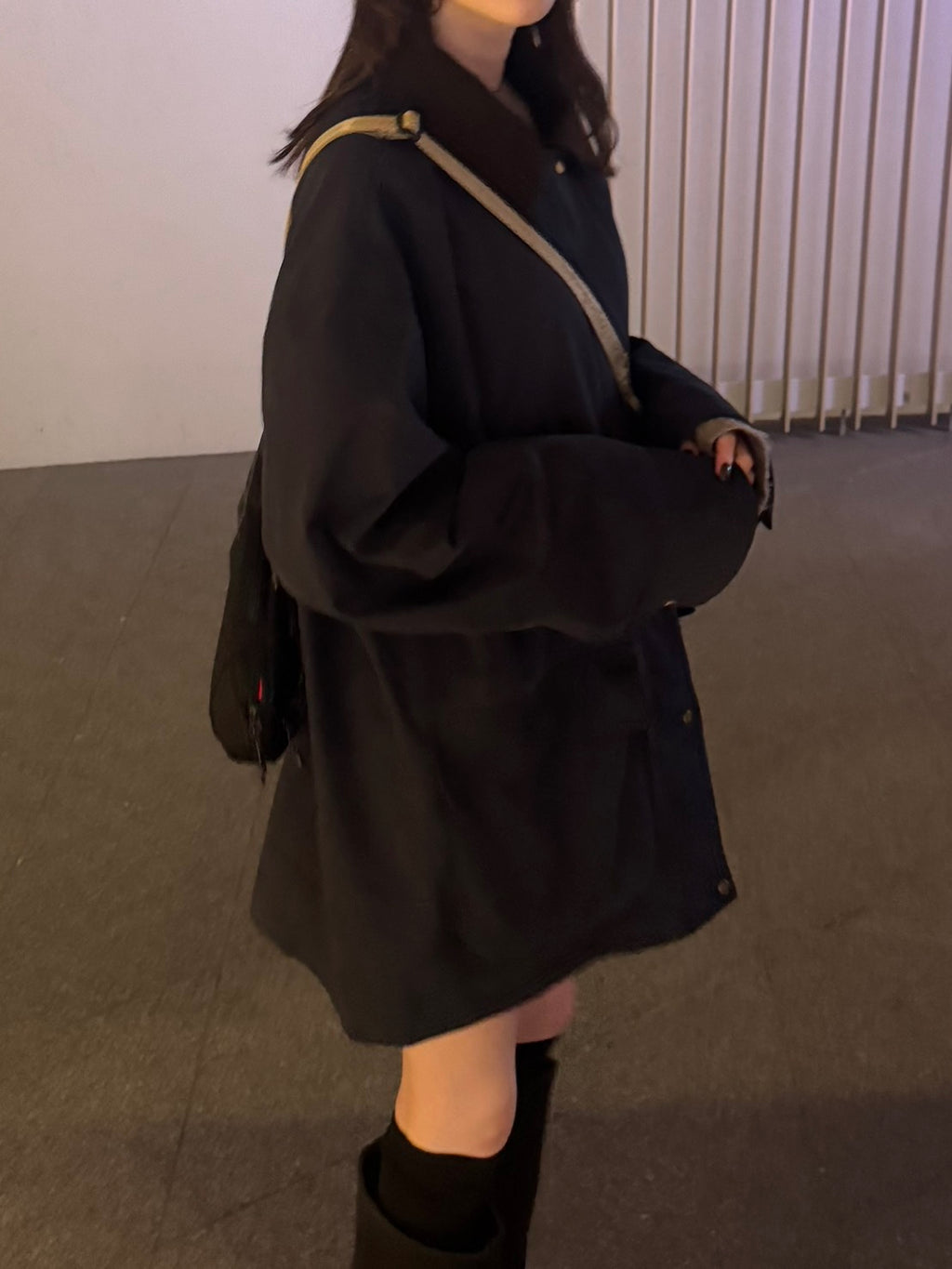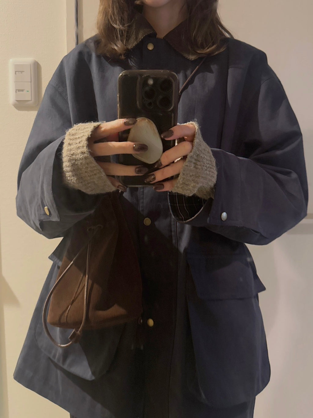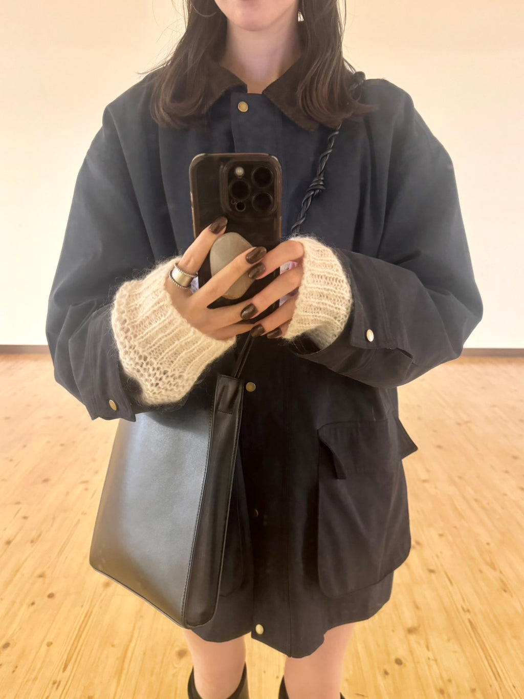 ワークコートの無骨さは、コーデュロイ襟とゆるシルエットで柔らかく中和させています。あえてダークトーンでまとめて質感を際立たせ、手元のモヘアニットで冬らしい抜け感をプラス。小さめバッグを合わせて重心を上げると、ミドル丈でもすっきり見えて大人っぽいバランスに。