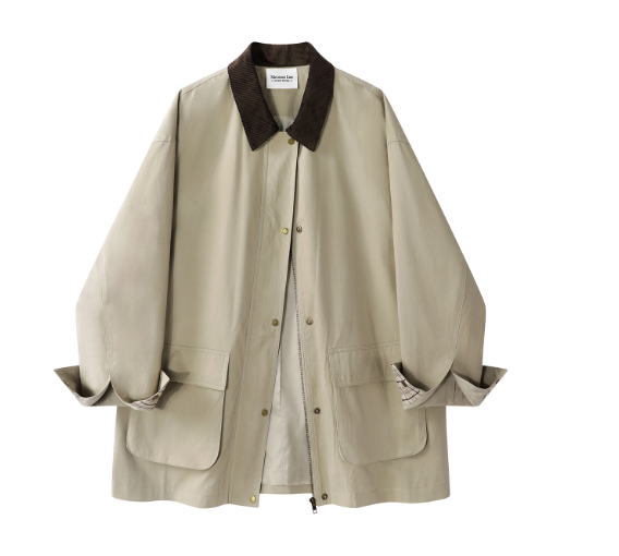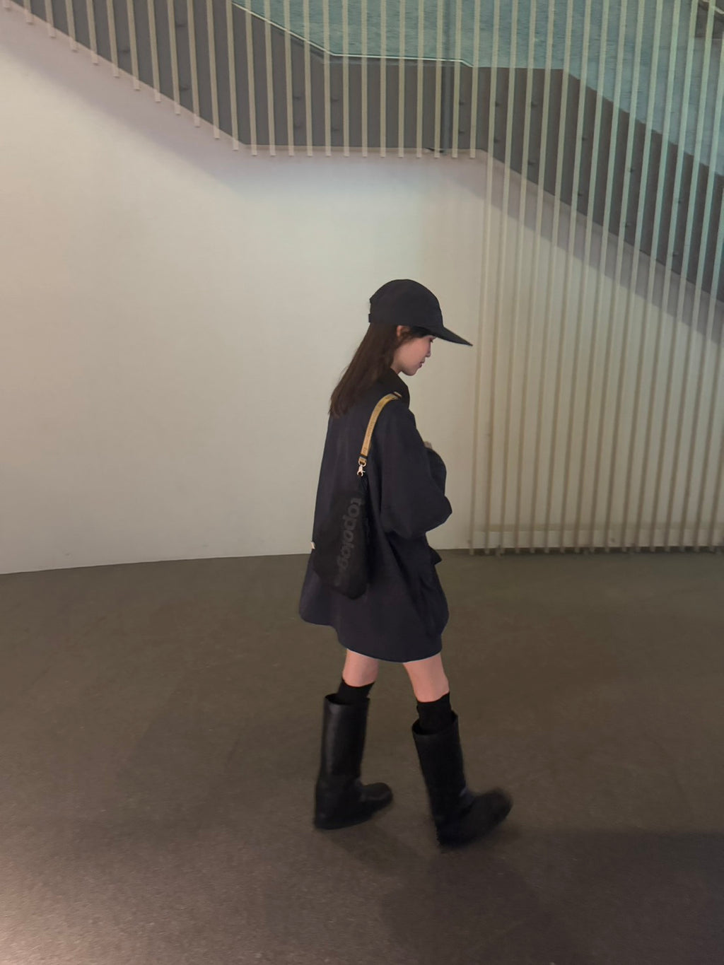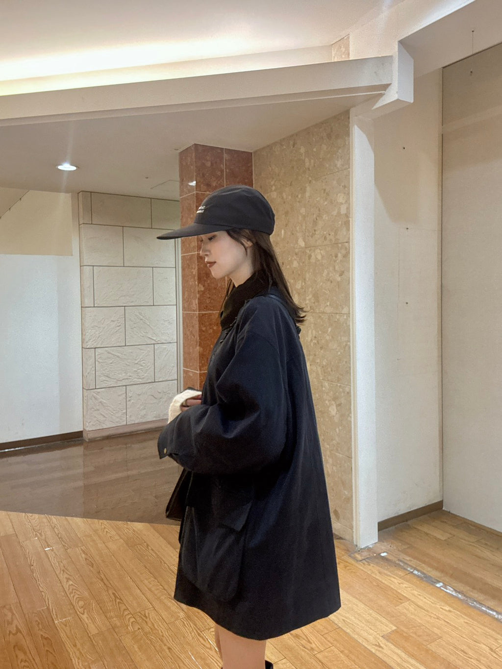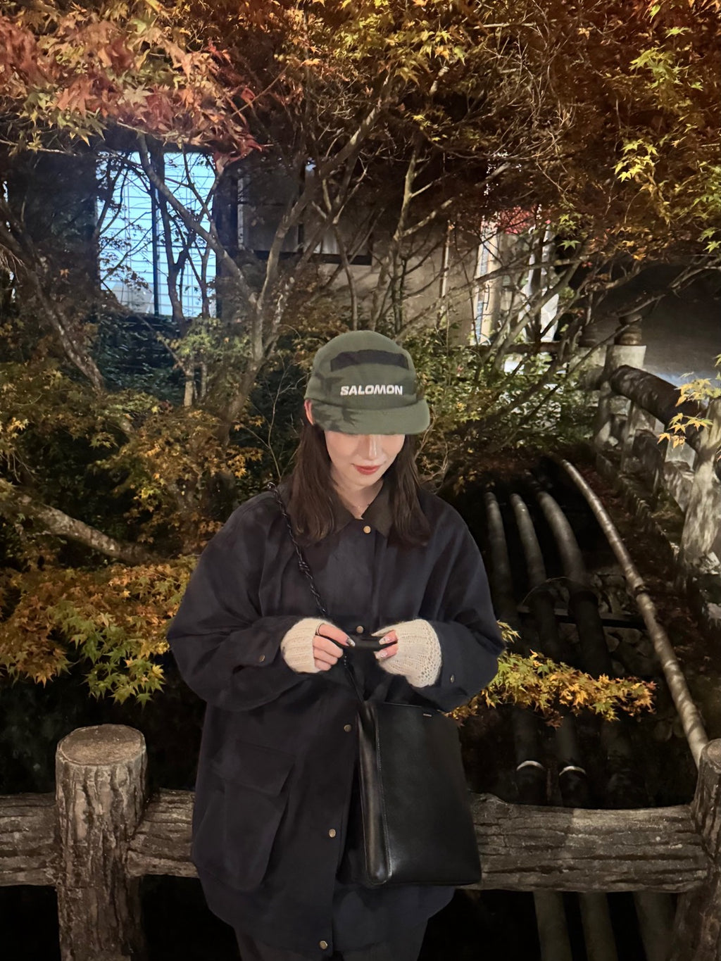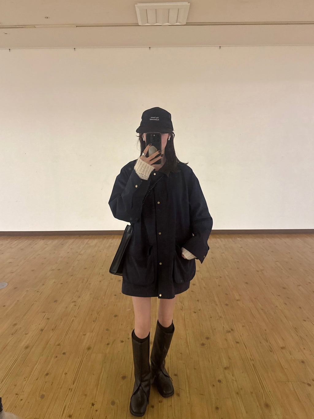 ワークコートの無骨さは、コーデュロイ襟とゆるシルエットで柔らかく中和させています。あえてダークトーンでまとめて質感を際立たせ、手元のモヘアニットで冬らしい抜け感をプラス。小さめバッグを合わせて重心を上げると、ミドル丈でもすっきり見えて大人っぽいバランスに。