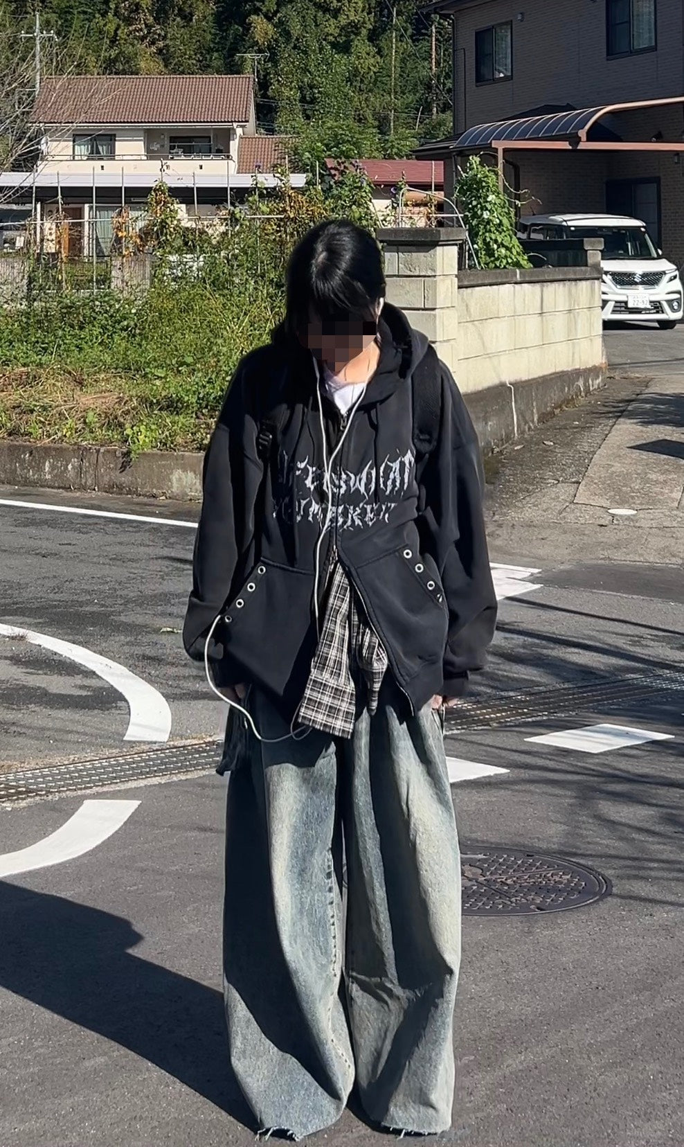 コーデの主役はこのバギーデニム。この地面を引きずるくらいの極太シルエットと、絶妙なヴィンテージウォッシュがたまらない。今日はジップパーカーとチェックシャツをレイヤードして、とことんグランジ/ストリートなムードに。トップスもゆるく、この「重×重」のバランスが今の気分。