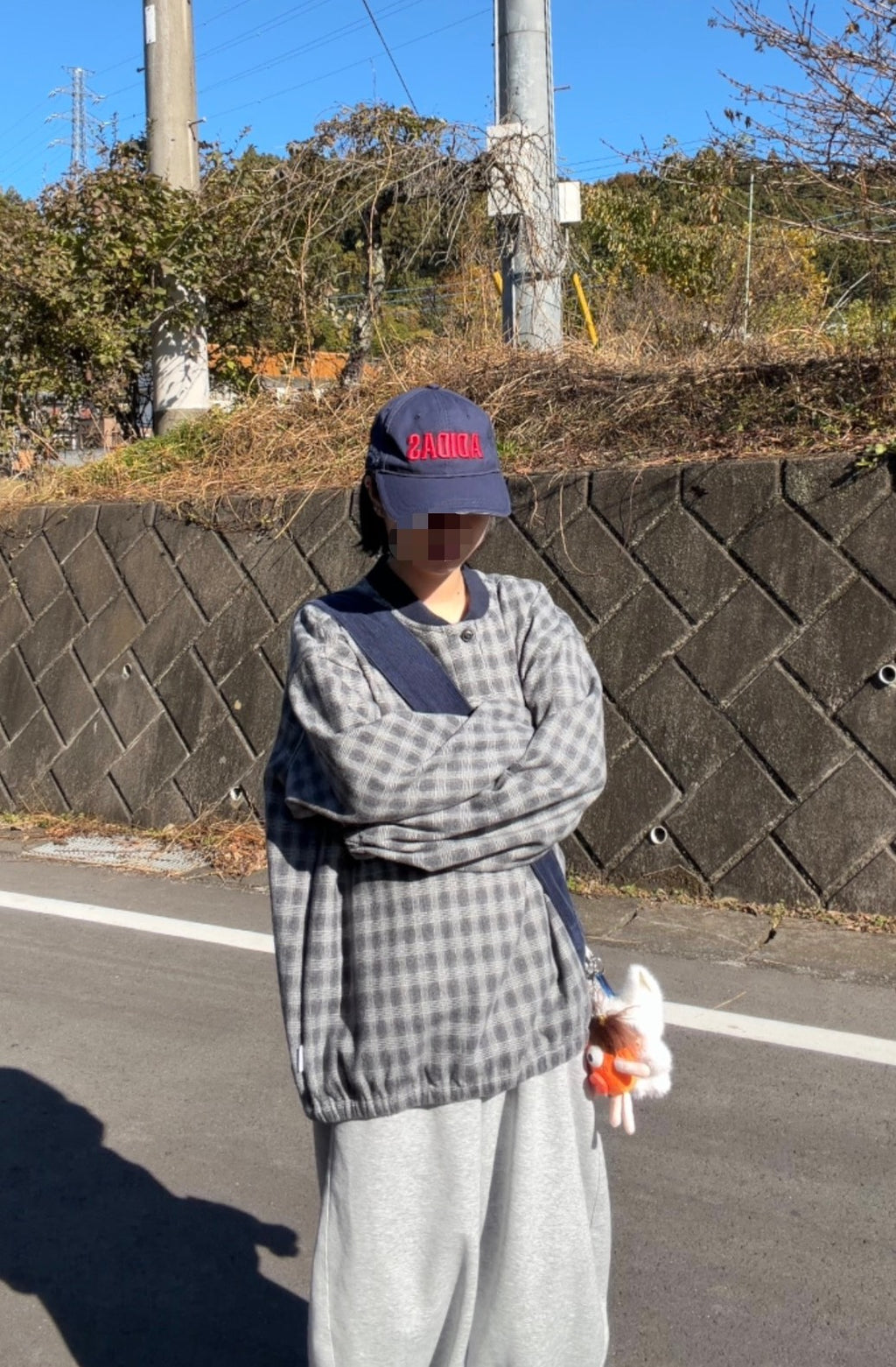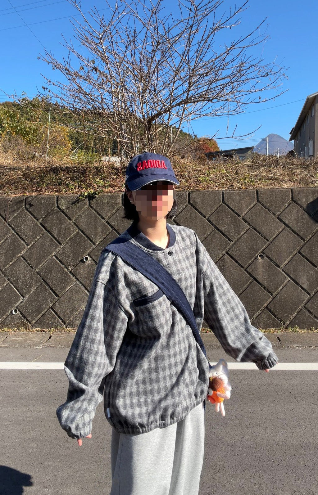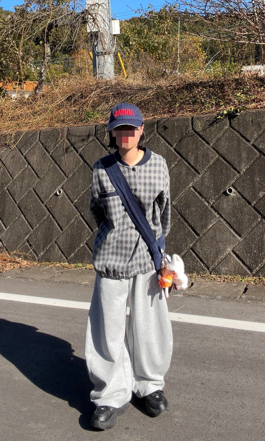 丸みのあるシルエットが、一枚で着ても可愛い。今日はあえて極太のスウェットパンツを合わせて、上下ともに「ゆる×ゆる」なリラックススタイルに。キャップとスニーカーでスポーティーにまとめるのが、気取らない休日のマイルール。