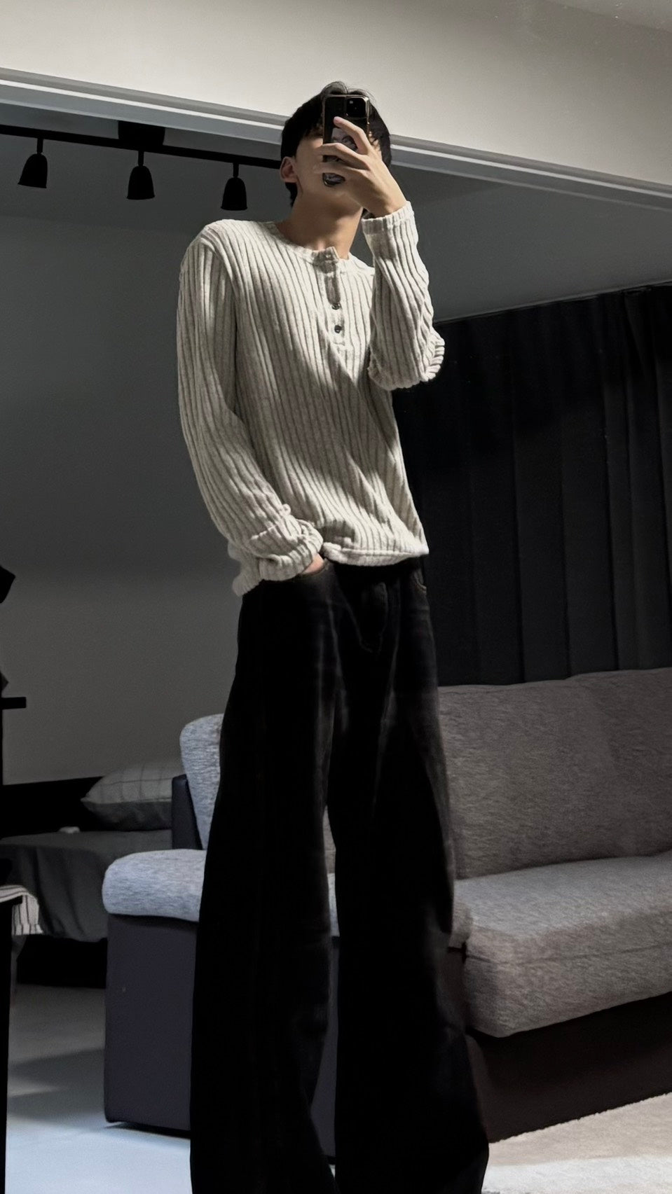 コーデに迷ったら、つい手に取っちゃうのがこのリブヘンリー。決め手は、柔らかな着心地と表情豊かなリブ素材。一枚で着てもサマになるし、今日はワイドパンツにタックインして、少しクリーンな印象に。ボタンの開け方で抜け感も調整できる。インナーにも使えて、マジで万能。
