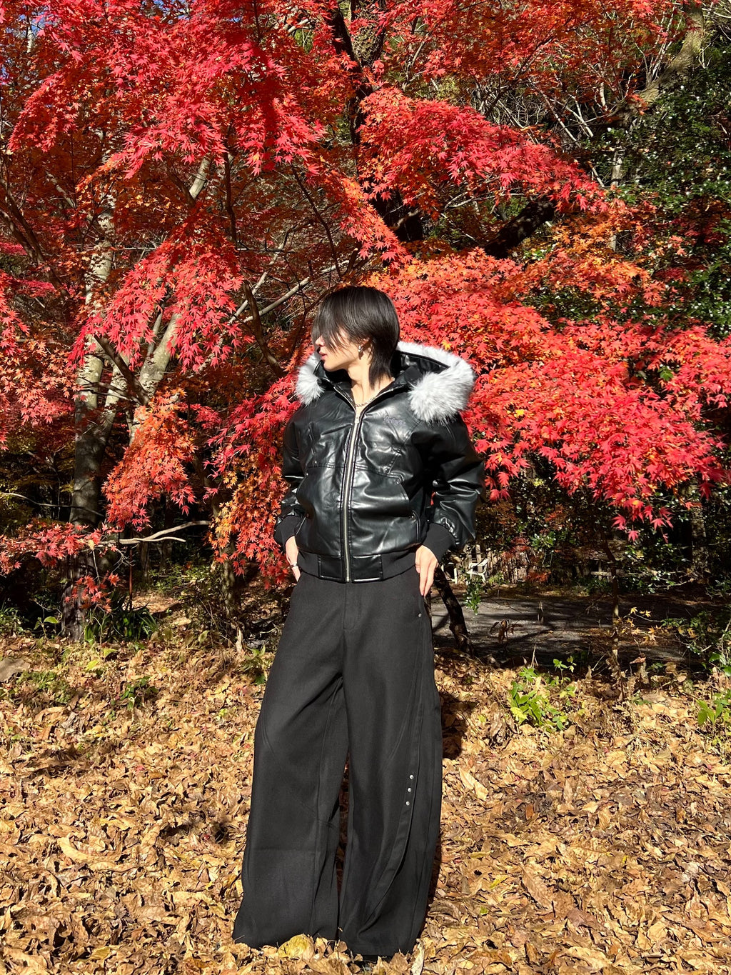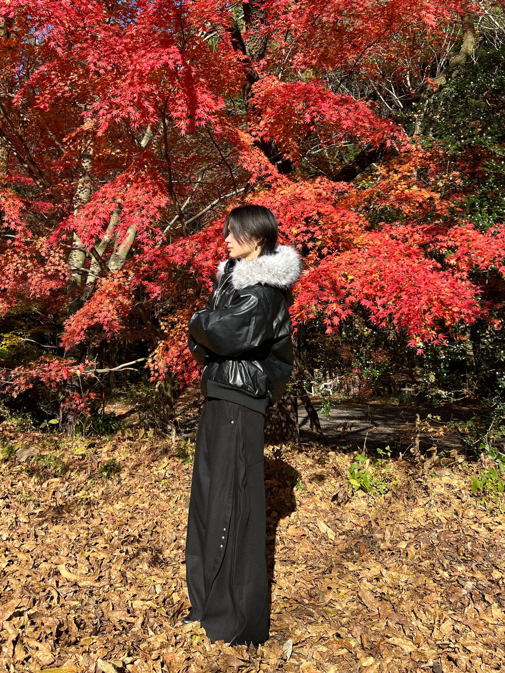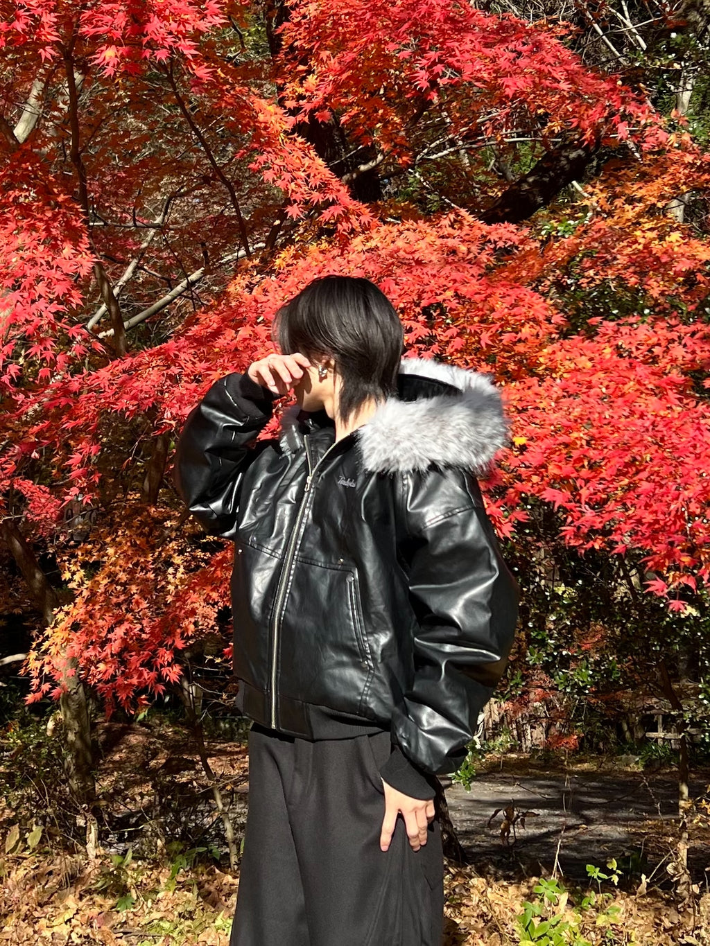 脱着ファーのボリューム感が冬のスタイリングを一気に格上げしてくれます。レザーの質感が光に当たると綺麗に映えるので、ワイドパンツで抜け感を作ってバランス良く着ています。気分でファーを外して雰囲気を変えられるのもお気に入りです。