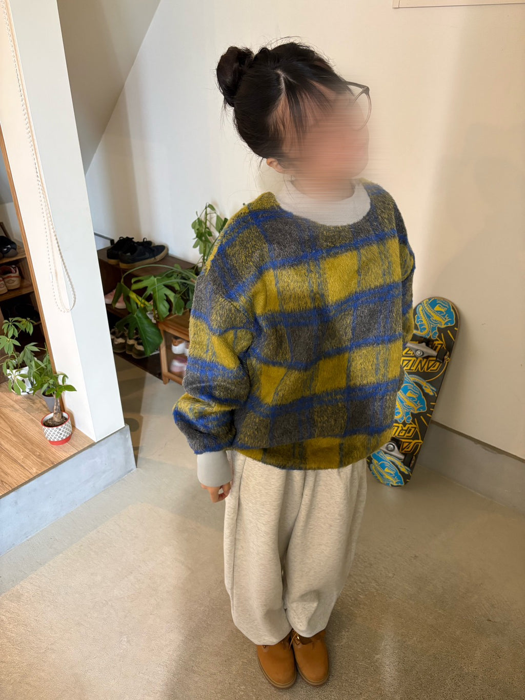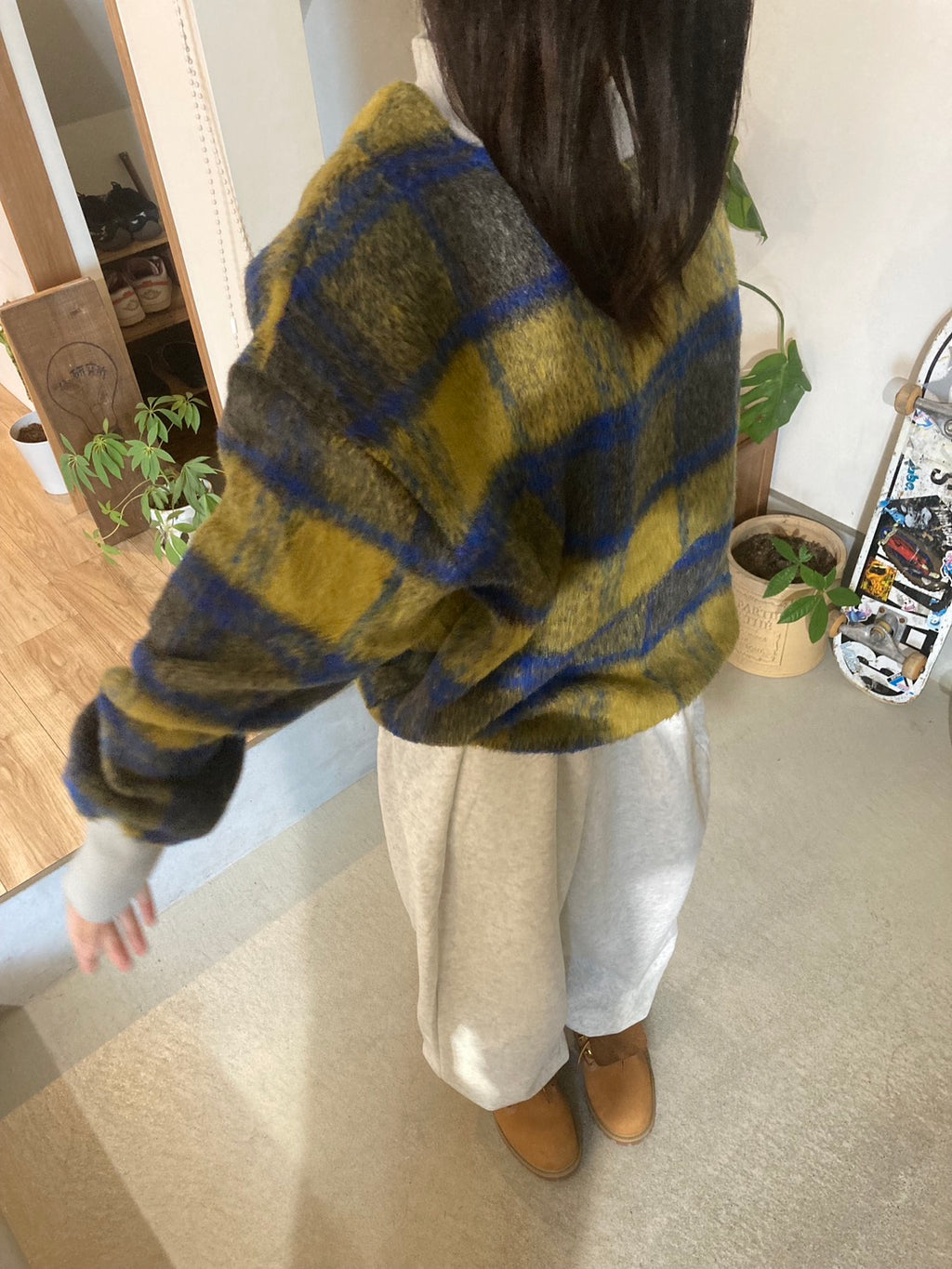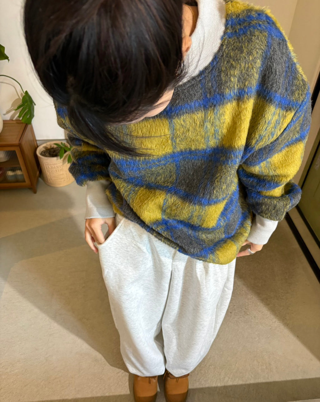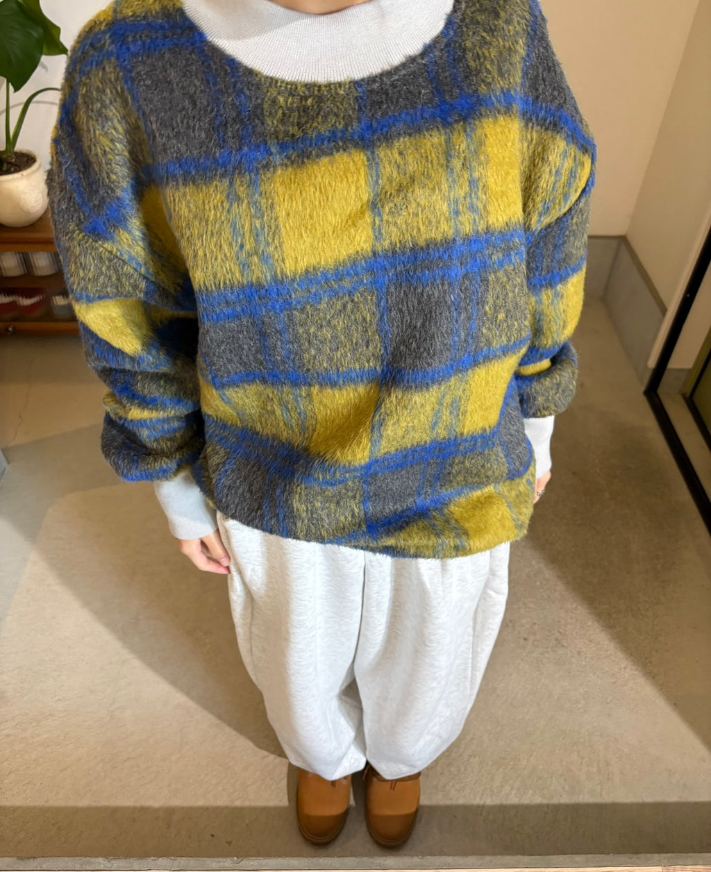 🧵 チェックパターンのニットは、配色を活かして一枚で主役に。