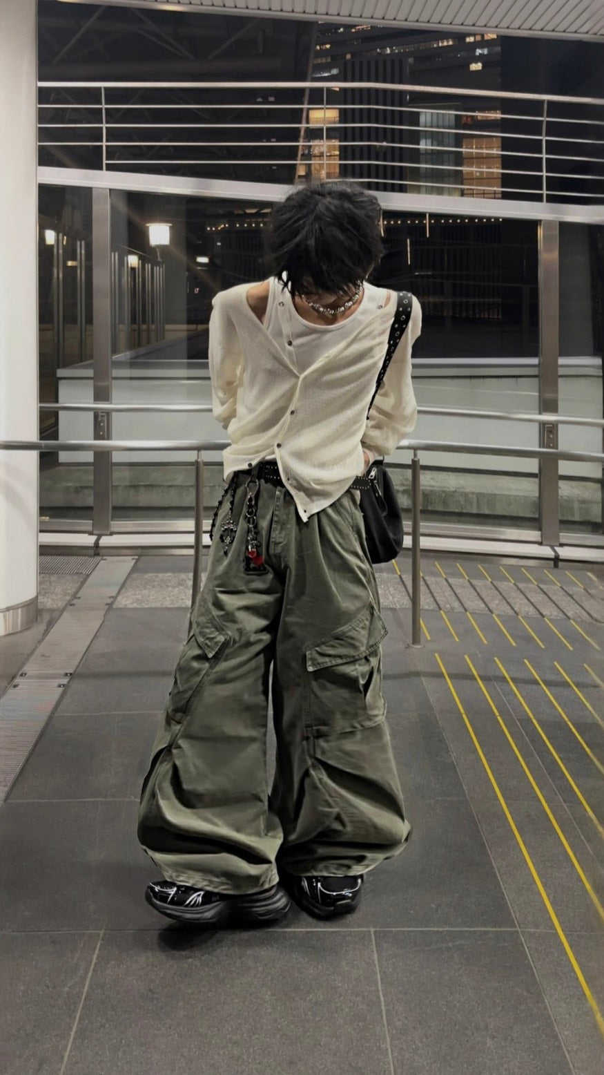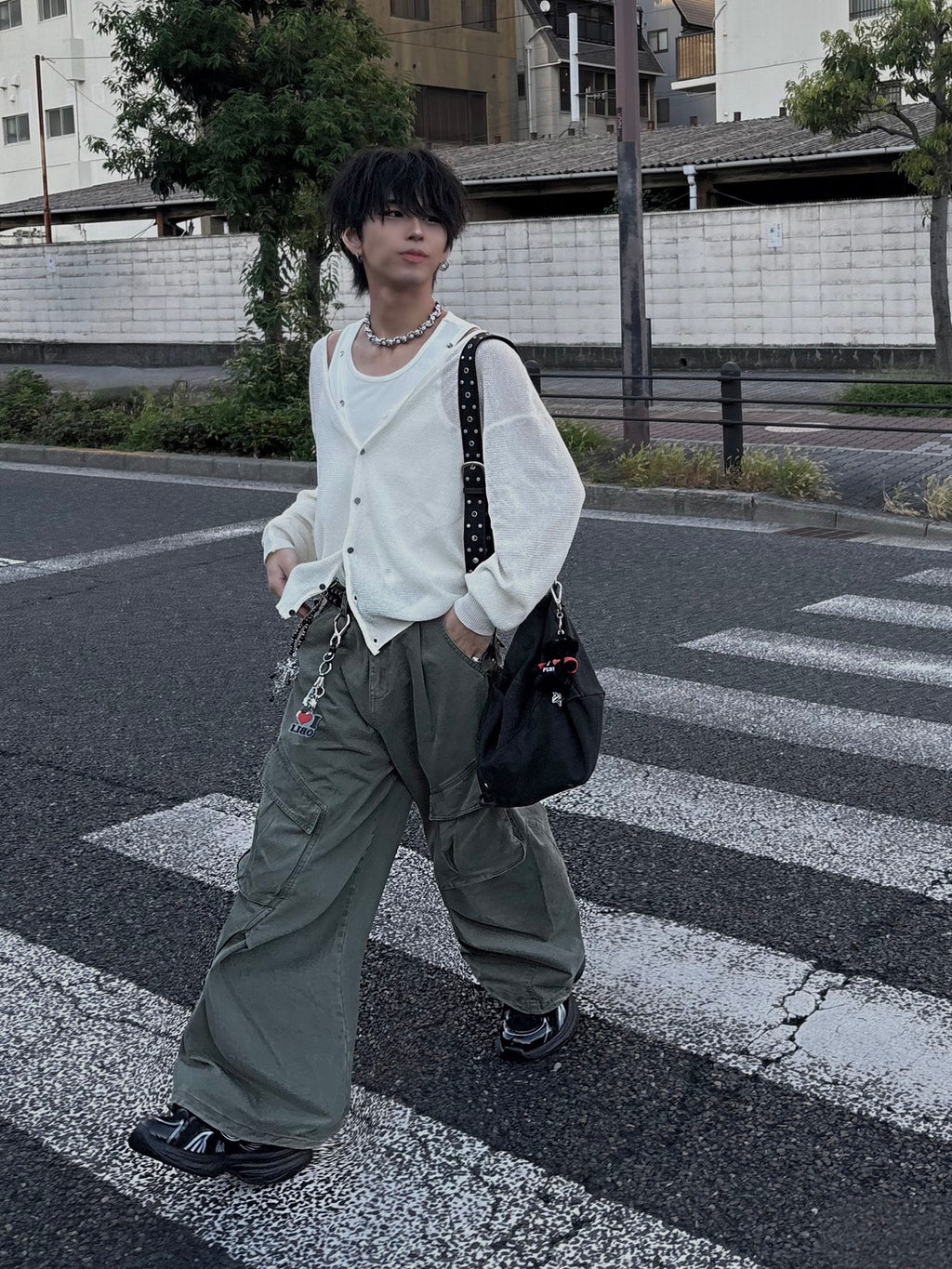 今日の主役はこのウォッシュドカーゴ。この地面を引きずるくらいの極太シルエットがたまらない。あえてトップスは透け感のある白メッシュカーデで、クリーンさとグランジ感をMIX。ゴツいアクセとウォレットチェーン、スタッズベルトでハードに。足元は厚底スニーカーで重く締めるのが俺流。