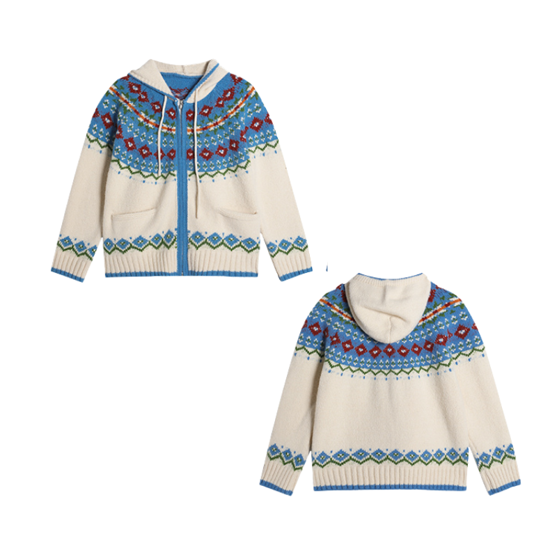このフェアアイル柄のニットカーデは、冬の主役級アイテム。