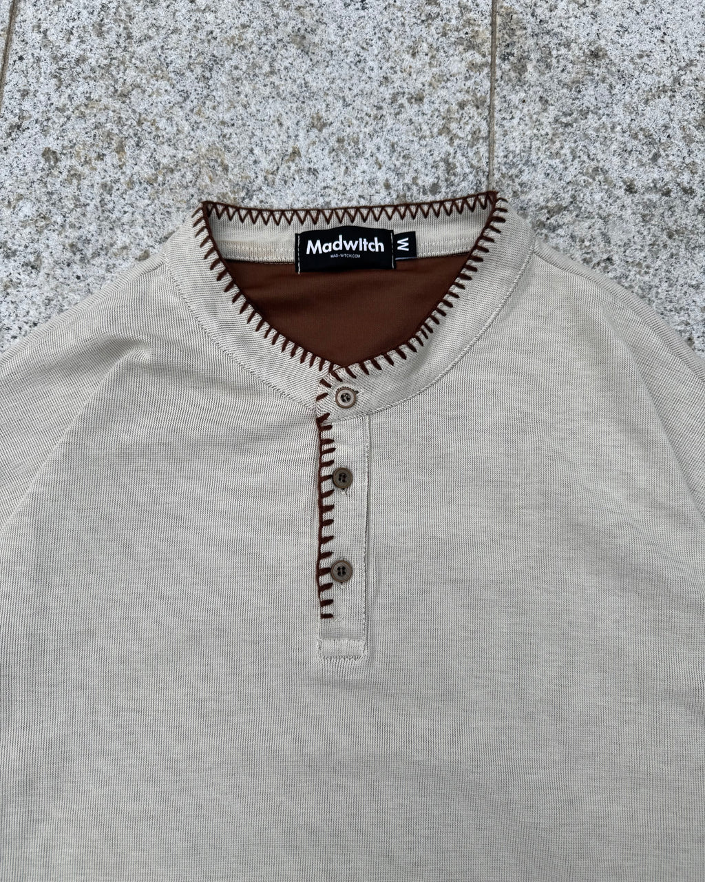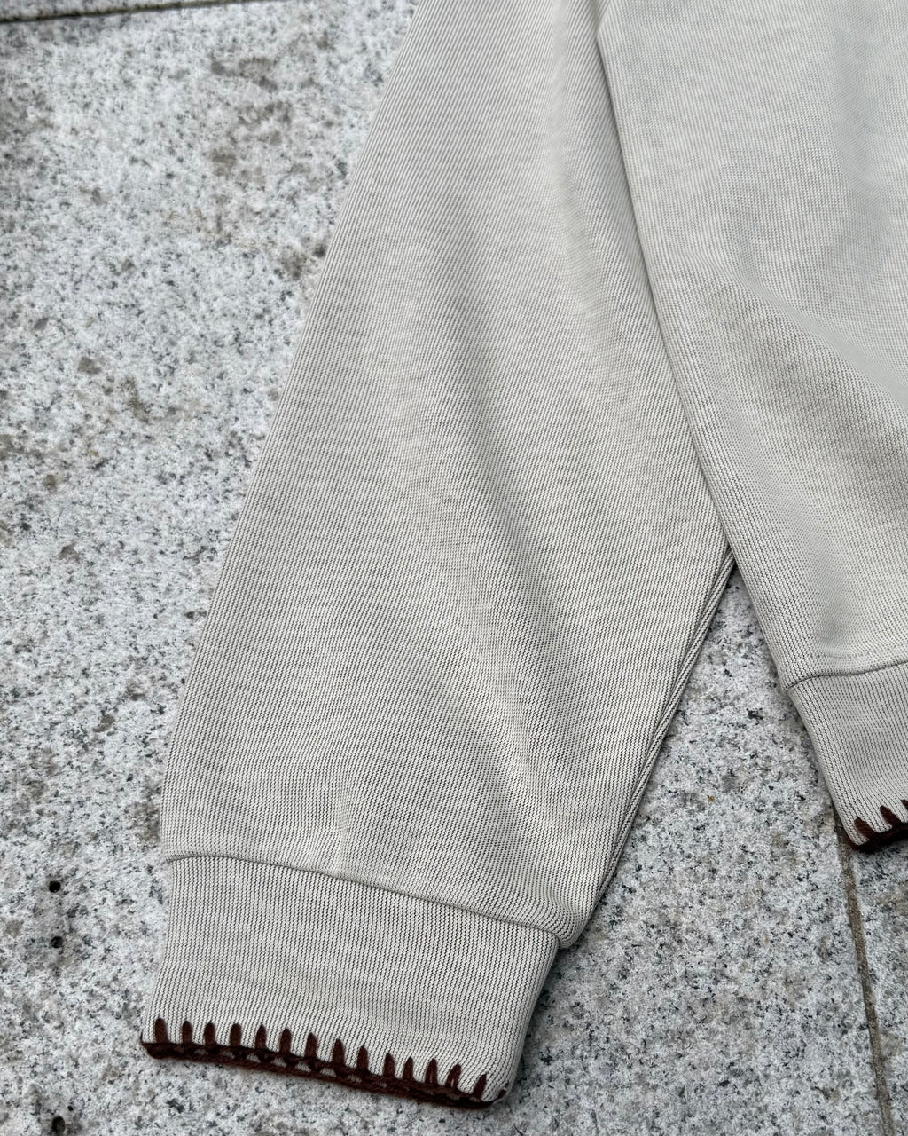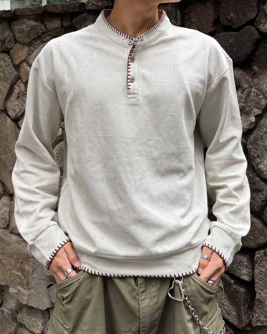 このヘンリーネックニットは、襟元や裾のブランケットステッチが最大のポイント。