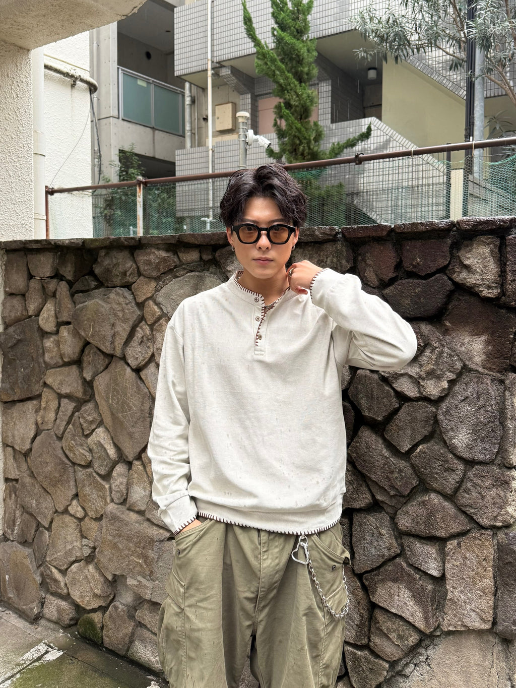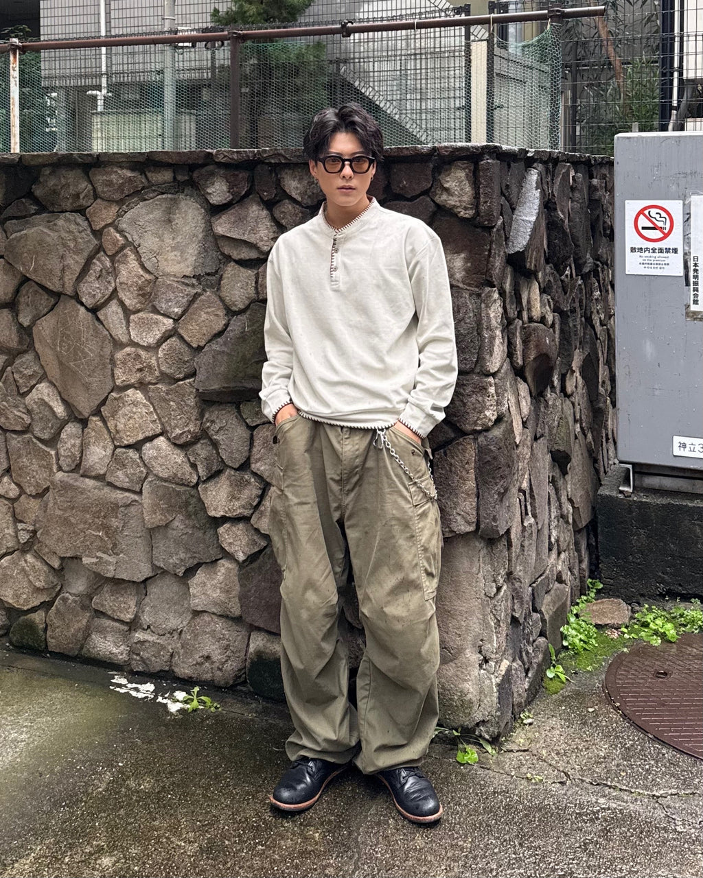 このレトロなディテールが、一枚で着てもサマになる秘訣。今日は極太のカーゴパンツにウォレットチェーンを合わせて、とことんストリートに。レザージャケットのインナーとしても、このステッチが効いてくる。マジで着回し力抜群。