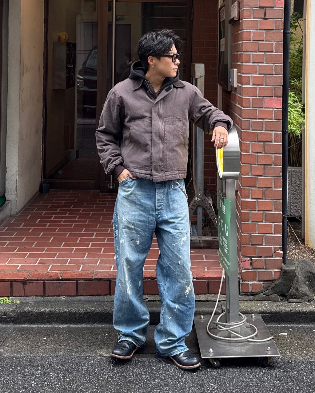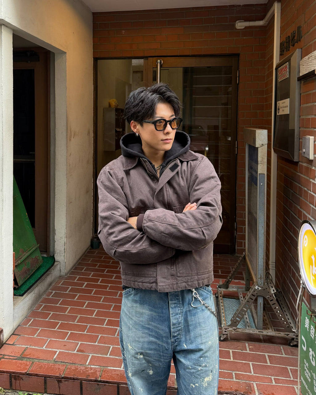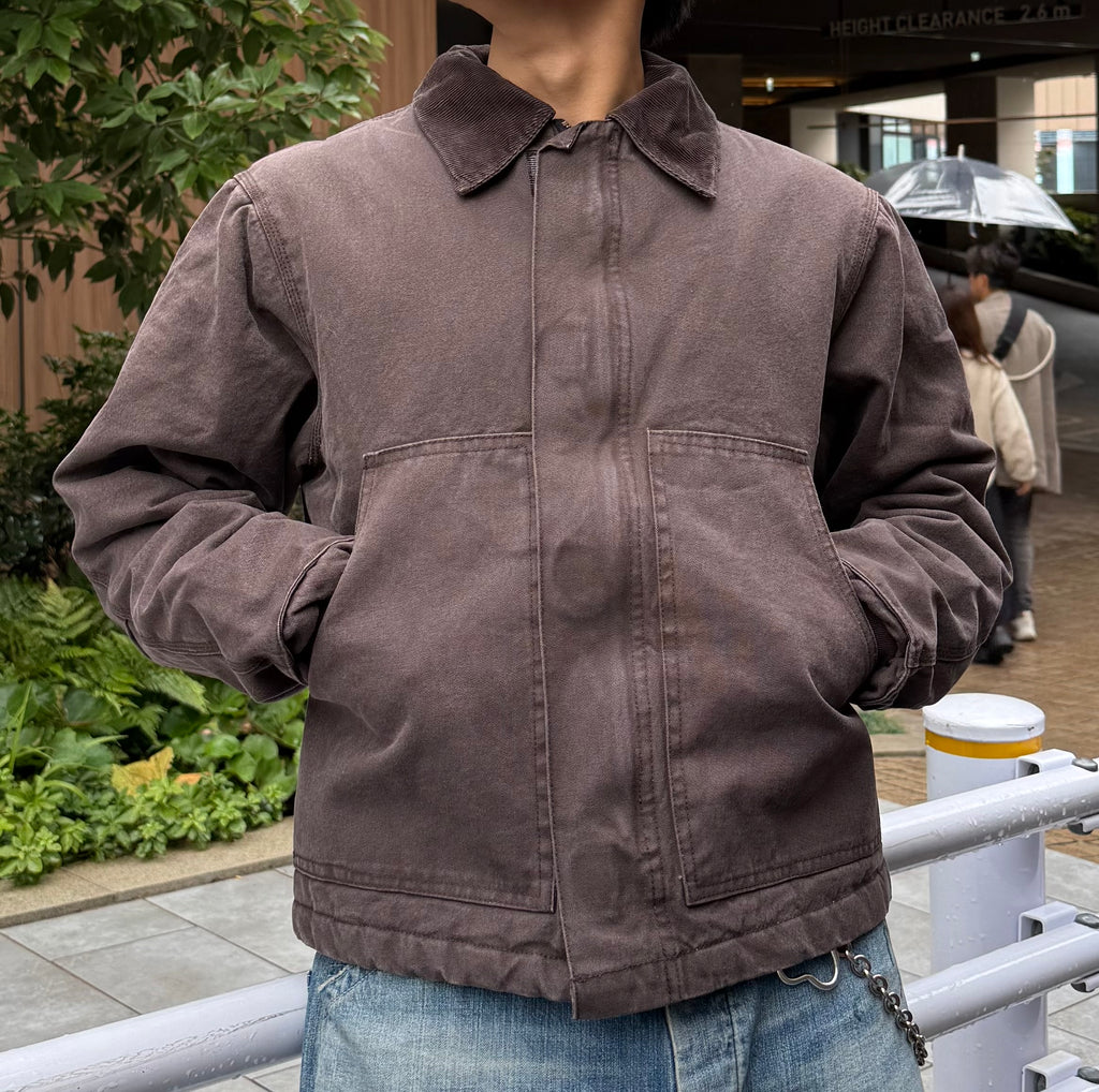 中綿入りでしっかり暖かい。ポイントは、あえての短丈ボックスシルエット。今日は極太のペイントデニムと合わせて、王道の「短×太」Y2Kワークスタイル。フーディーをレイヤードするのも、もちろんアリ。