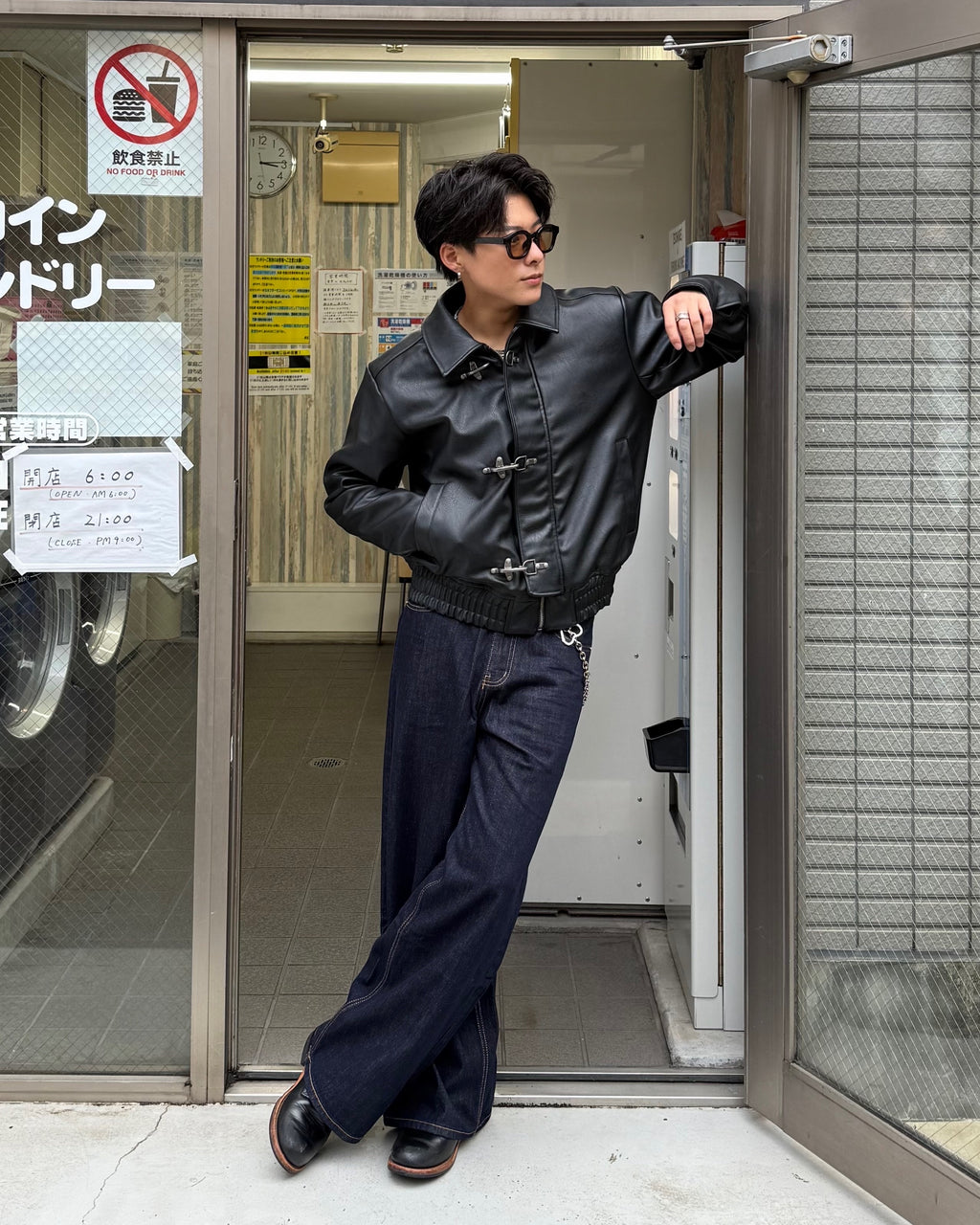 ノンウォッシュだから、これから育てるのも楽しみ。今日はあえて短丈のワークジャケットを合わせて、「短×太」のシルエットを意識。足元はスニーカーじゃなくて、あえてレザーシューズで締めるのが俺流。このバランスが今の気分。