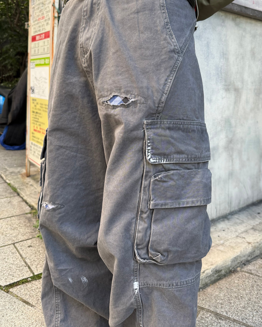 スプラッシュウォッシュとパッチの加工感がしっかり主張してくれるので、シンプルなトップスでも一気に雰囲気が出るカーゴパンツ。ワイドだけど落ち感がきれいで、動いた時のシルエットがかなり好みです。ミリタリーすぎず、ストリートにも振れるバランス感が絶妙で、レザーやニットなど合わせるアイテム次第で印象を変えられるのも魅力。穿くだけでコーデが完成する一本です。