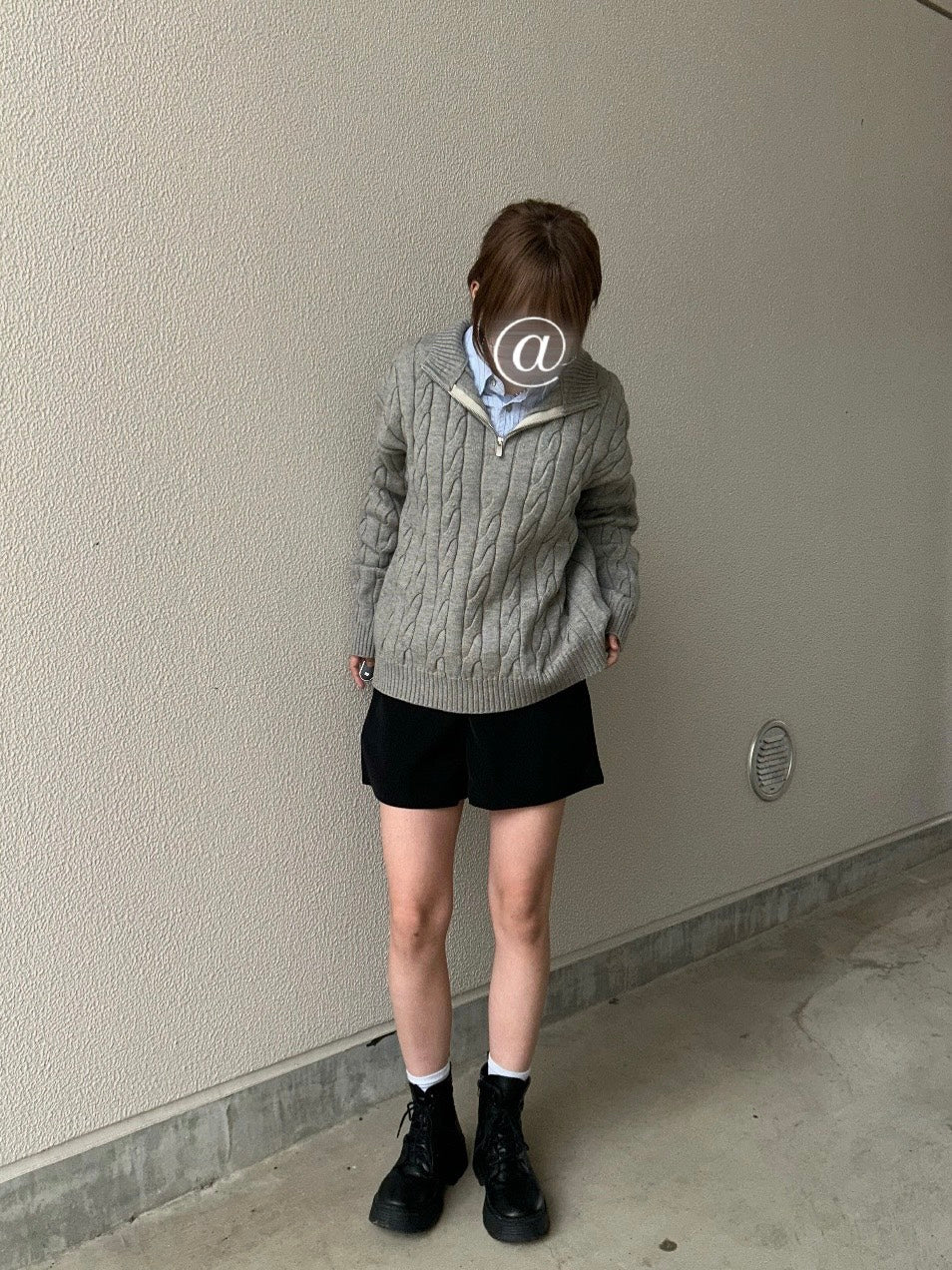 今日はあえて水色のシャツをレイヤードして、プレッピーに着こなすのがポイント。ジップを開けて襟をしっかり見せるのがマイルール。トップスにボリュームがある分、ボトムスは黒のショーパンでスッキリ。足元はゴツめのブーツで重さを出して、甘すぎないスクールガールスタイルの完成。