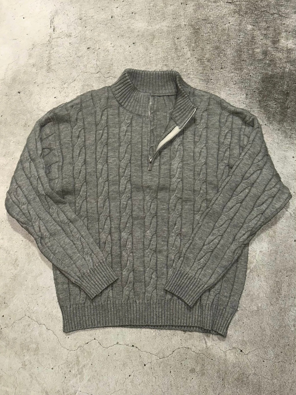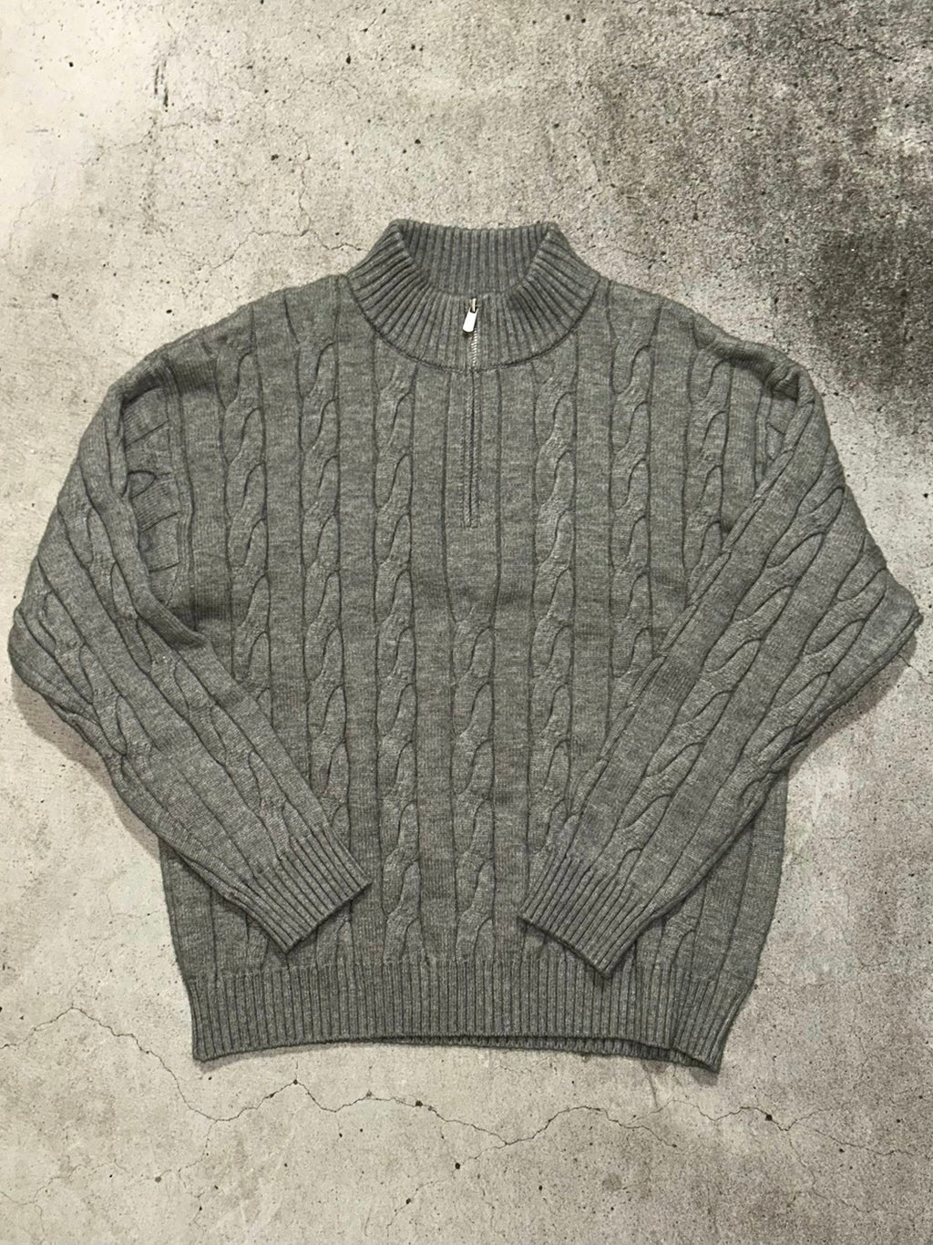 このケーブル編みのハーフジップニットは、メンズライクなゆるっと感が今の気分。