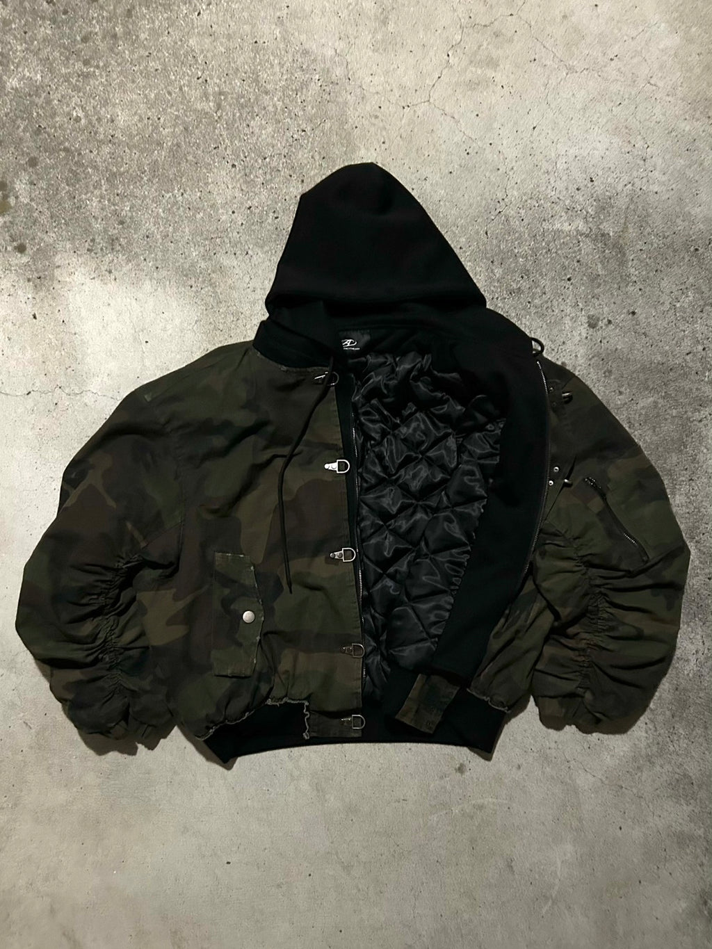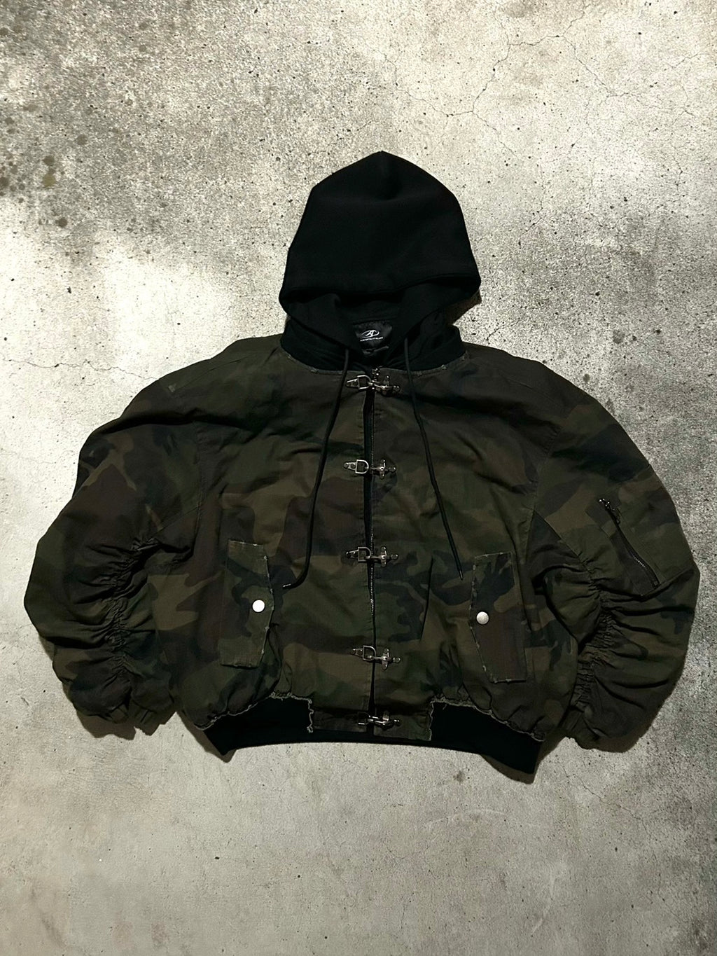 このファイヤーマンジャケットは、カモフラ柄にフードのレイヤードデザインがたまらない。