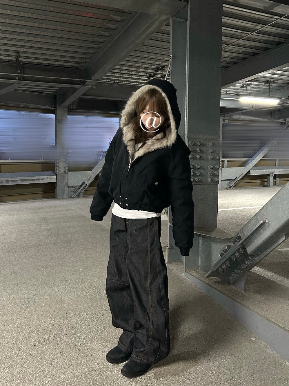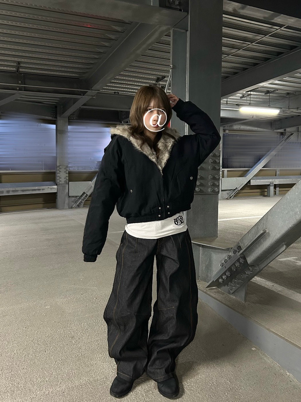 しかも、あえてのショート丈。だから、ボトムスは超極太のワイドデニム一択。この「短×太」のシルエットが、Y2Kストリートの黄金バランス。インナーの白Tをチラ見せするのも計算済み。