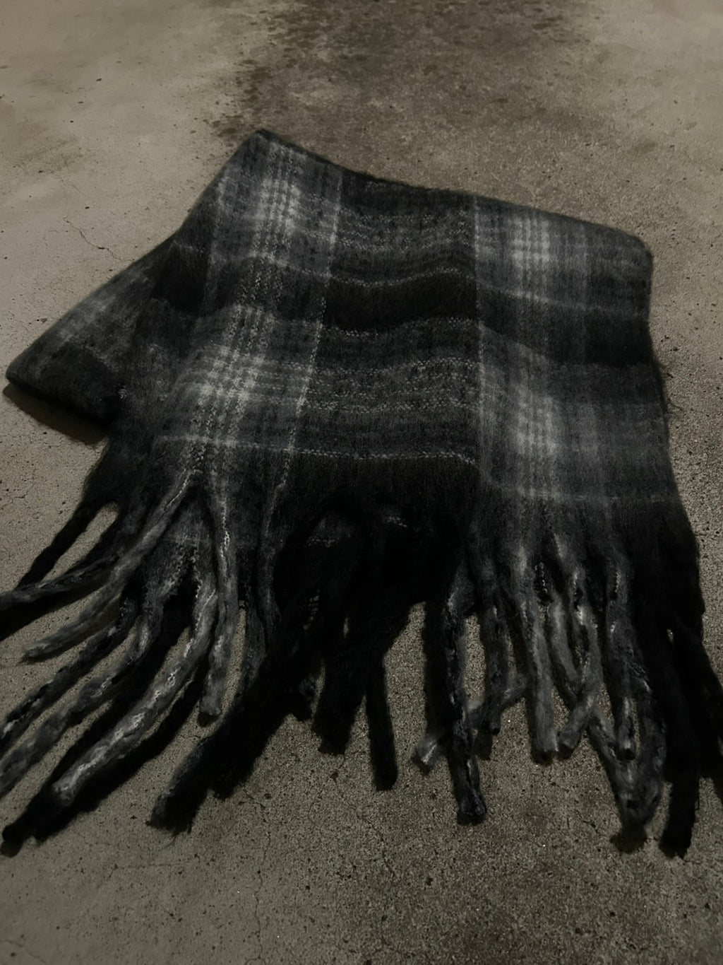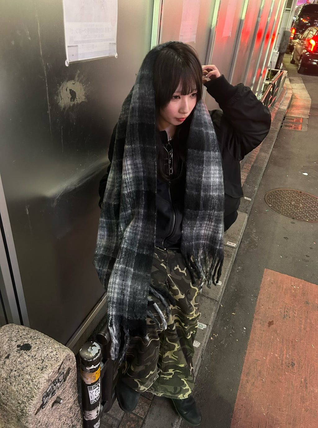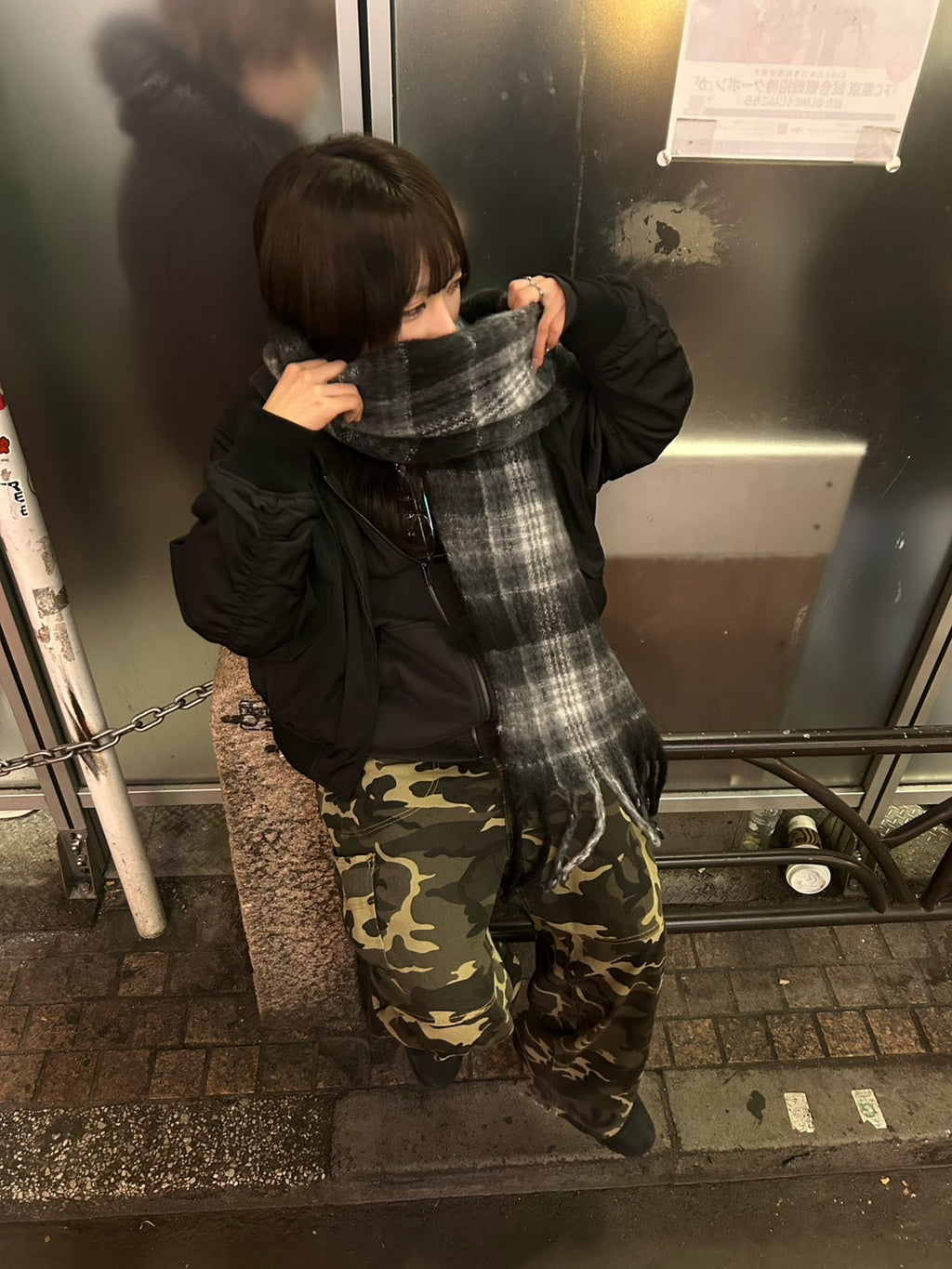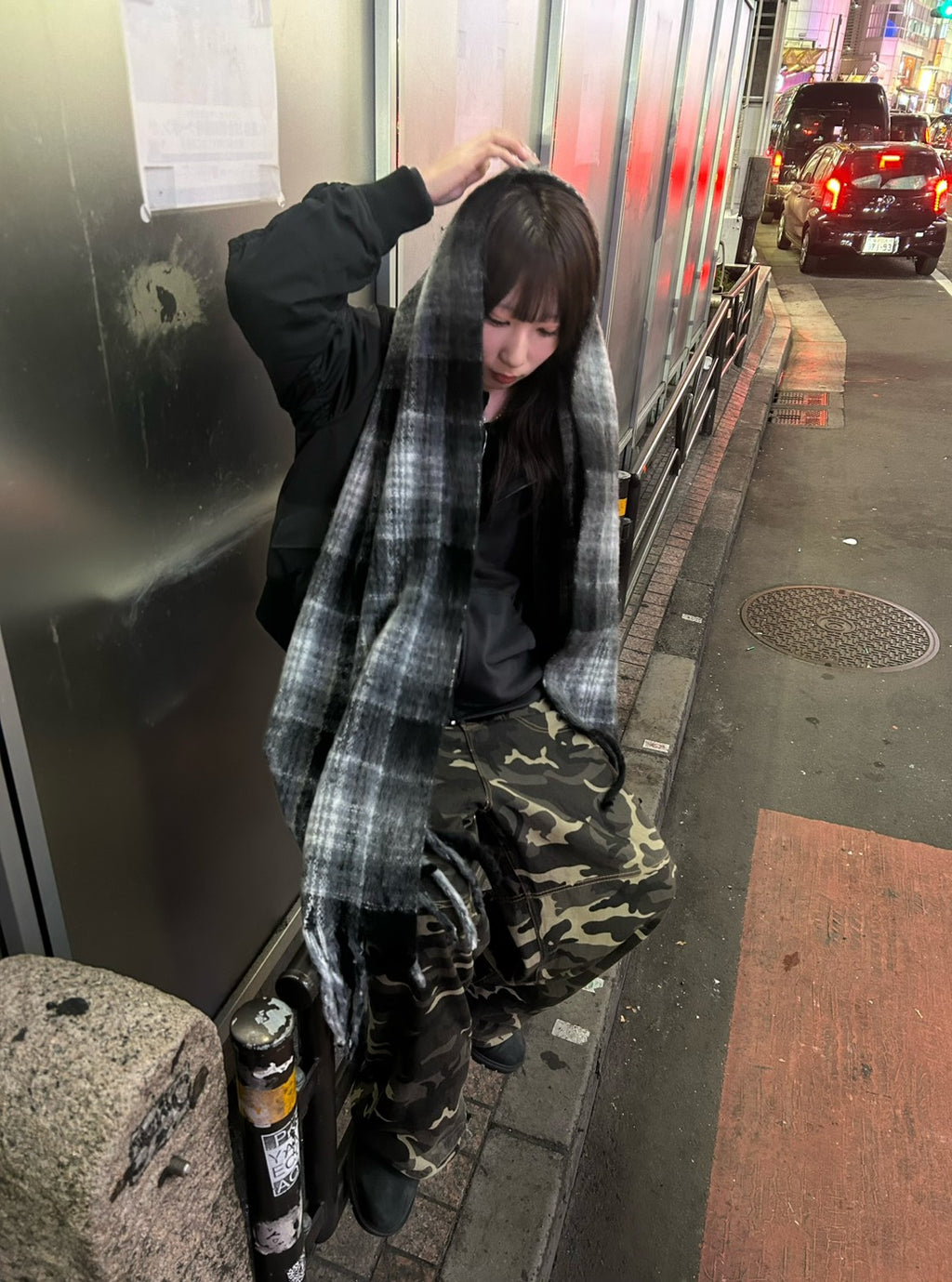 グレーシャームードの落ち着いた色味が、夜の街の光と相性よくて気に入っています。大判でざっくり巻くだけで雰囲気が出るから、カモ柄パンツみたいな強めボトムとも馴染んでくれる万能ストール。肩から被るだけでも一気にムードが出ます。