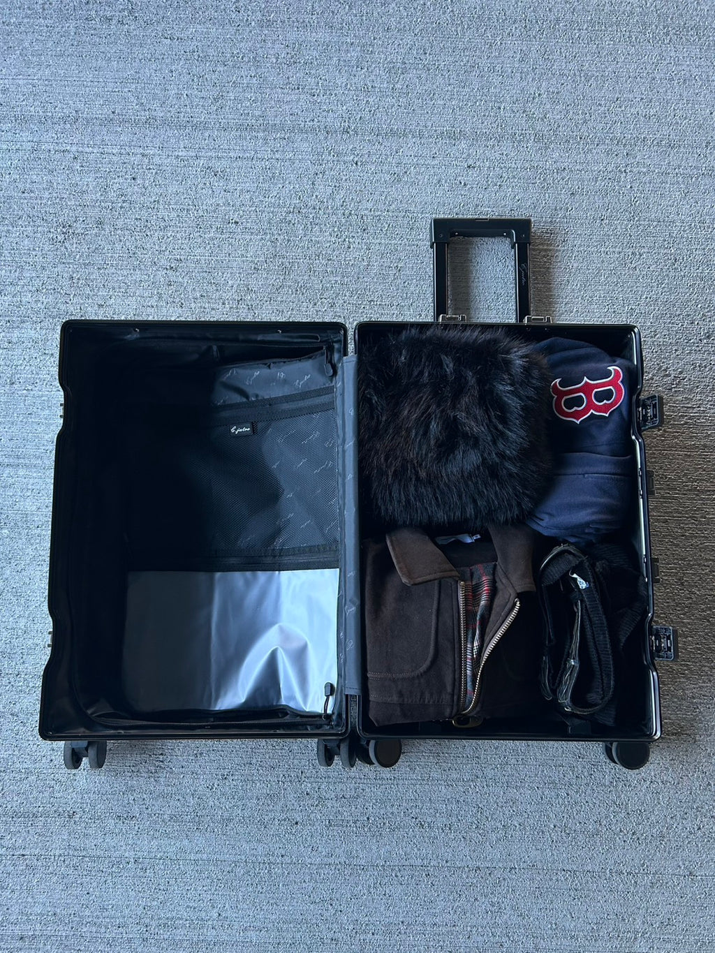 【内装】キャリーバッグ開閉時の荷崩れを防ぐため高品質ポリエステルの仕切りとクロスベルトがついています。仕切りには使い勝手の良いダブルファスナーを採用、さらに2つのメッシュポケットがついているので小物類の収納もしやすく一目でどこにあるかがわかるので使い勝手も抜群です。