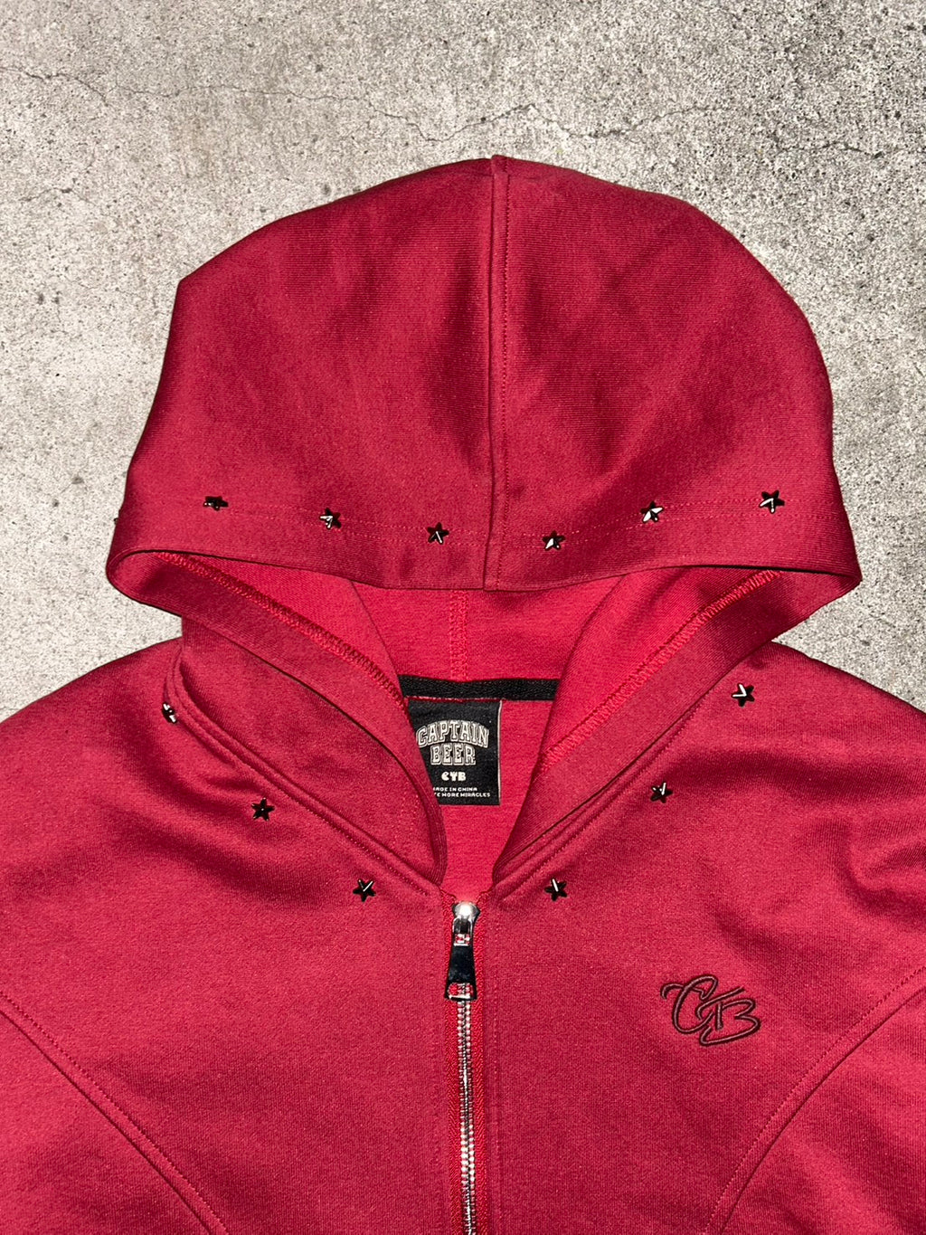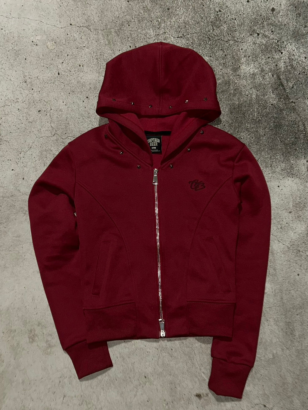 深めのボルドーカラーが大人っぽくて、フードと胸元に散りばめられたスタッズがさりげなく主張してくれるの。