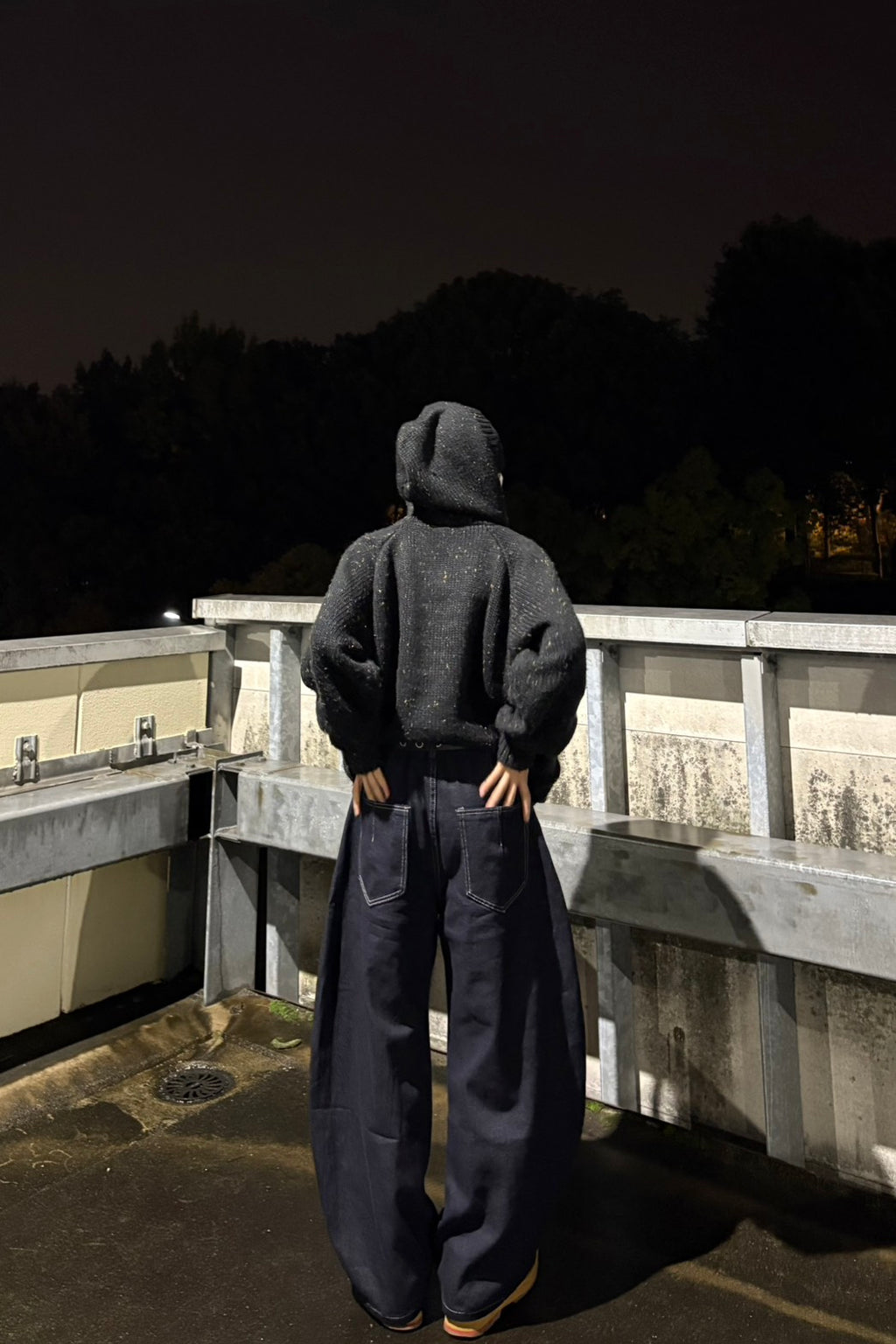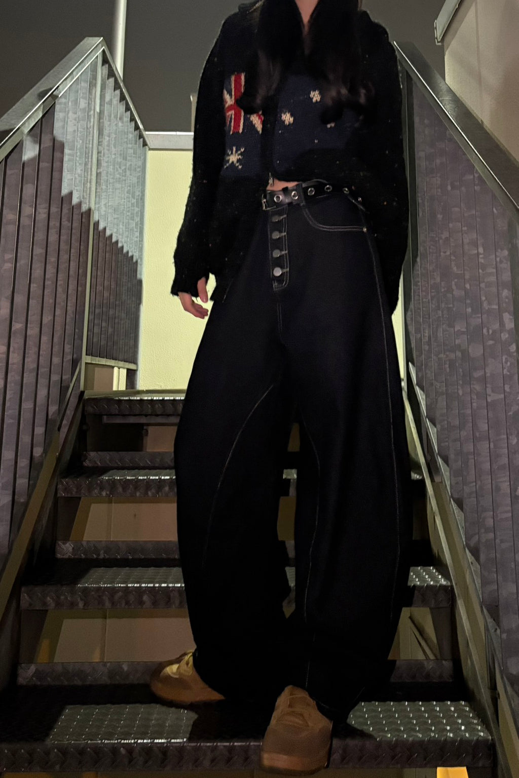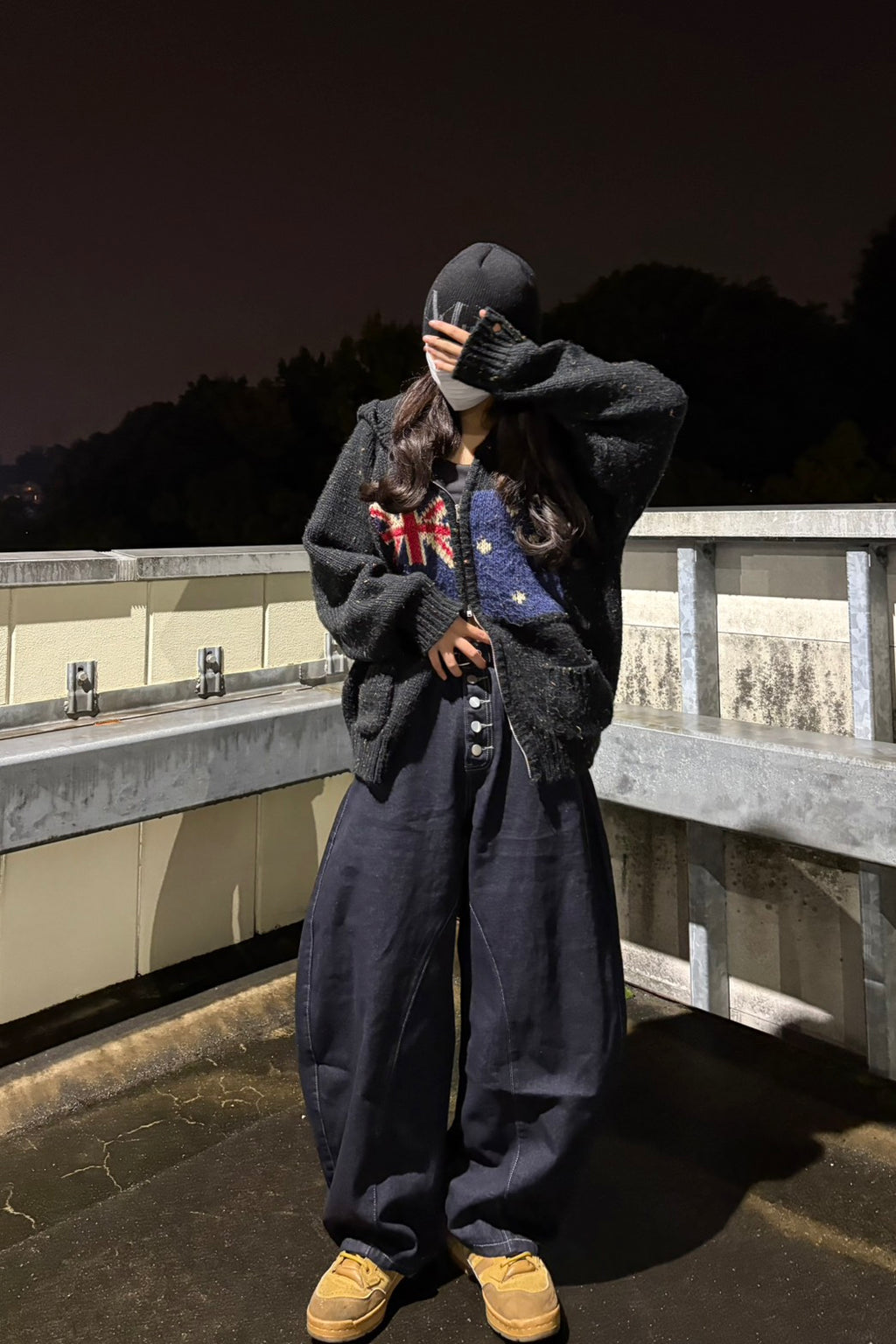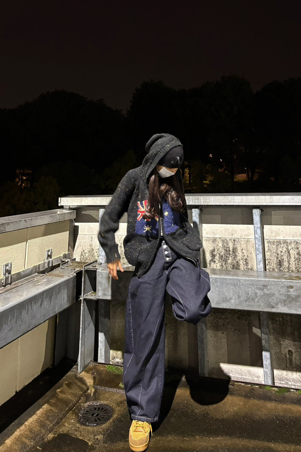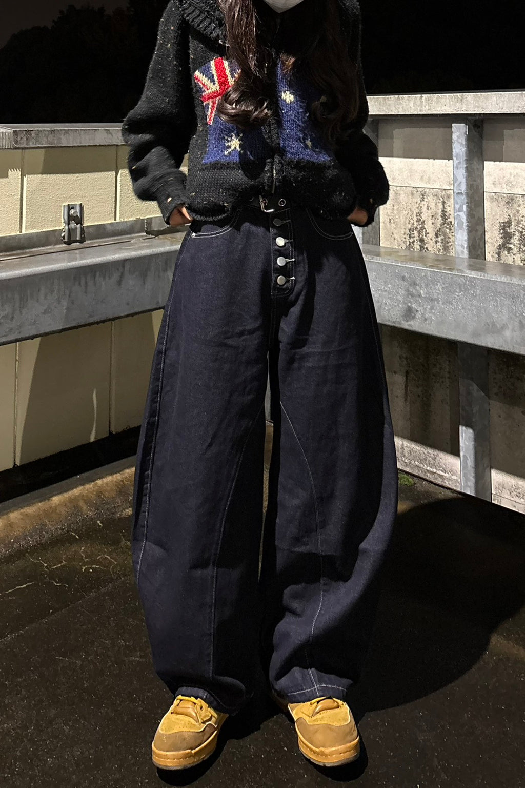 このシルエットがたまらない。フロントのボタンフライもこだわりポイント。今日はあえて柄ニットベストにざっくりしたフーディーを羽織って、とことんルーズに。この「ゆる×ゆる」のバランスが鍵。足元はあえてのイエロースニーカーで、重くなりすぎないように色を差すのがマイルール。