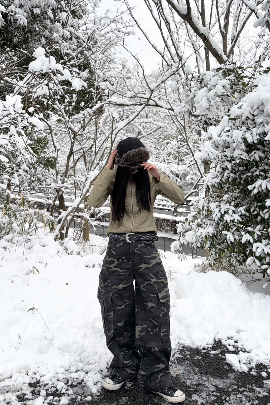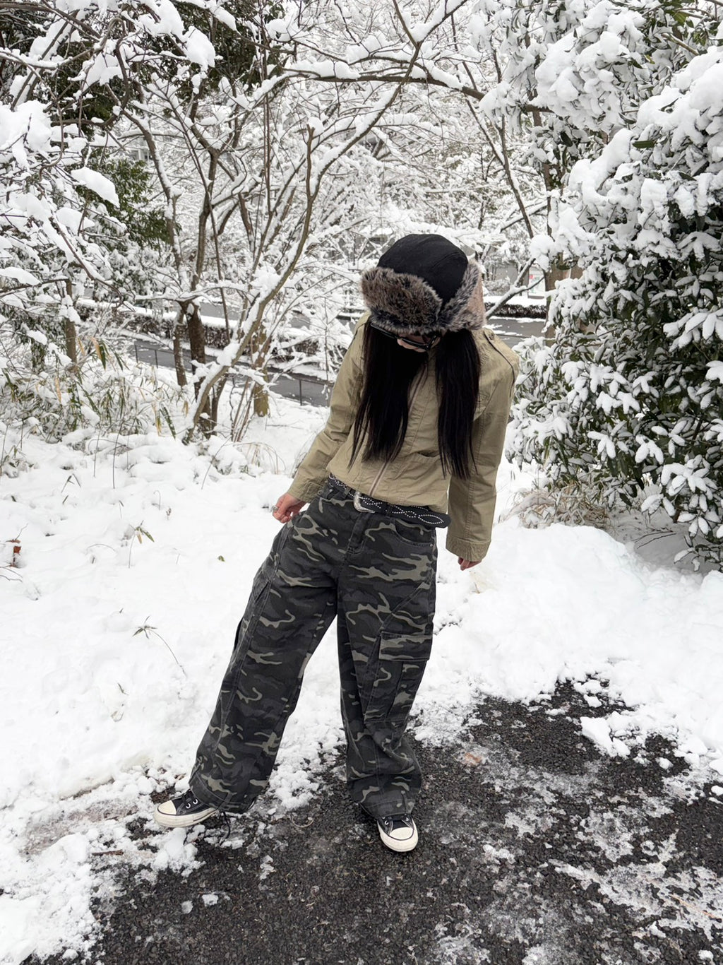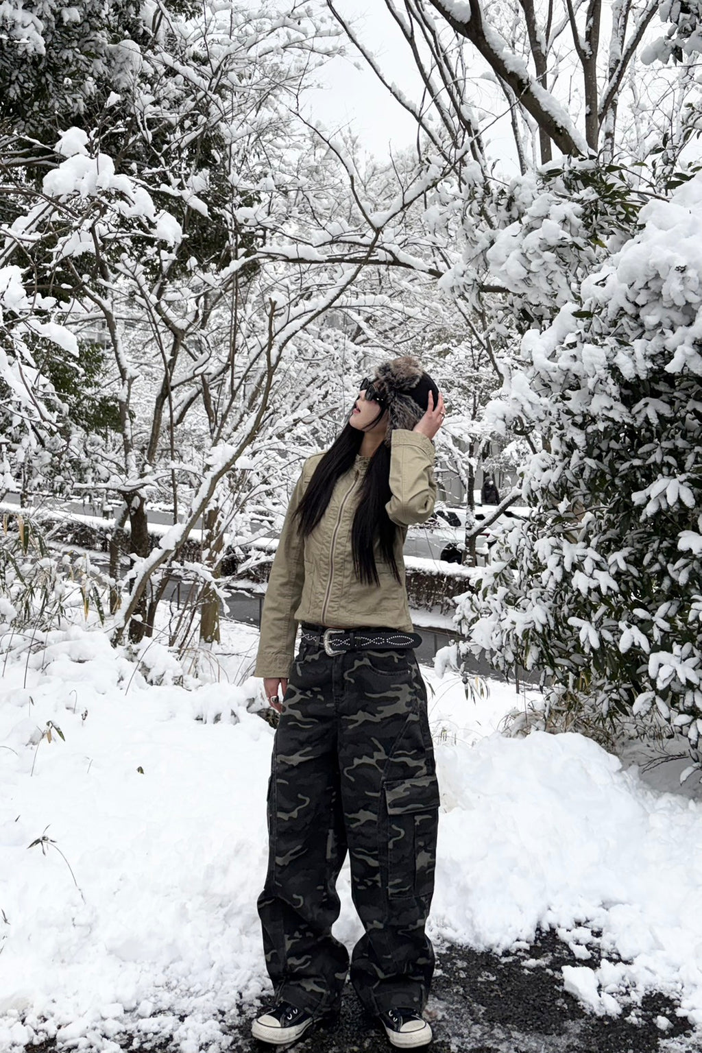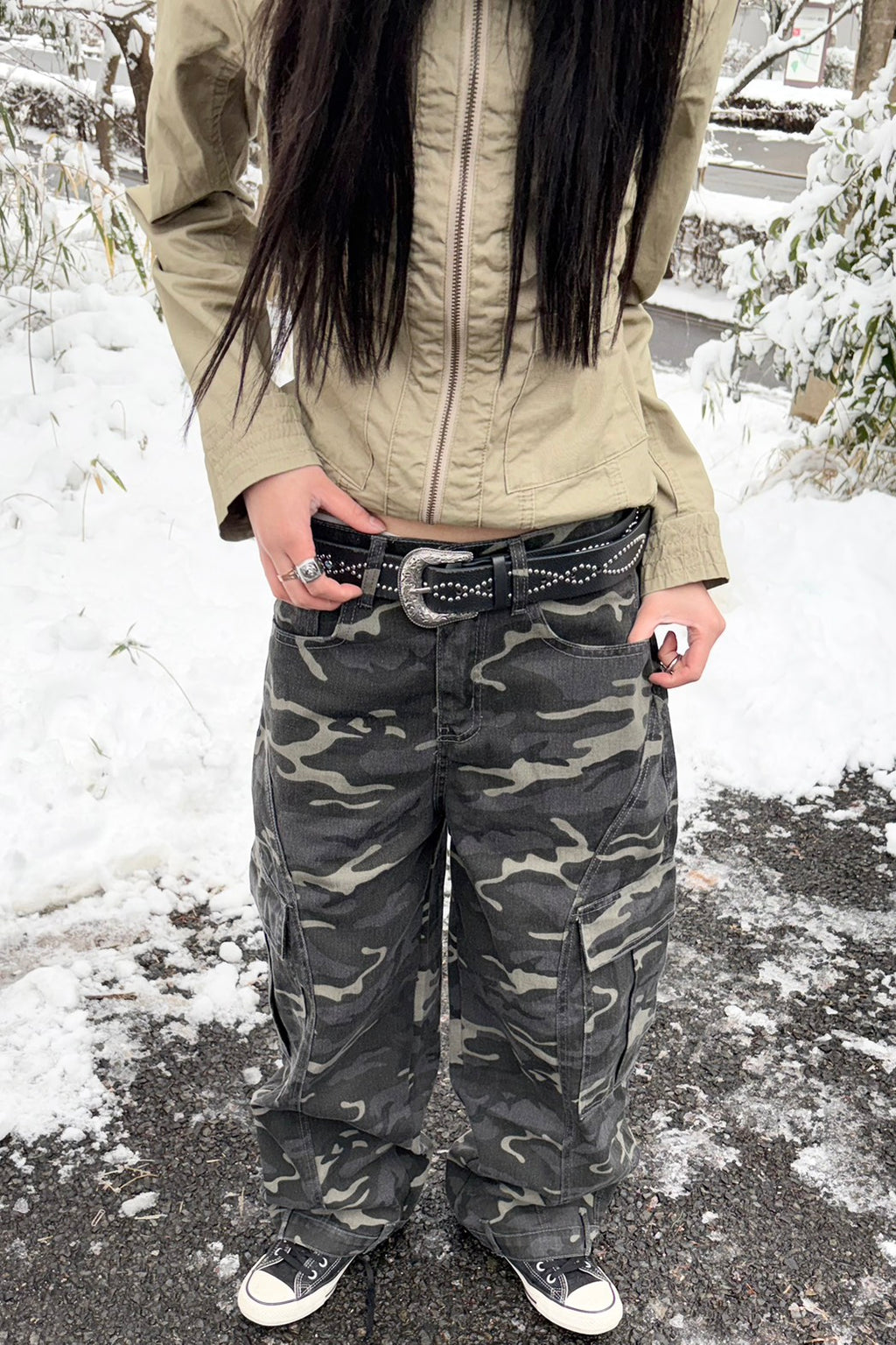 ウォッシュ加工を施した迷彩柄が、奥行きのある表情を生み出すワイドカーゴパンツ。