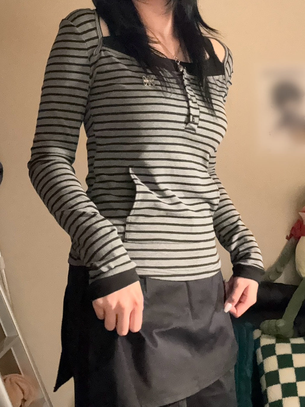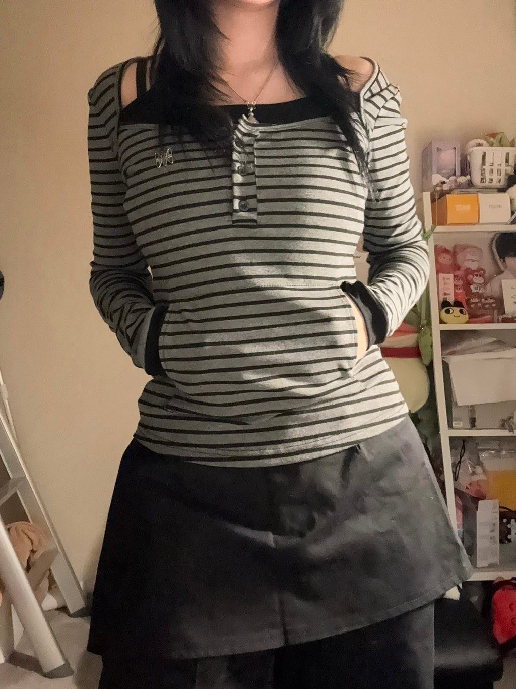 このフェイクレイヤードTは、オフショルでヘルシーな肌見せができるのがお気に入り。ピタッとするタイトなシルエットとボーダー柄が、一気にY2Kムードを加速させる。今日は黒のミニスカートと合わせて、とことんコンパクトに。あえてネックレスを重ね付けして、首元を盛るのがマイルール。グランジっぽくも着こなせる一枚。