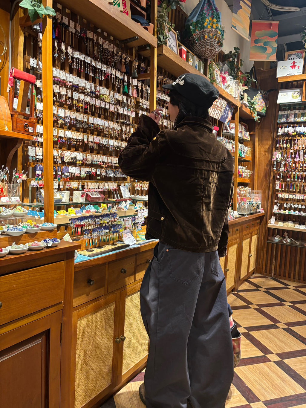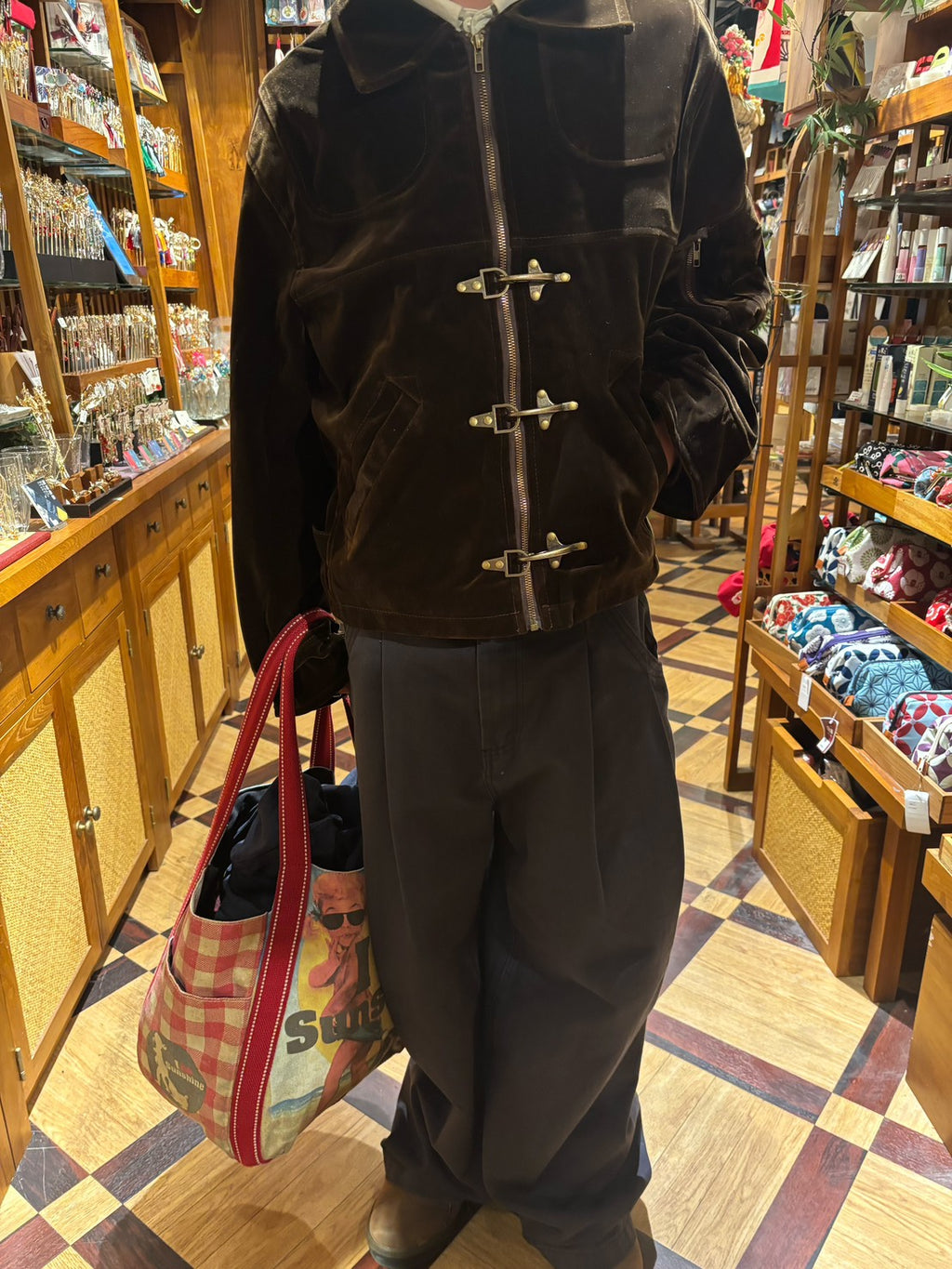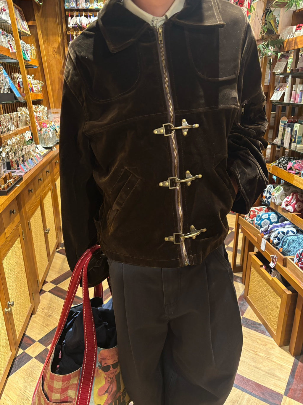 レトロなファイヤーマンジャケットは、あえての短丈がキモ。今日は超極太のワイドパンツを合わせて、「短×太」のアンバランスなシルエットで遊ぶのがトレンド。このバランスが今の気分。羽織るだけでコーデが決まる。