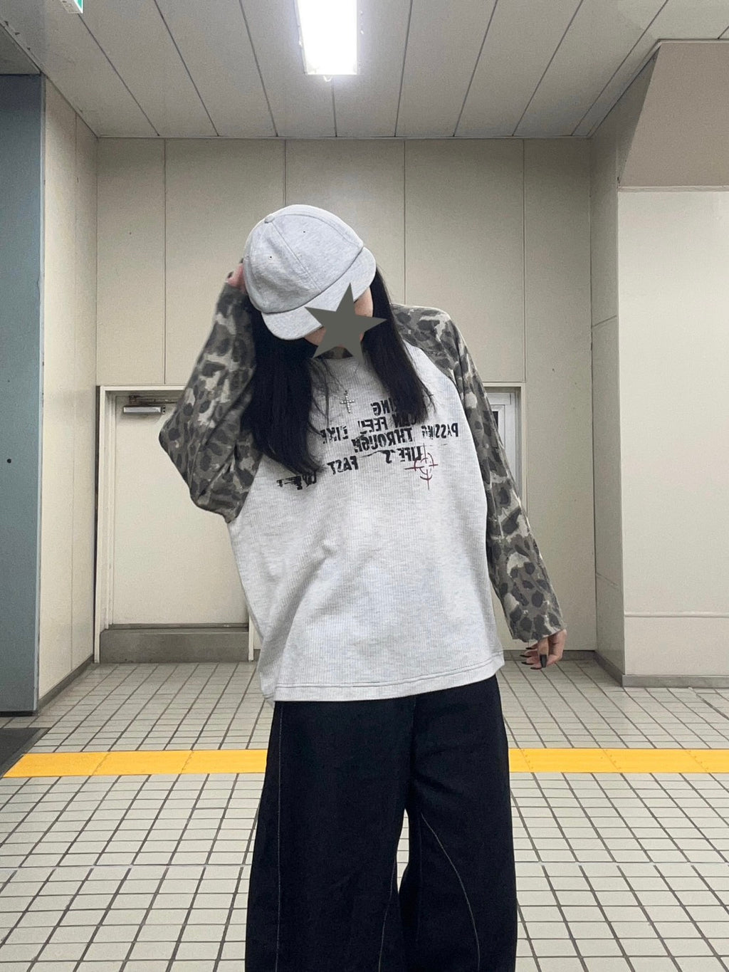 ラグランだからラフに着れるのがお気に入り。今日はあえて黒の極太ワイドパンツを合わせて、とことん「ゆる×ゆる」なシルエットを楽しむのがマイルール。フロントのグラフィックも、グランジなアクセント。キャップを被れば、Y2Kストリートスタイルの完成。