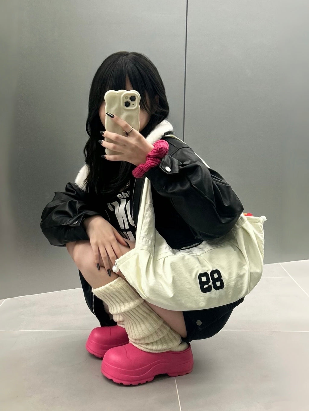 今日はインナーにグラフィックTを合わせて、ボトムスはミニ丈でコンパクトに。この「辛口レザー×甘めボア」のバランスが今の気分。モノトーンでまとめつつ、手首のピンクシュシュでY2Kな遊び心をプラスするのがマイルール。