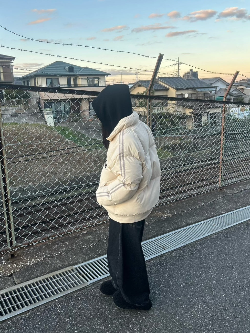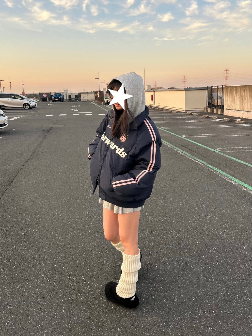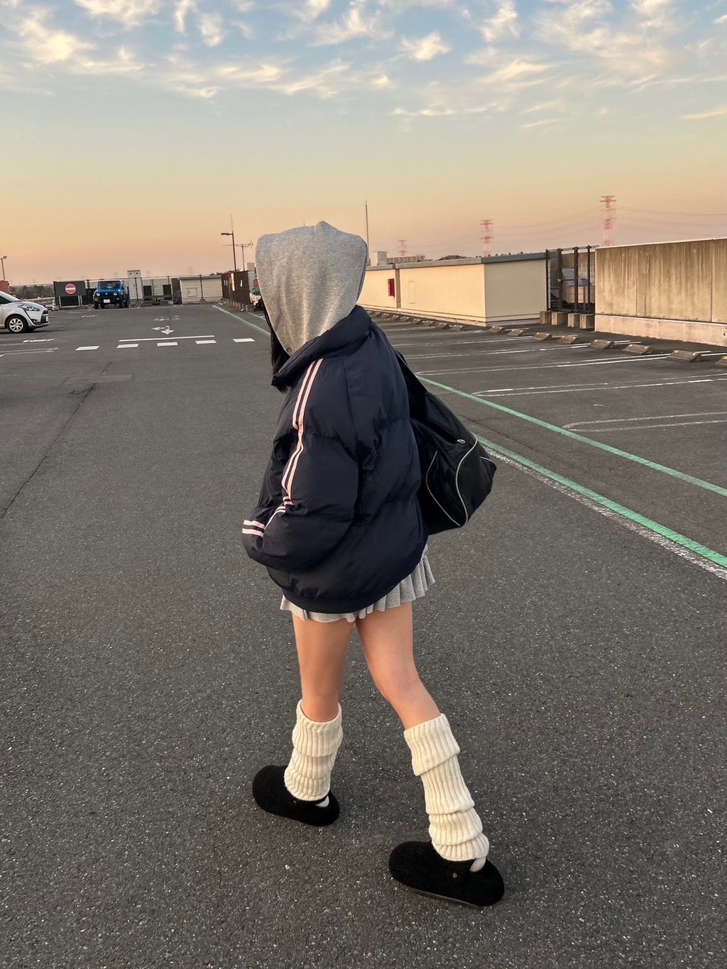 ライン入りの配色がスポーティなのに、丸みのあるシルエットで可愛く着られるのが好き。スタンドカラーで首元まで暖かく、パーカーを重ねてももたつかないのが嬉しいポイント。ミニボトムと合わせると一気にバランスが取れて、冬でも軽さのあるスタイルに。