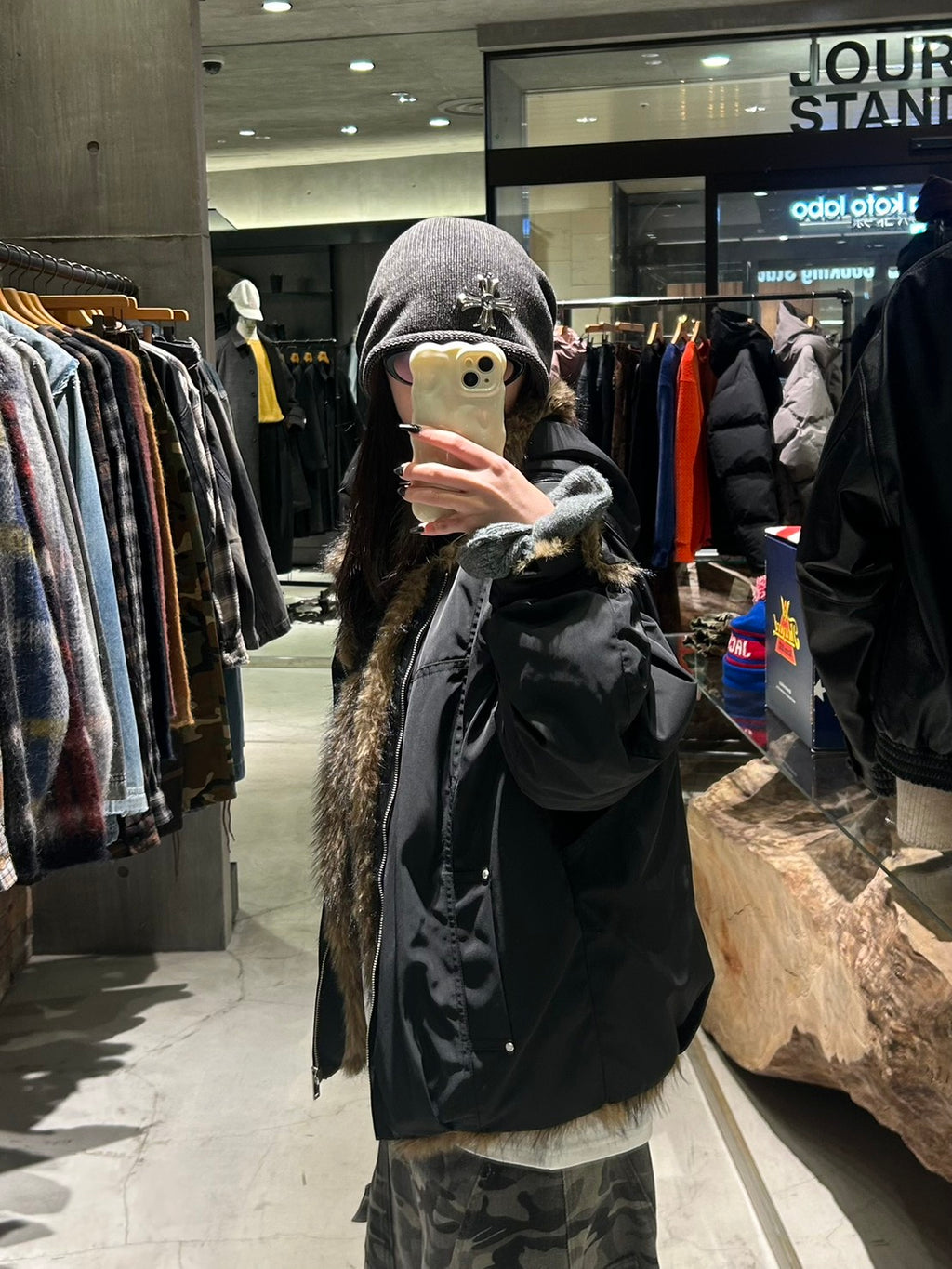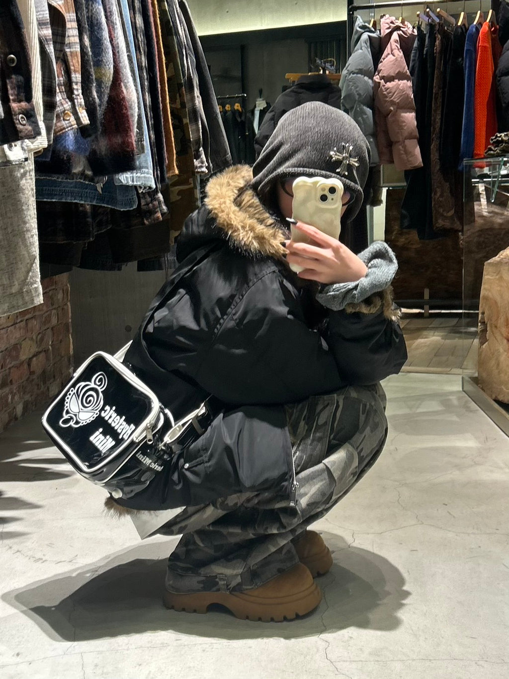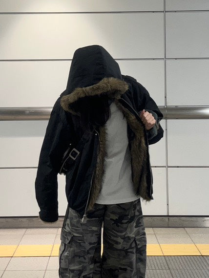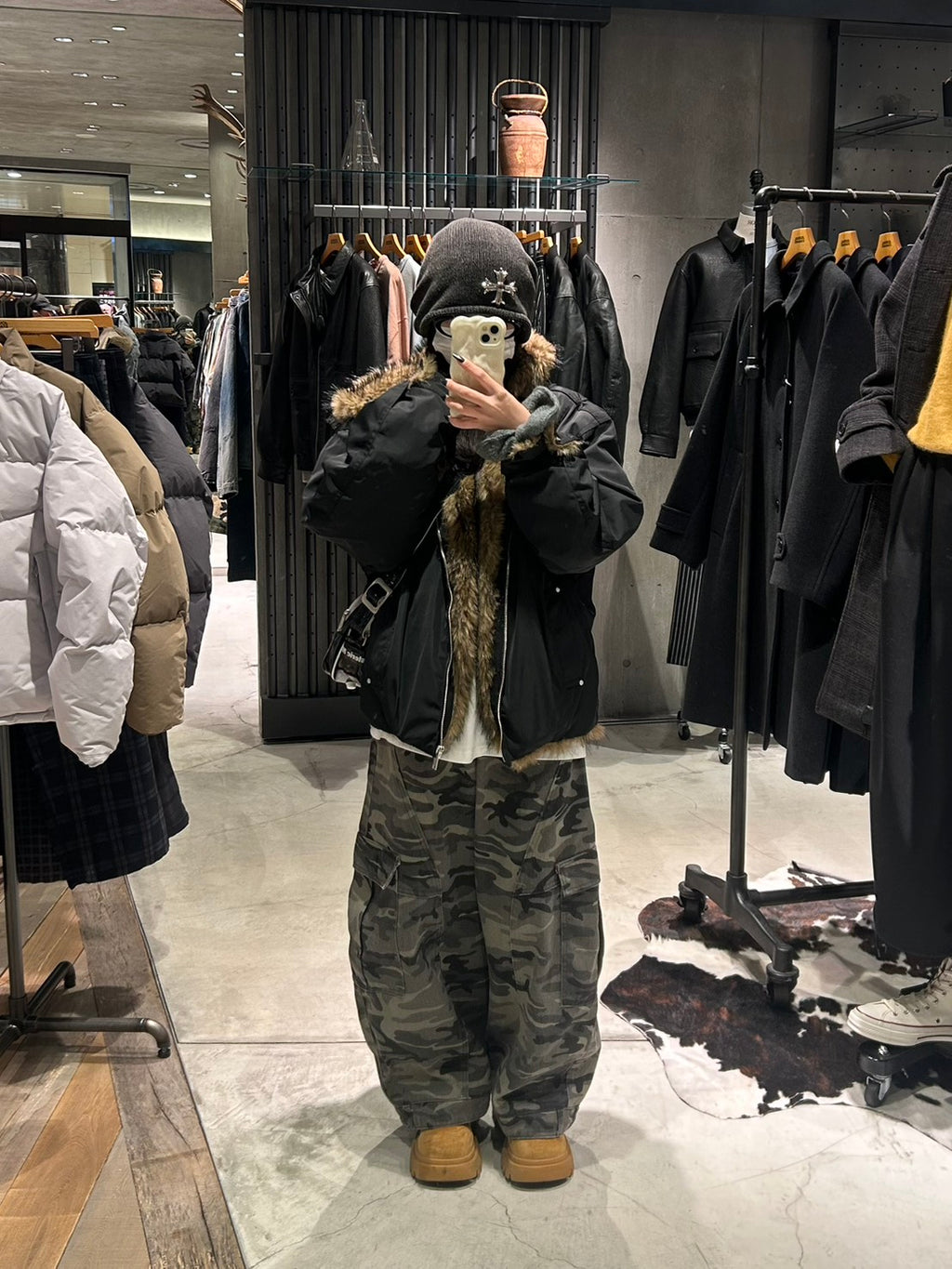 アメリカンヴィンテージ感のあるデザインとファーフードのボリュームが主役になるパデッドジャケット。しっかり暖かいのに重たく見えず、ワイドパンツとも相性抜群です。カモ柄と合わせて無骨さを出しつつ、インナーはシンプルにしてバランスを取るのが今の気分。