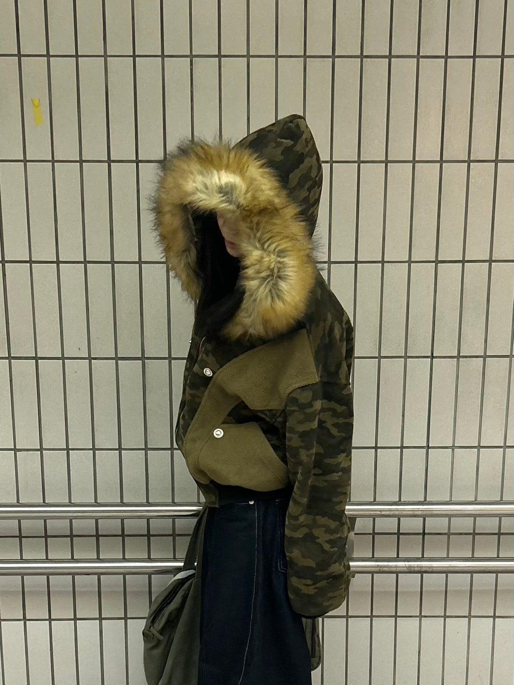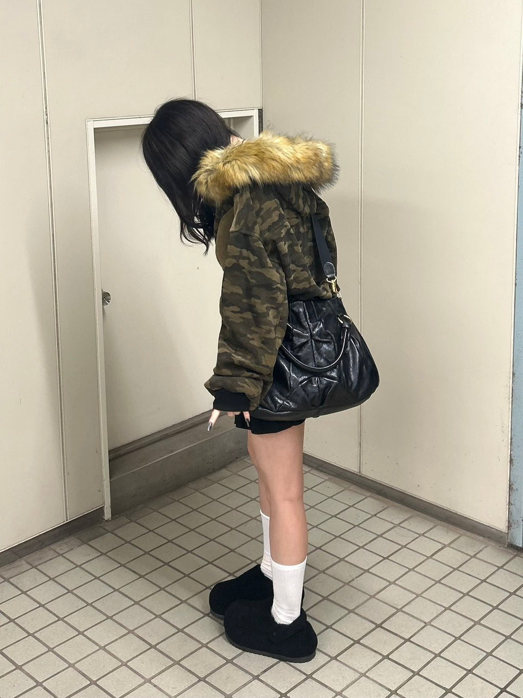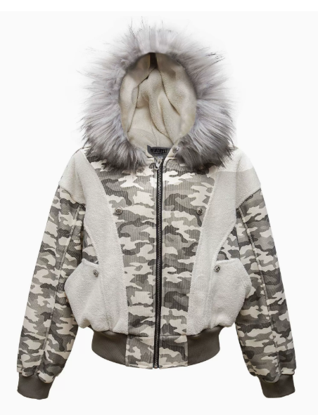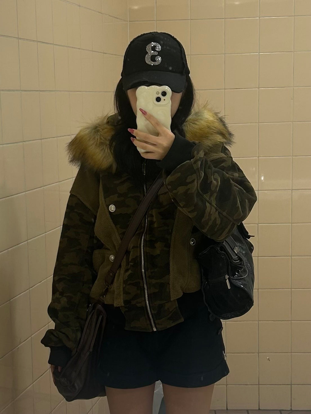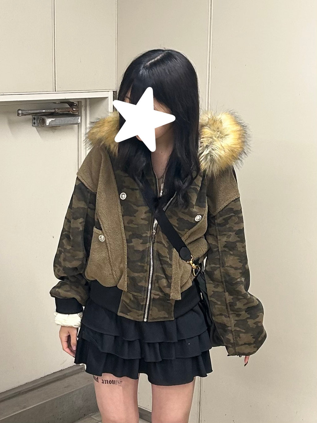 これは、”纏うコラージュアート”。カモフラ、ボア、そして艶やかなファー。異なる素材と質感を、大胆に、そして緻密に配置した。一枚で、幾重にも重なる、豊かな物語を、あなたのスタイルに。