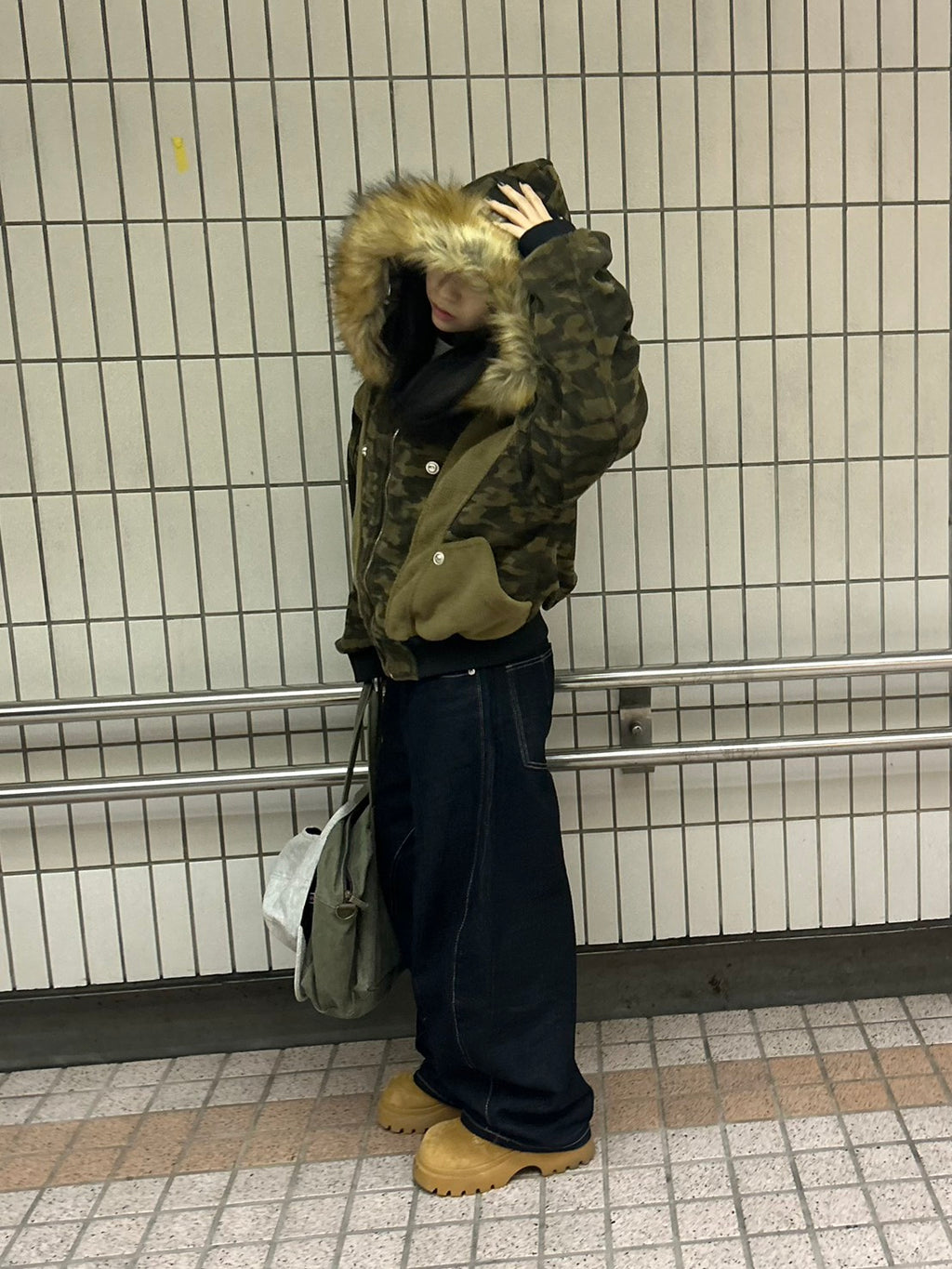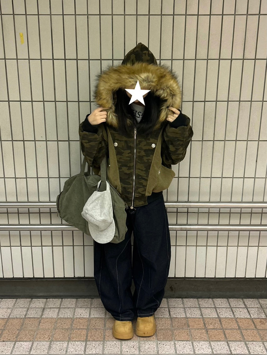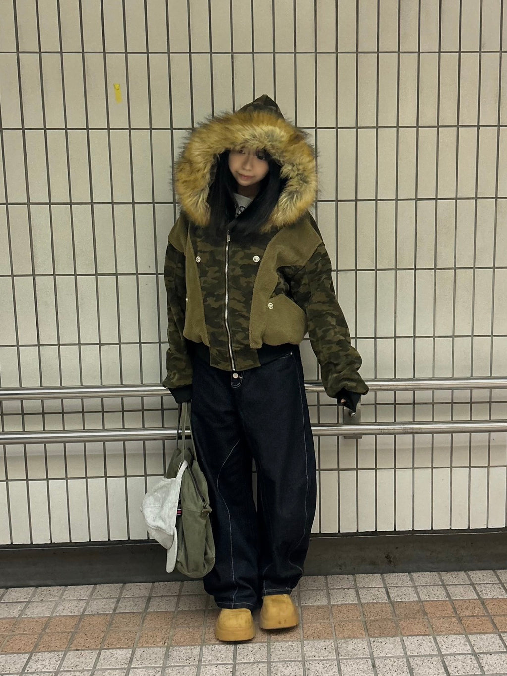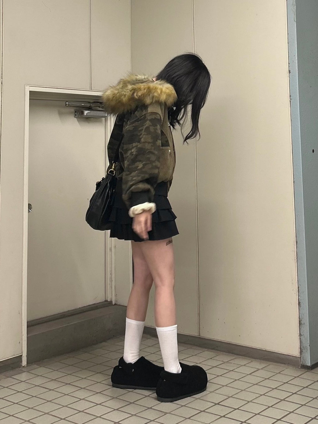 これは、”纏うコラージュアート”。カモフラ、ボア、そして艶やかなファー。異なる素材と質感を、大胆に、そして緻密に配置した。一枚で、幾重にも重なる、豊かな物語を、あなたのスタイルに。