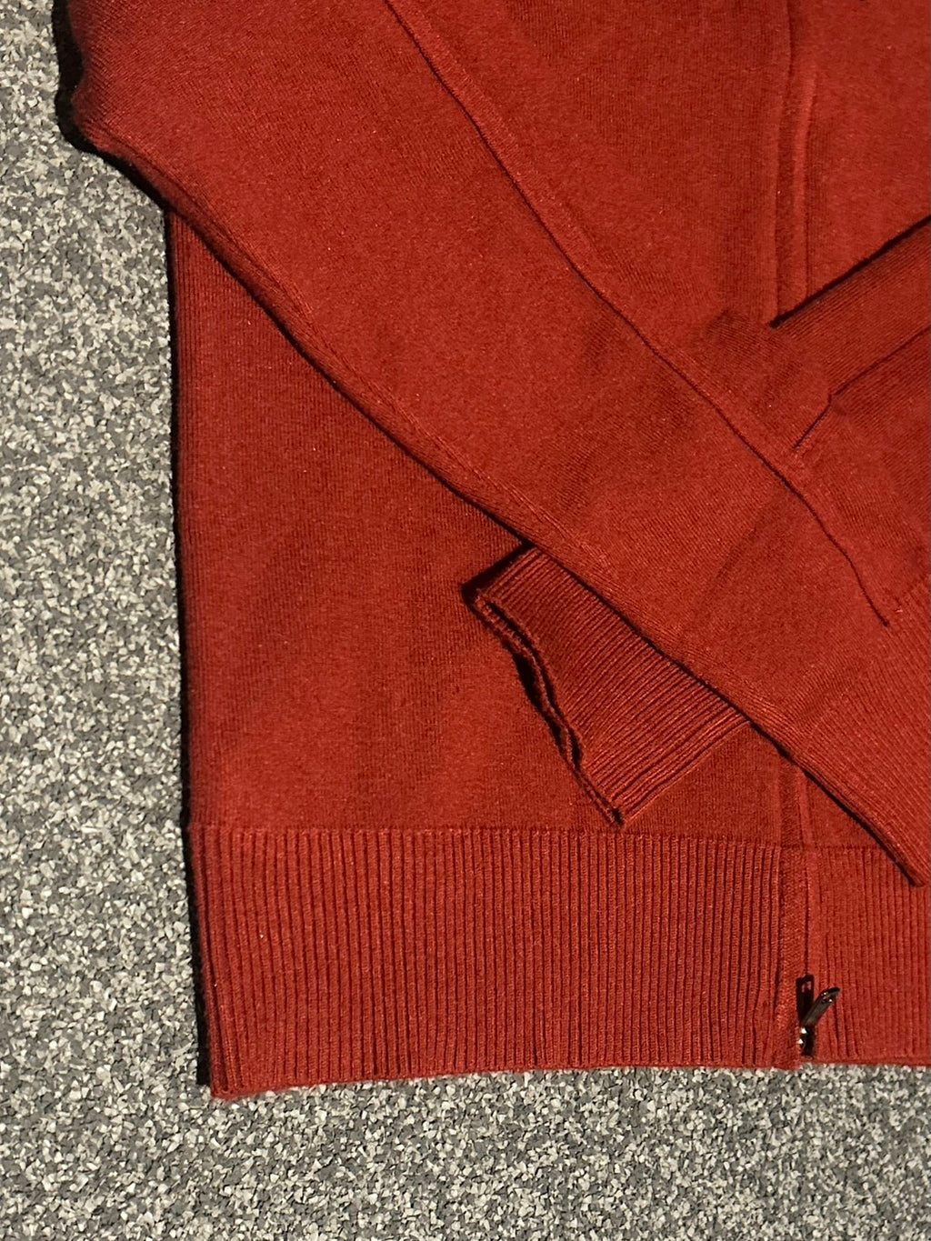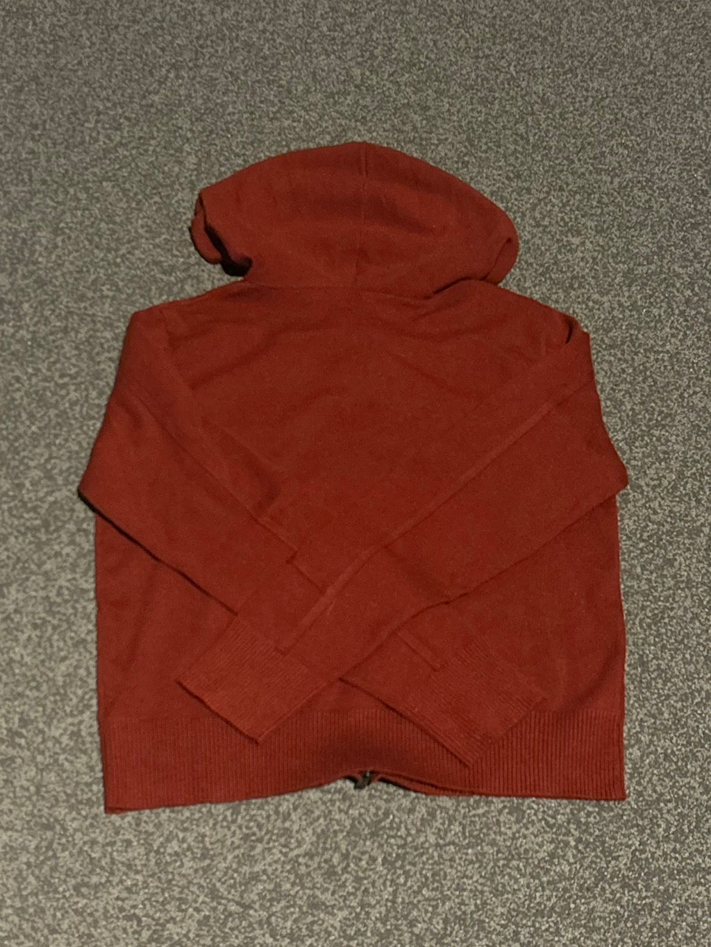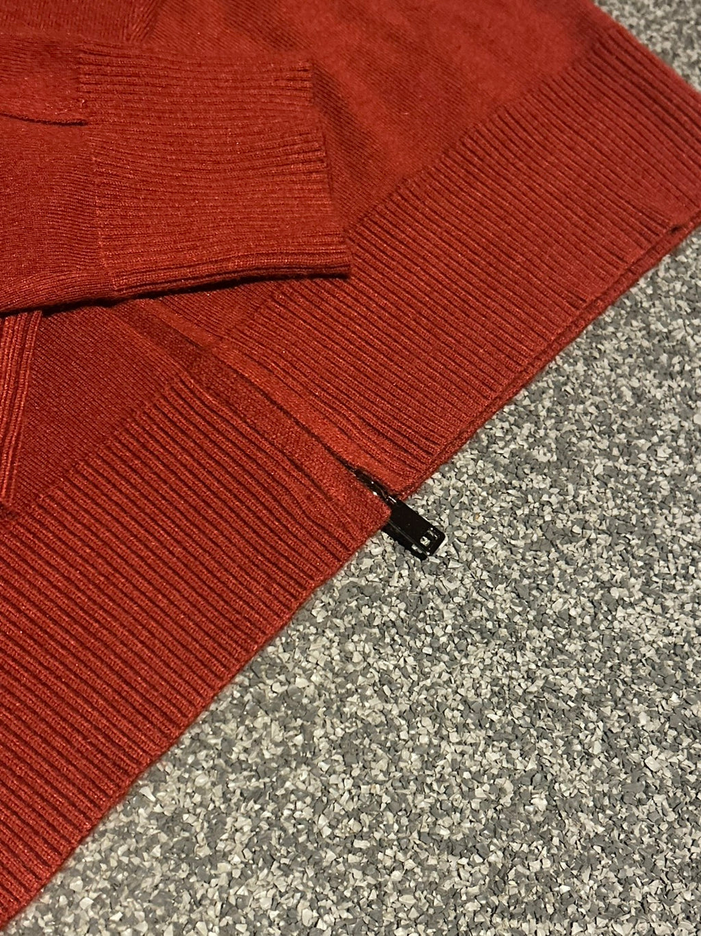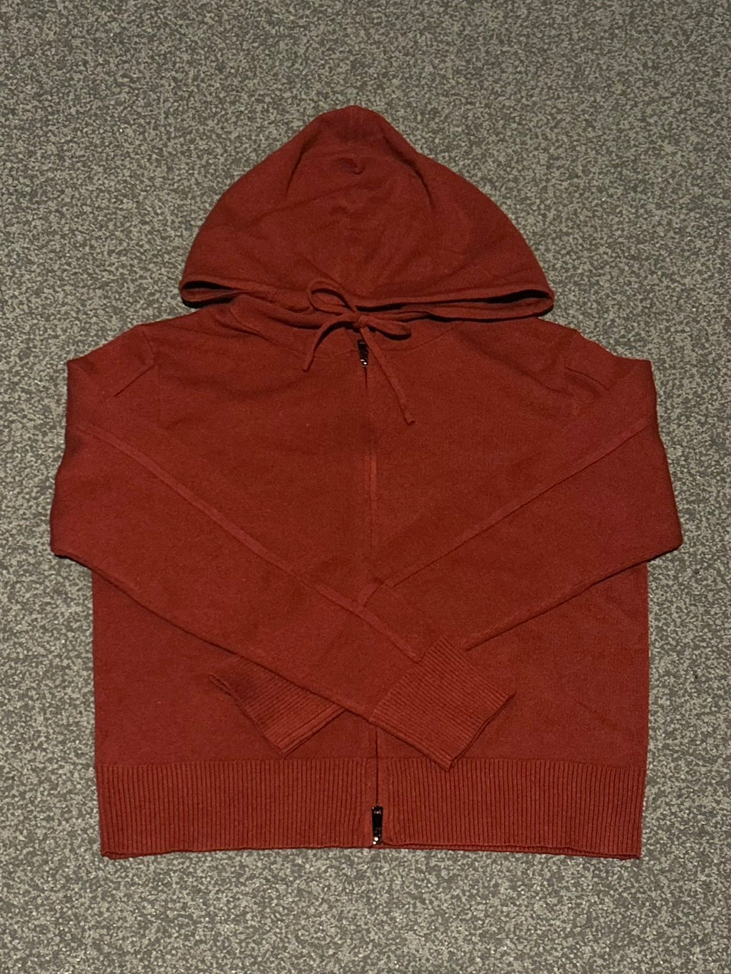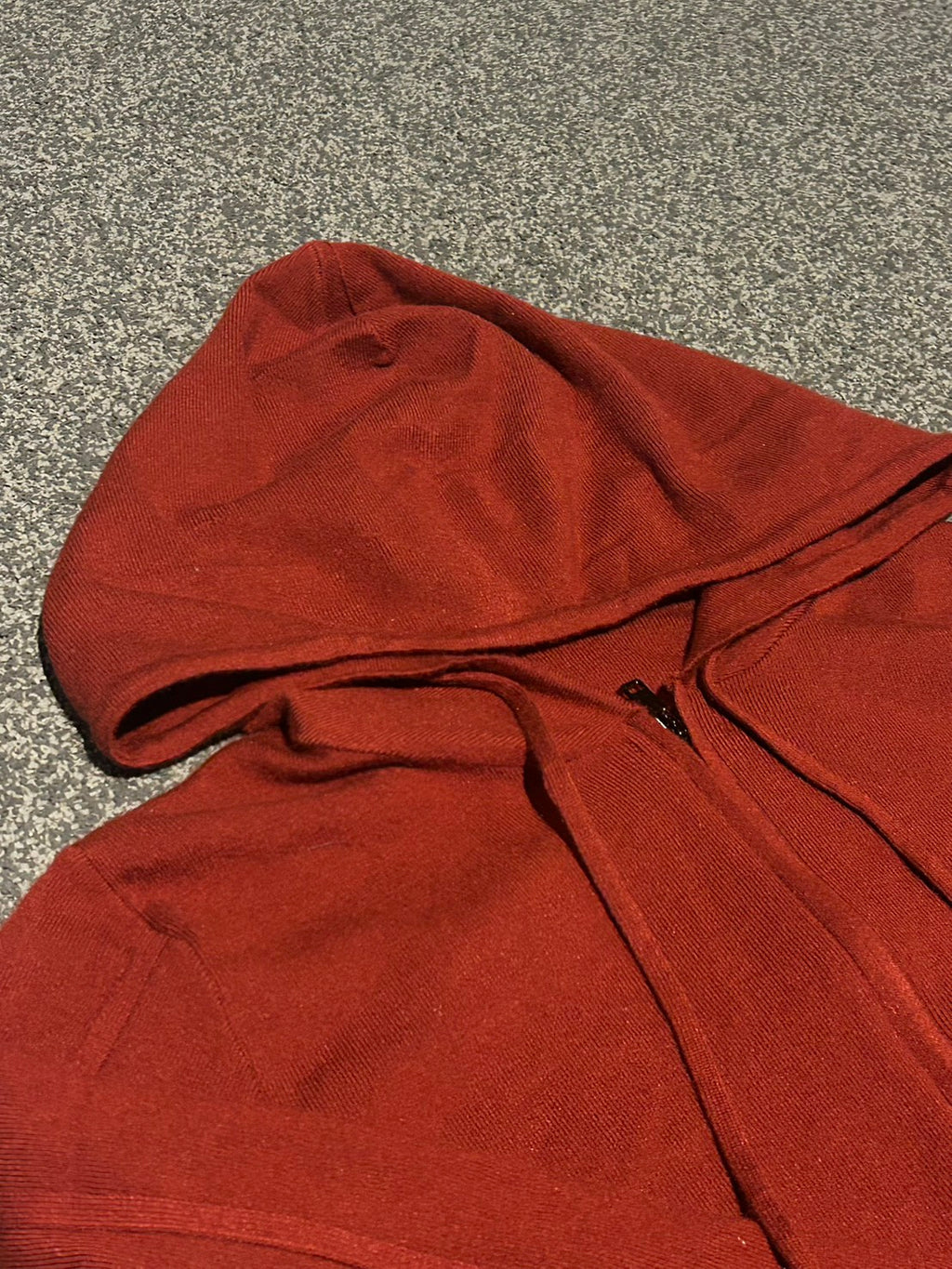 深みのあるレッドカラーのニットパーカーは、ほどよくルーズなシルエットで抜け感があり、
