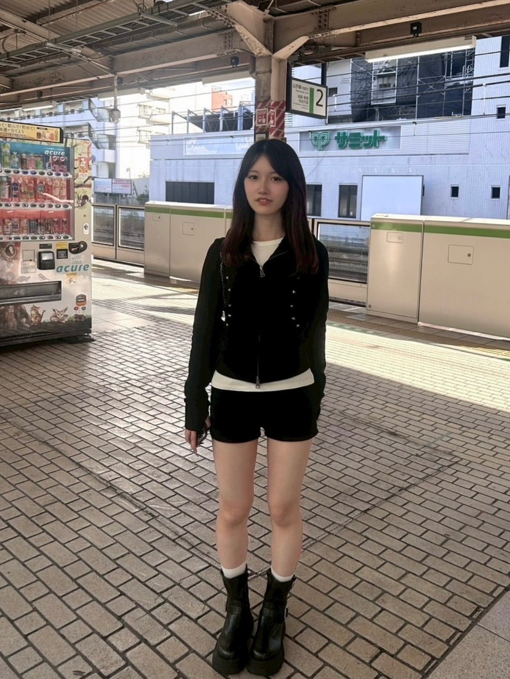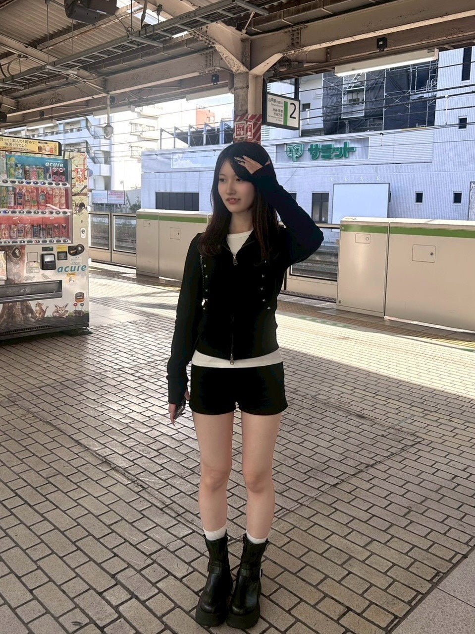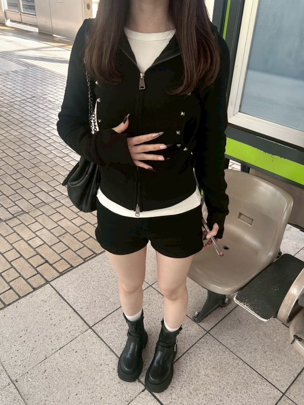 なんといっても、このスタッズが辛口でいいアクセント。今日はショーパンと厚底ブーツで、とことんコンパクトなギャルコーデ。白Tをインナーに覗かせて、抜け感を出すのがマイルール。袖の指穴デザインもポイント。