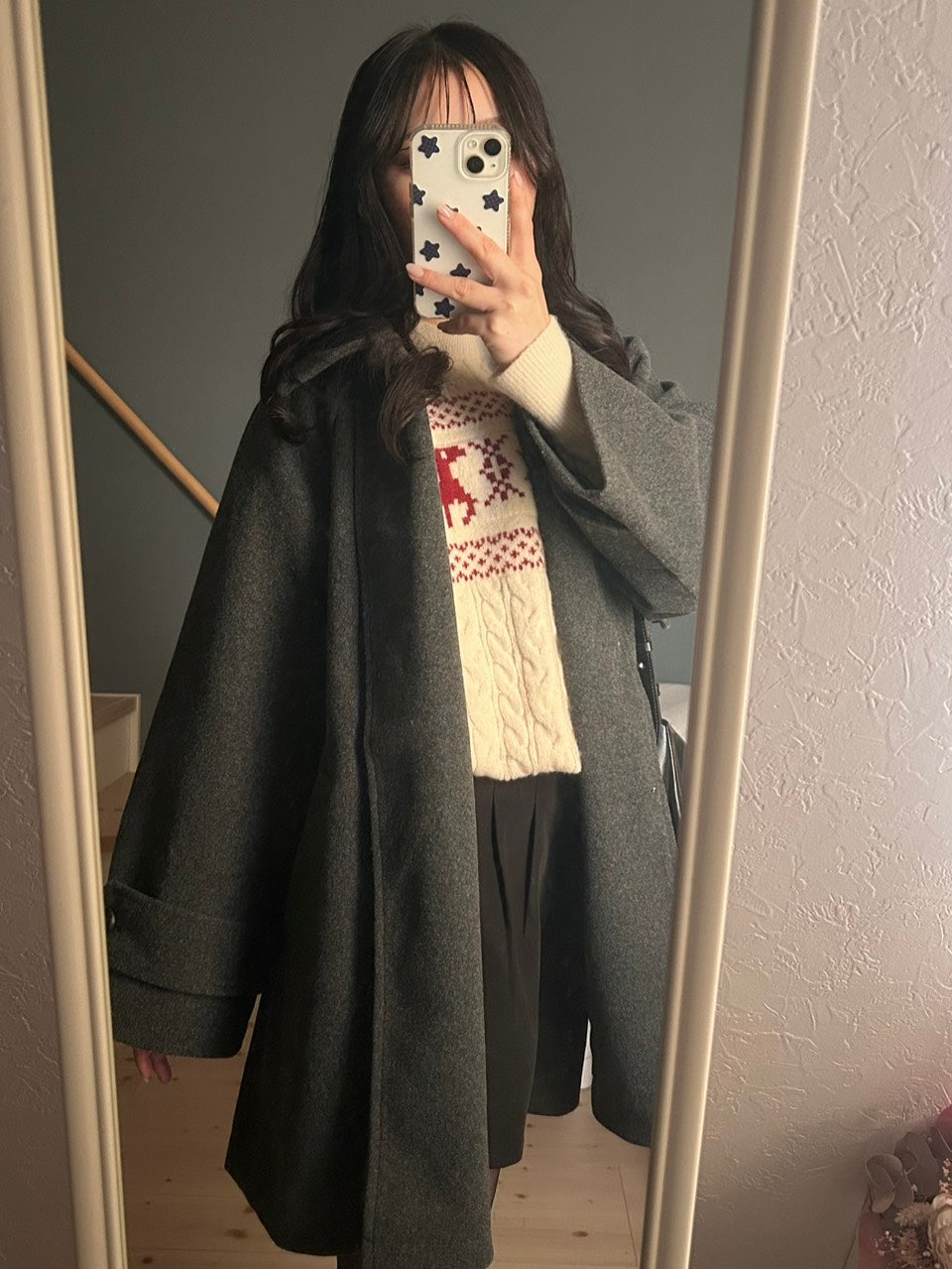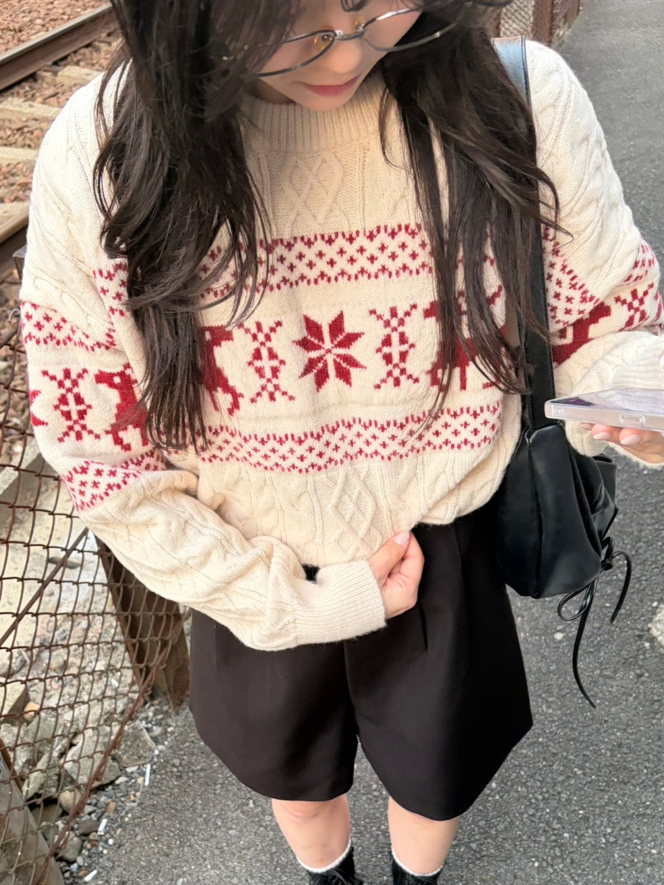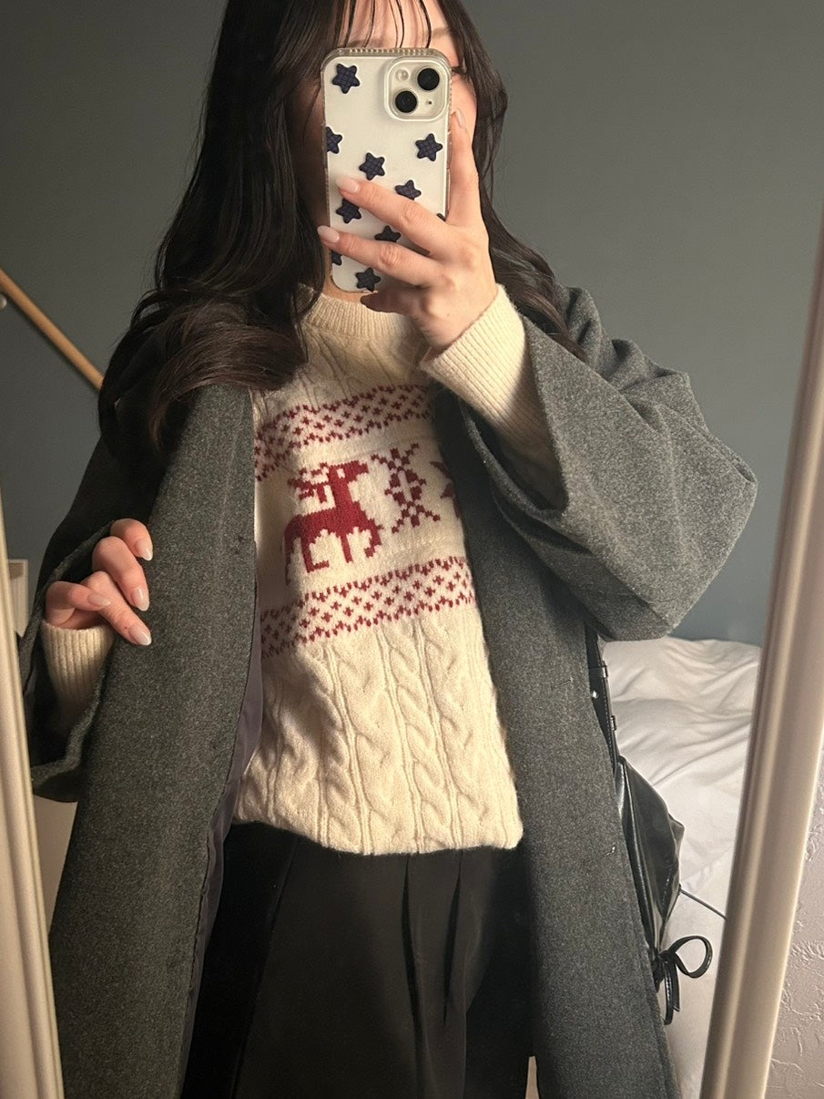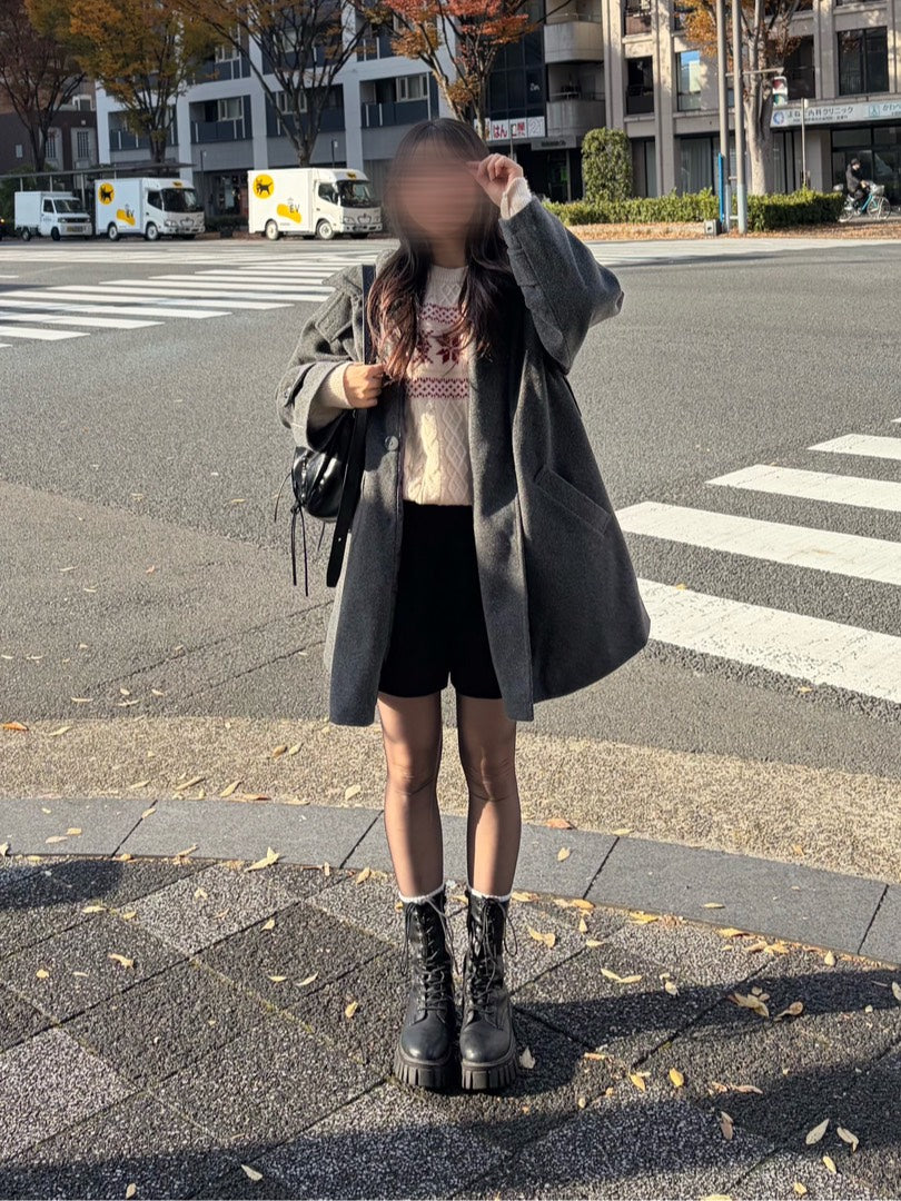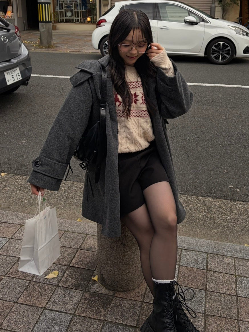 冬になると着たくなるフェアアイル柄を主役に、ショートパンツとロングブーツで甘さを程よく引き締めたホリデースタイル。ほっこりした編み柄もチャコールのオーバーコートを羽織ることで大人っぽくまとまります。柄×無地のバランスで季節感はしっかり、可愛さも抜け感も欲張ったお気に入りコーデです。