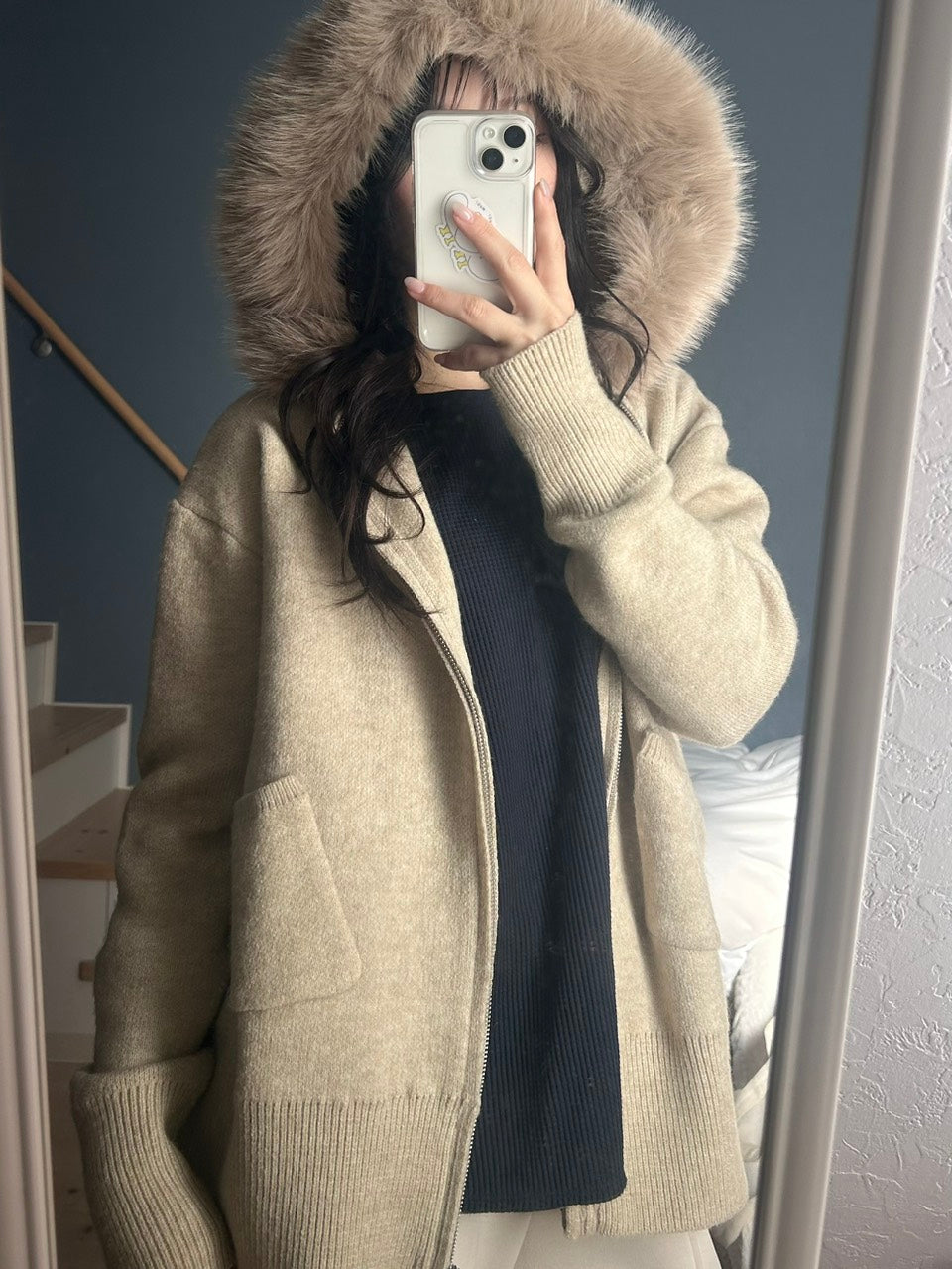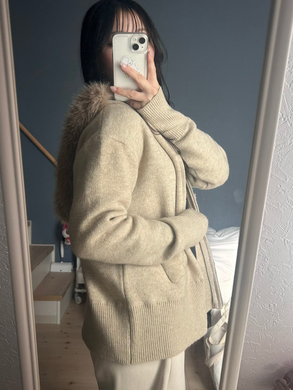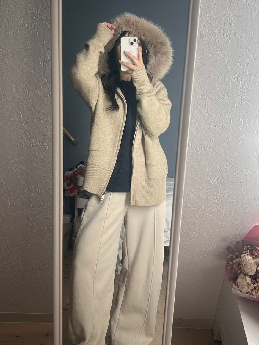ふわっとしたファーのおかげで、シンプルなワントーンでも一気に冬のムードが高まるニットパーカー。柔らかいベージュの色味が肌馴染みもよくて、今日はゆるっとワイドパンツを合わせて抜け感のあるリラックスコーデに。暖かさも可愛さも欲張れる、冬の定番にしたいお気に入りです。