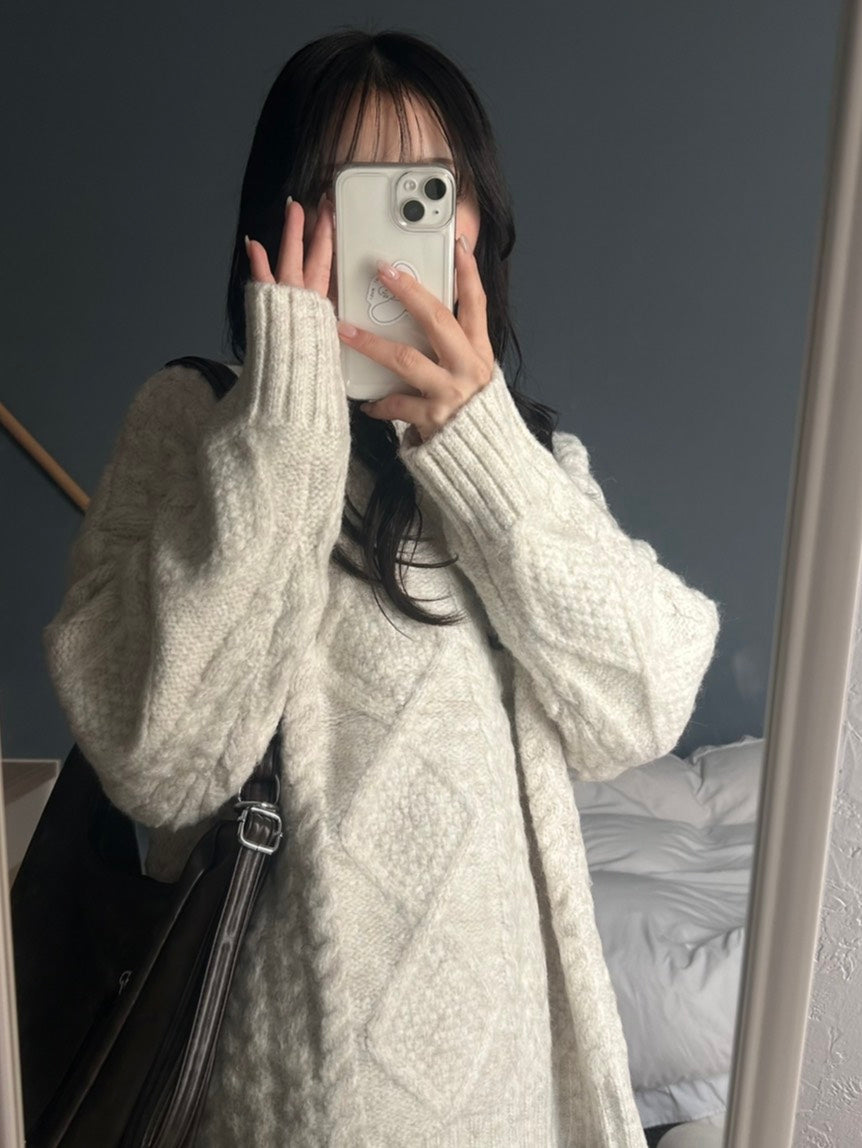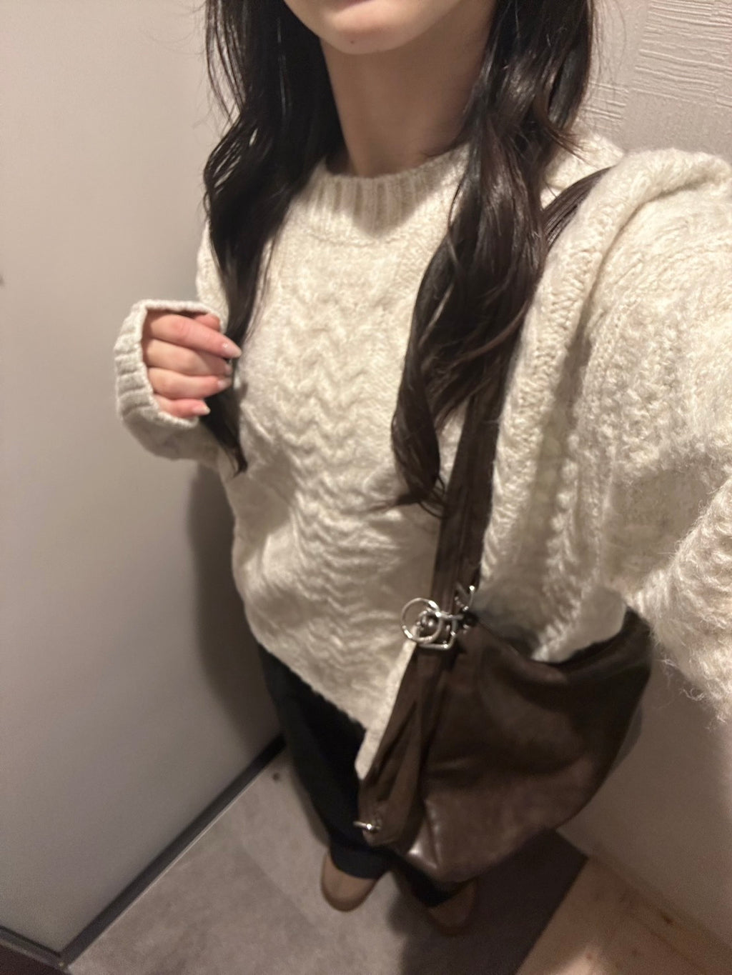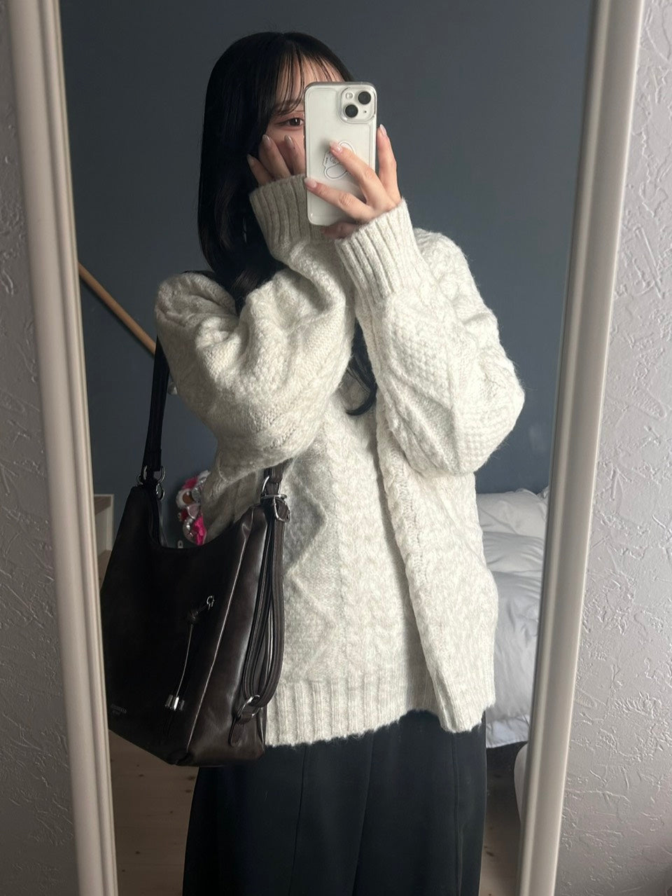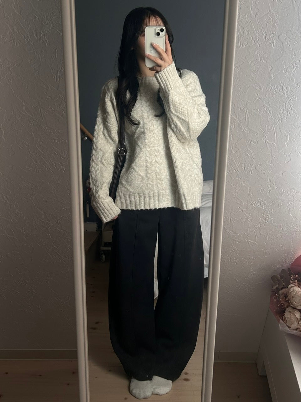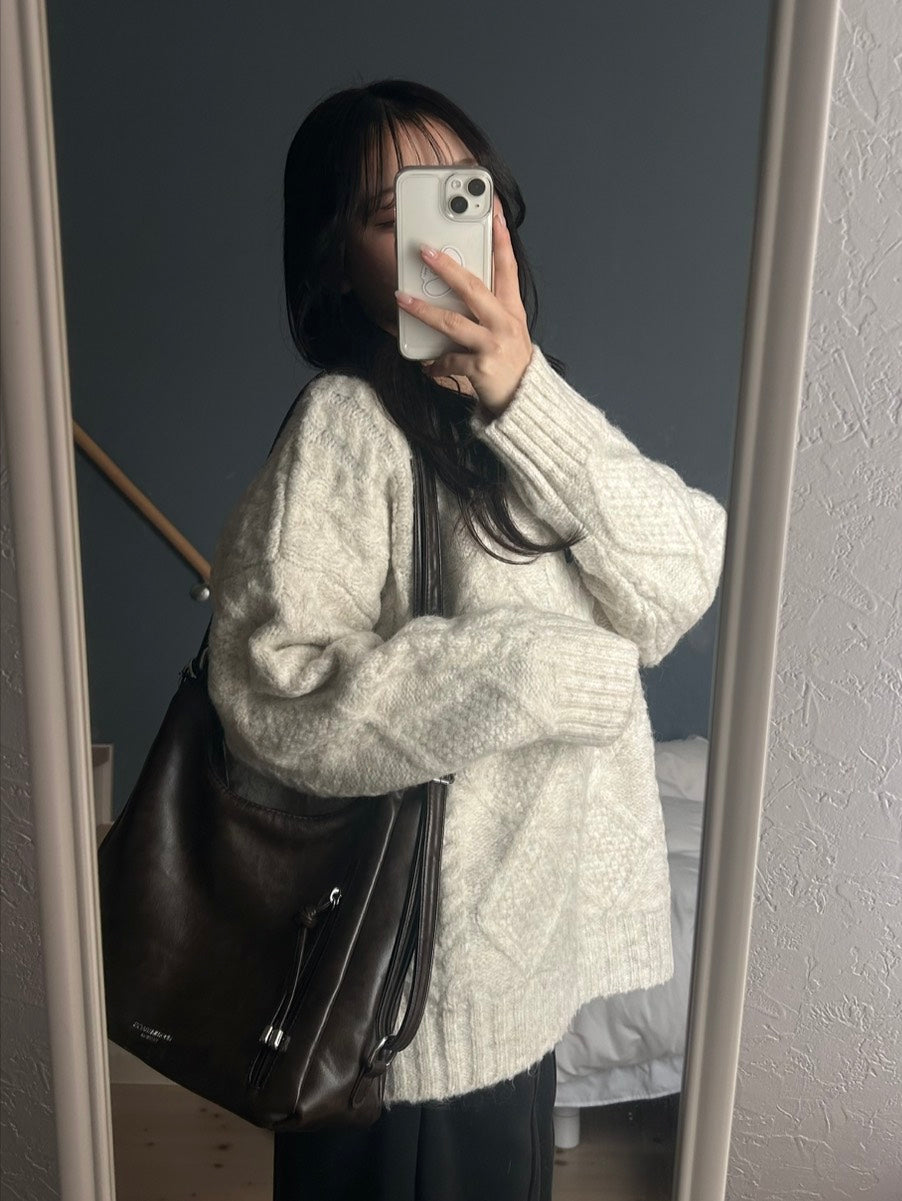 ふわっと空気を含んだモヘアタッチが冬の光にやわらかく馴染むので、あえて太めのデニムやスラックスでラフに着崩すのが好きです。白ニットでも甘くなりすぎず、シルエットで大人っぽさをキープ。重さのあるバッグやブーツを合わせて、ゆるさにメリハリをつけています。
